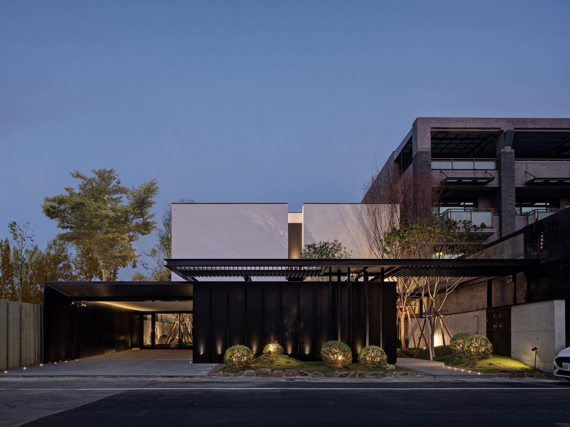 This is a single residence located in Tainan, Taiwan, which is close to the highway. The client was looking for a home away from the corporate life but still have space for people to visit her to stay. It features minimalism style with contrasting black and white cubes that creates a minor suspension effect. The steel façade extends to the outside pillars, creating a uniform aesthetic. The building's suspension and facades do not need open windows to solve the problem of the intense western sun.
