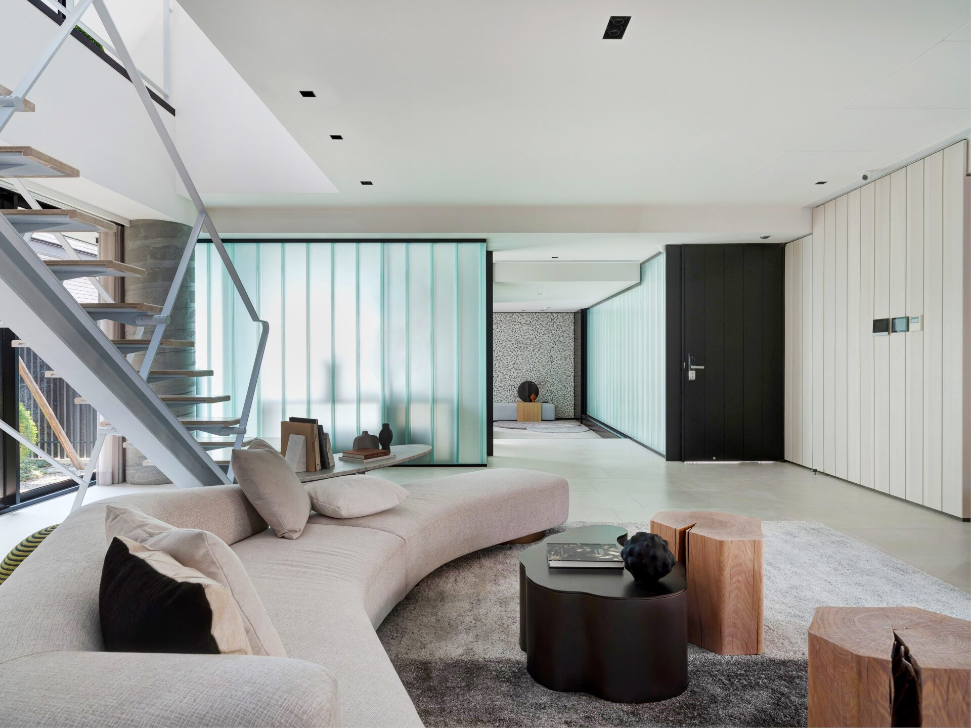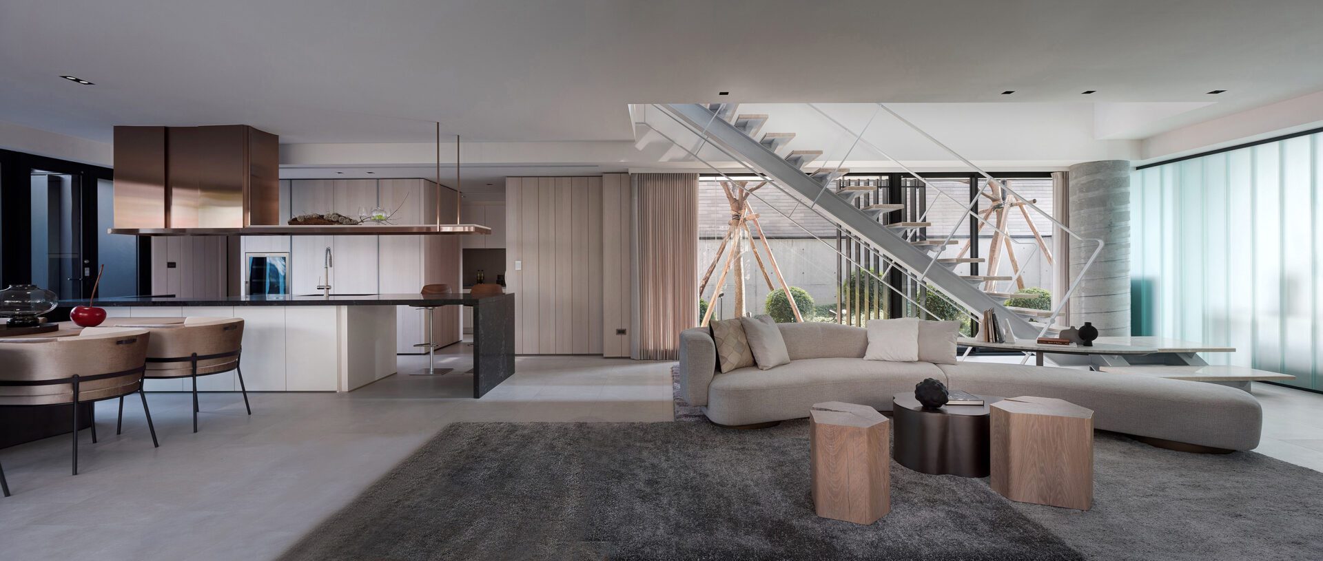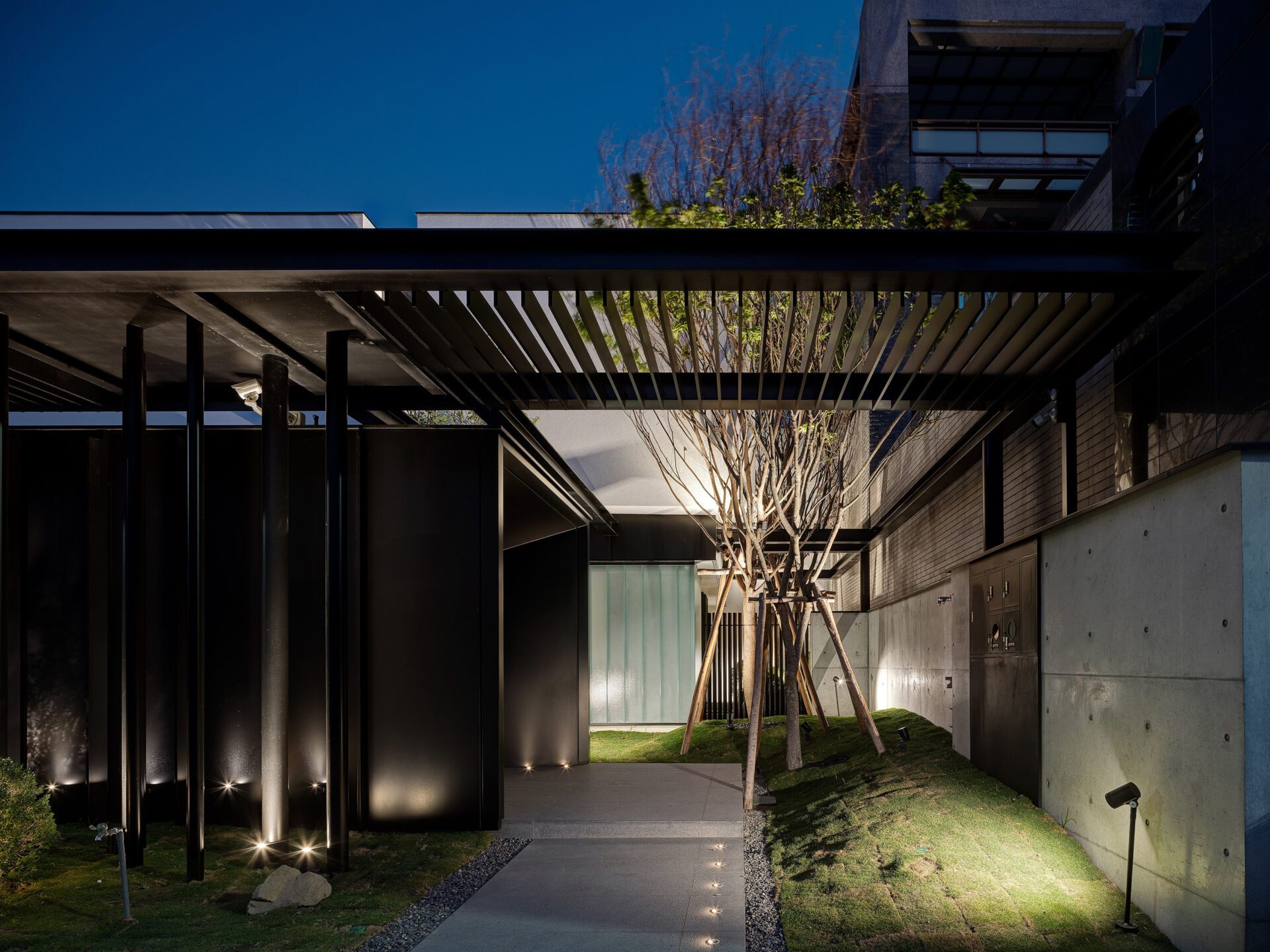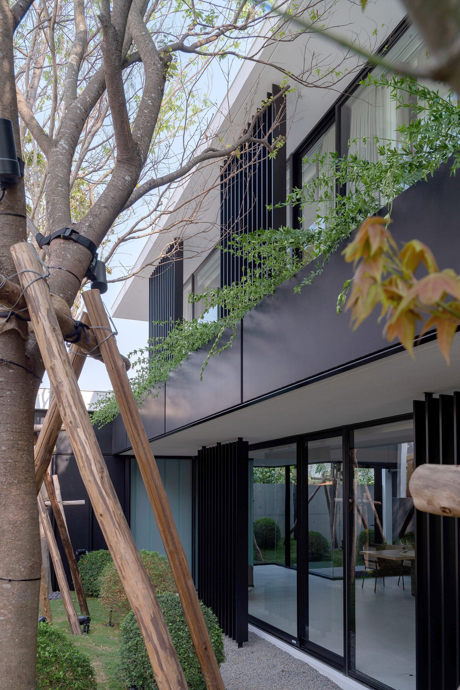 The low-density entrance of the property allows the natural landscape planting to become a part of life. A wide-open style living room is connected to a guest bathroom on the first floor. The tree species are planted in a courtyard, maintaining the ideal of species diversity and preserving the ecological environment. The living space is surrounded by a planted landscape courtyard. You will definitely enjoy the idea of living in a “forest”. The light enters the space and adds perspective using U-shaped glass as a barrier to the facade, adding a sense of privacy. The natural penetration of light and shadow over time, floor-to-ceiling windows, natural grass slope, and tree layer combine to show the movement of light and shadow. They become a part of daily life.