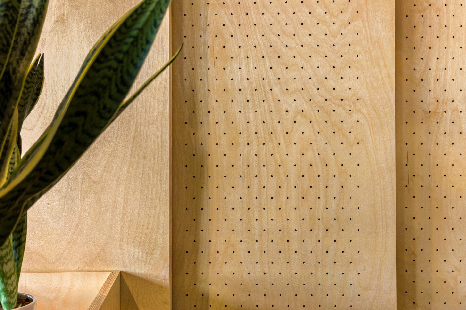 The resulting Floyd Library is a complete redesign of the headquarters model, which pays considered attention to the dynamics and needs of Floyd’s staff and makes a deliberate effort to emphasize safe, comfortable and creative cohabitation. The new Library builds on the entire original 3,200 SF floor plan, taking advantage of space made available with the upgrade of R&D facilities next door. Sharing Floyd’s values of conservation and sustainability, M1DTW worked carefully to infill the space while ensuring that virtually none of the previous construction materials were demolished or discarded. In some instances, Floyd products with slight imperfections or returned by customers were incorporated into the interior, including reused bed panels which now cover one of the Library walls and provide visual warmth and texture.