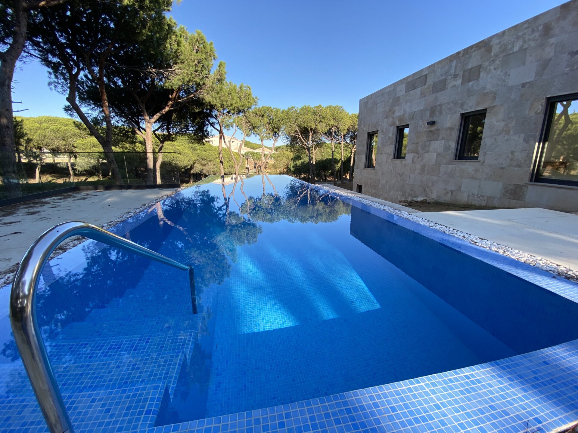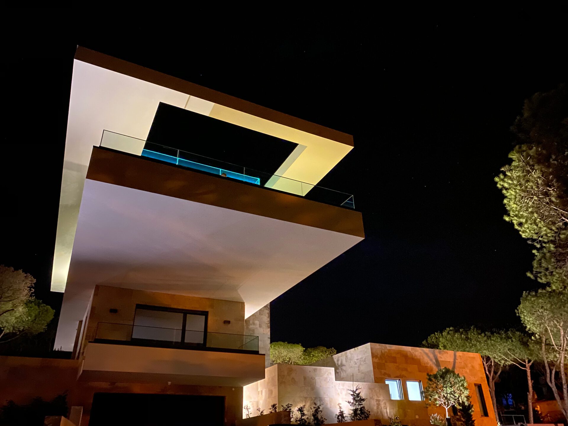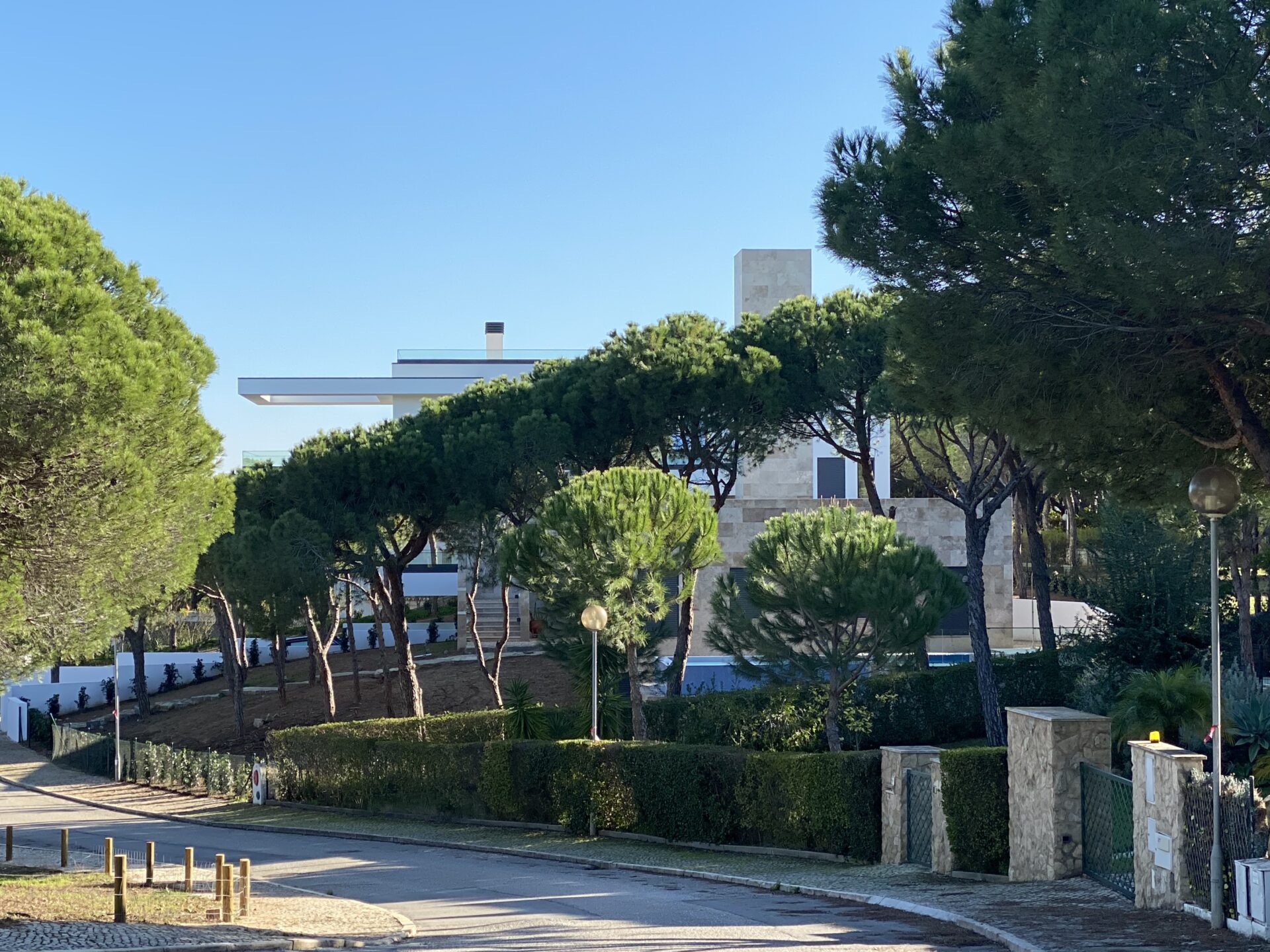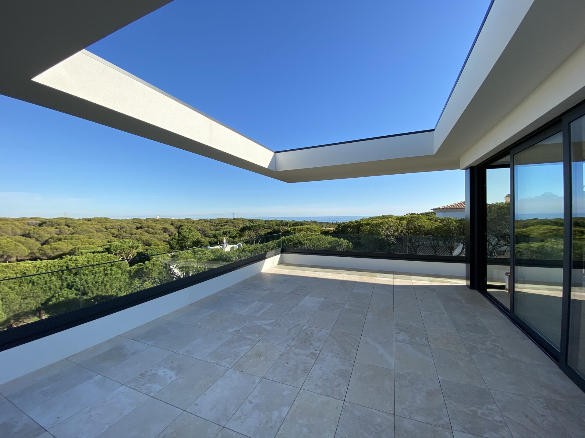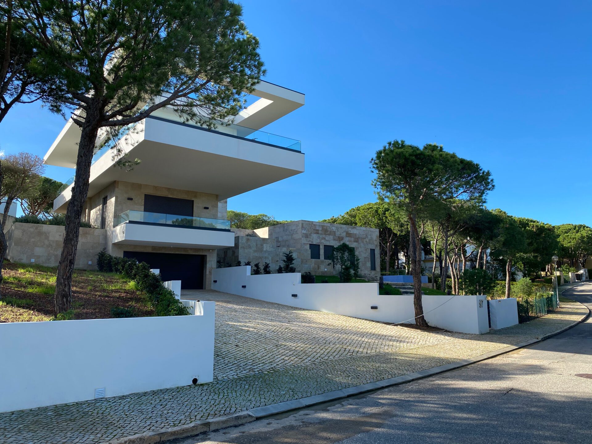 This house in Portugal is situated on a wooded hillside overlooking the Atlantic south coast. The forest surrounding the house was preserved, with only the necessary trees being removed for construction. The bedrooms are on the ground floor, providing natural shading from the trees, while the living room and kitchen are on the upper floor, allowing for natural light and views of the ocean. The outdoor area consists of a cantilever terrace and a roof terrace that do not require further clearing of the forest. The two-storey part of the building contains the master bedroom and important ancillary rooms, while the one-storey part houses the living room and two children's rooms for acoustic separation. Additionally, the house features an elevator that provides accessibility from the basement/garage level up to the roof terrace, making it convenient for people with mobility issues or those of a higher age to enjoy all the facilities. The elevator has been designed to ensure ease of use and safety, enhancing the overall livability of the house.