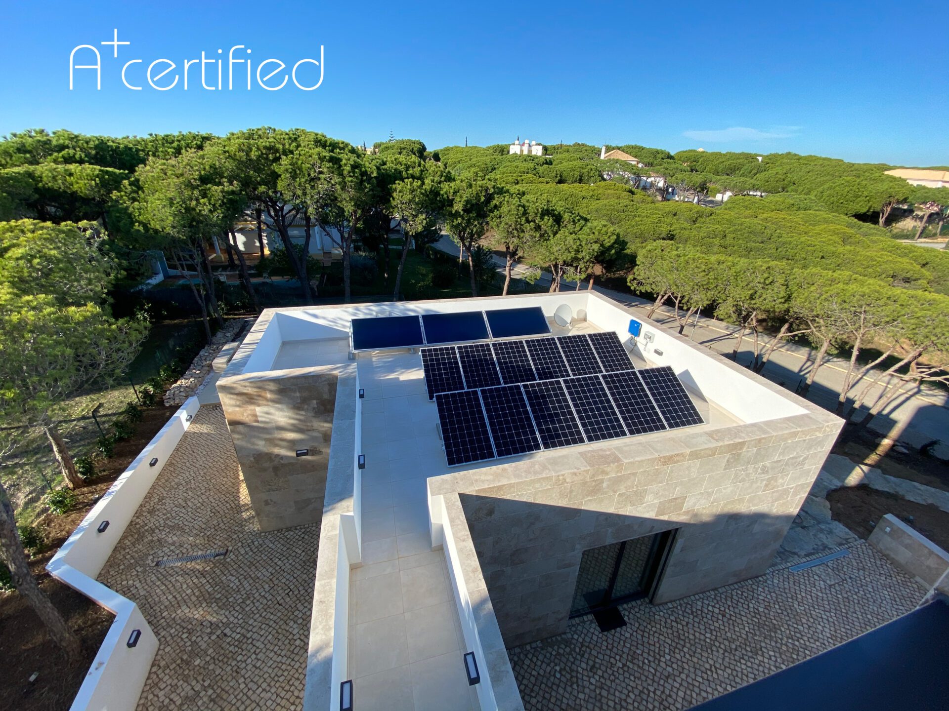 Furthermore, the house has been awarded the A+ certification for its sustainable construction and technology. The building's technical equipment has been optimized to reduce its carbon footprint, making it an environmentally-friendly and energy-efficient home. Additionally, the photovoltaic system and thermal solar panels provide renewable energy, contributing to the overall sustainability of the house. All in all, this house should be a perfect example of how modern technology and eco-friendly practices can be combined to create a comfortable, sustainable, and accessible living space.