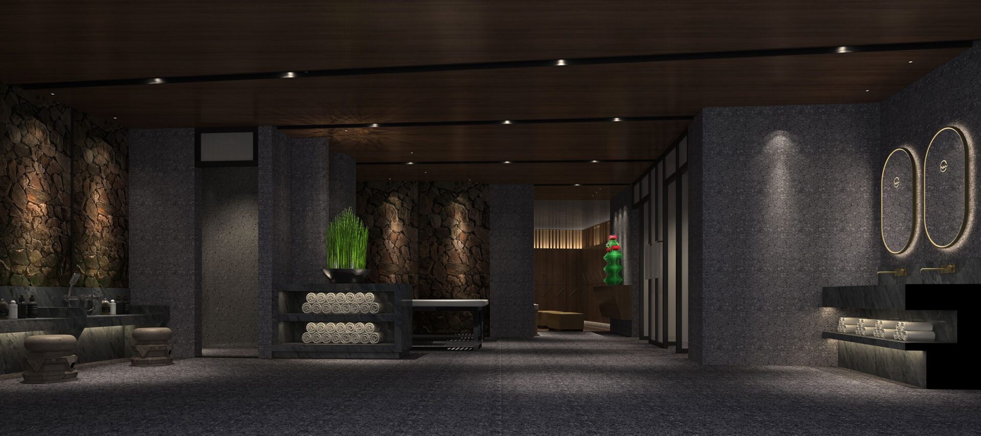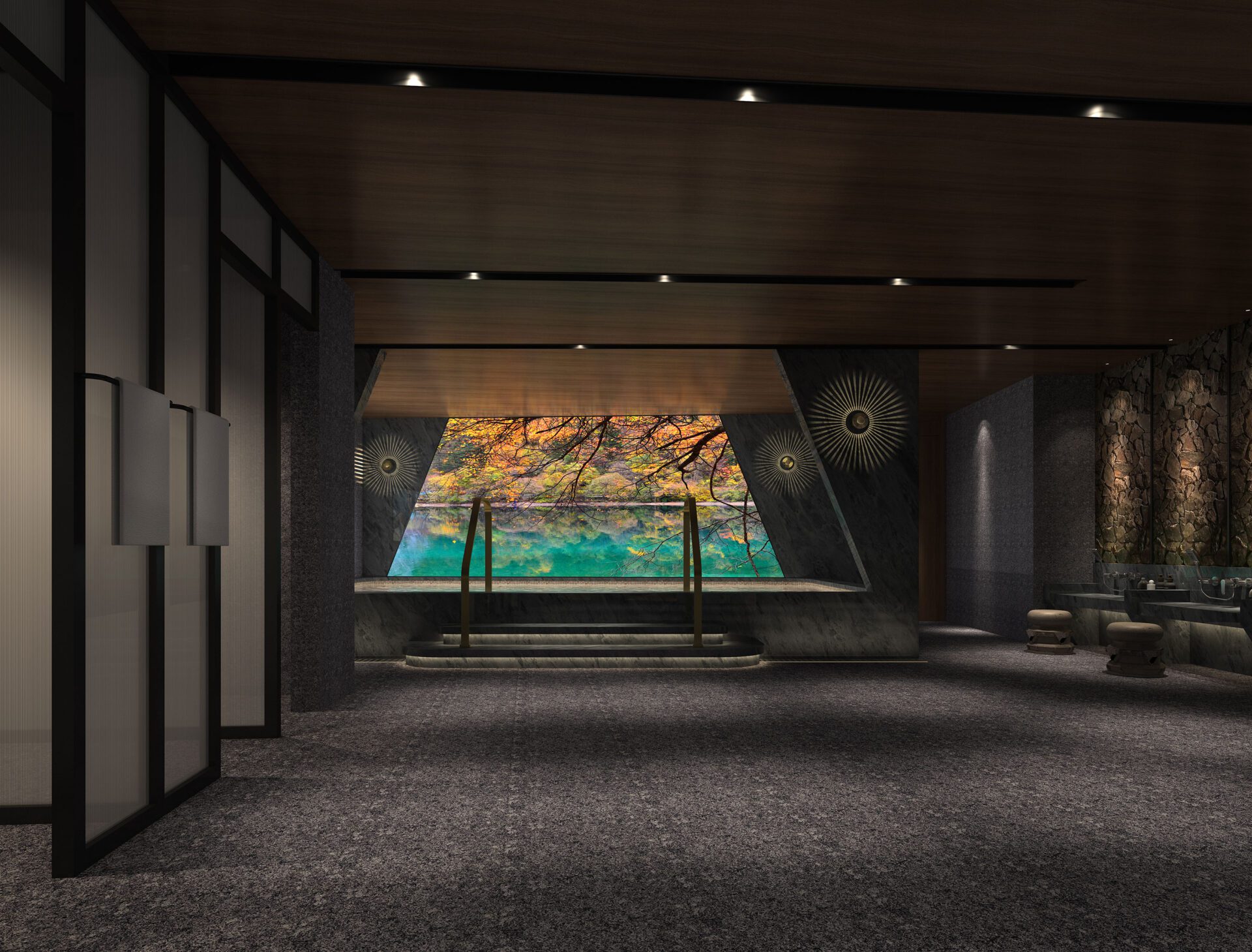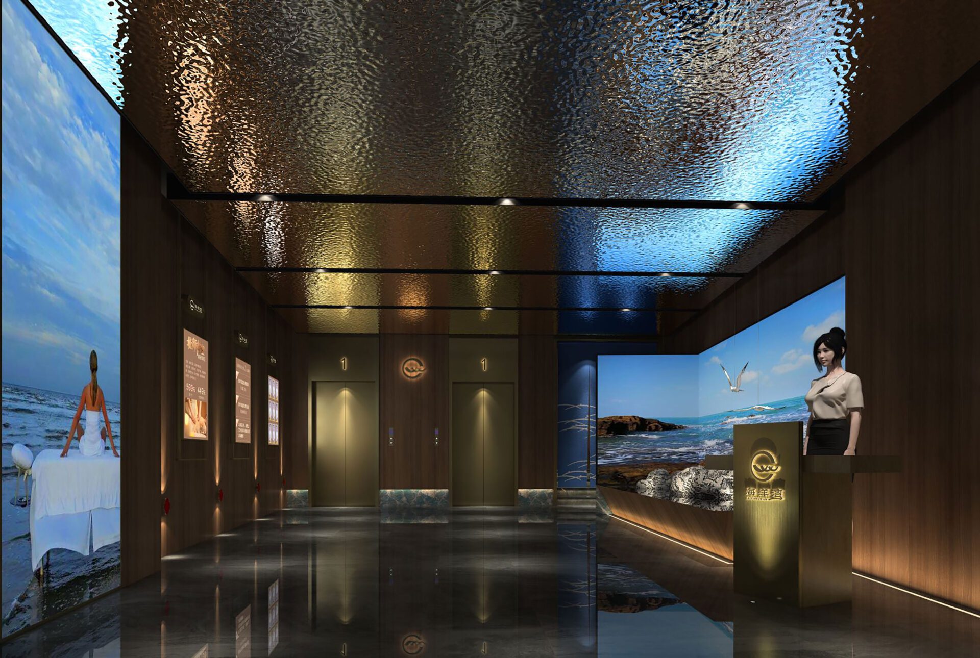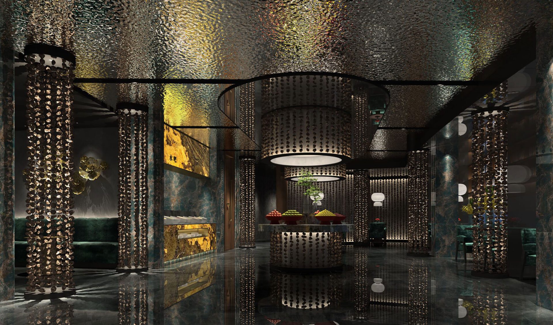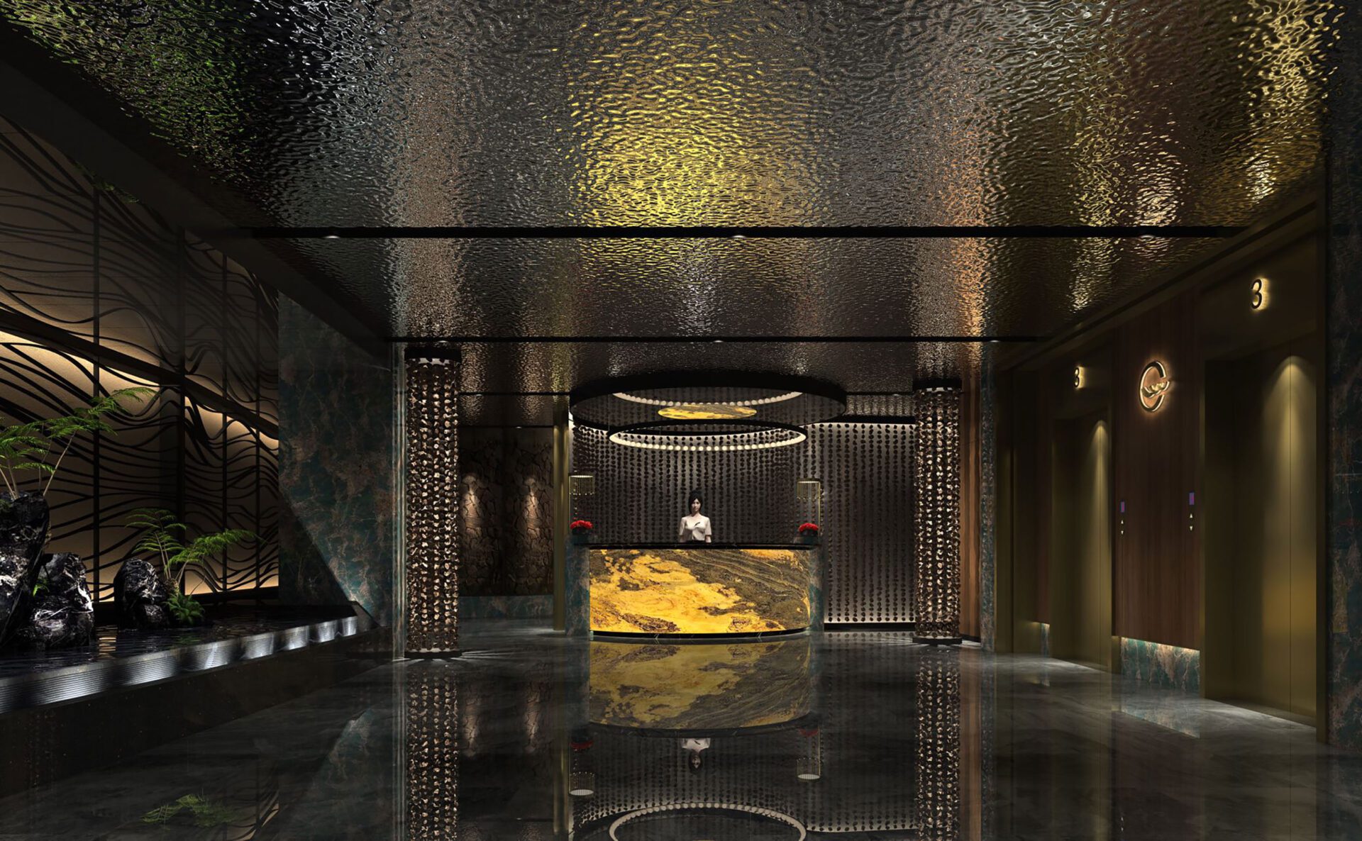 The stainless steel ceiling with hammered patterns suspends over the reception counter, resembling the night view of the sea. The space is embellished by an appropriate lighting atmosphere, where the slight reflections are like twinkling stars above the peaceful sea and quiet waves, arousing visitors’ emotions and perceptions. The series of volcanic stones become vivid against the mottled light.