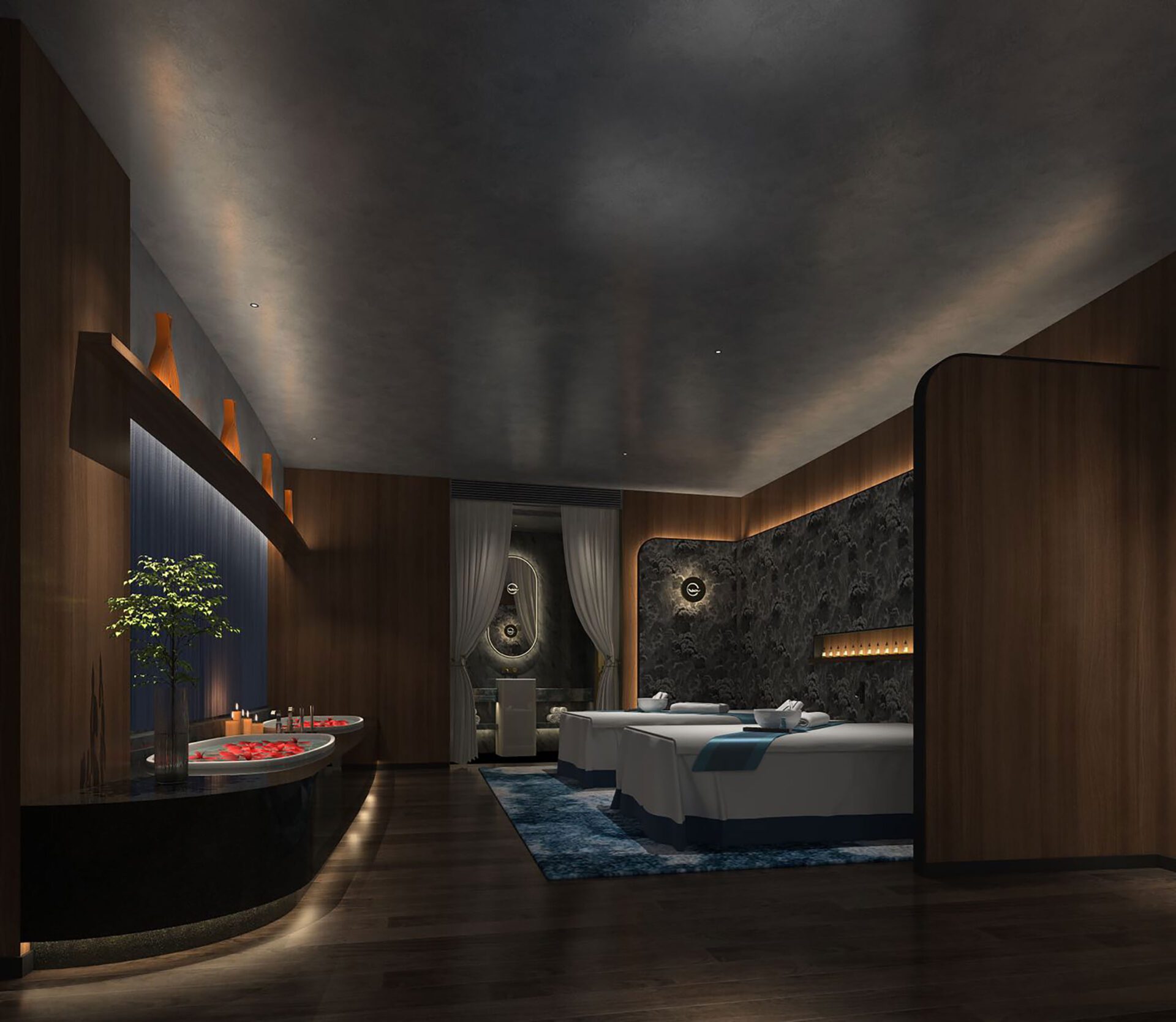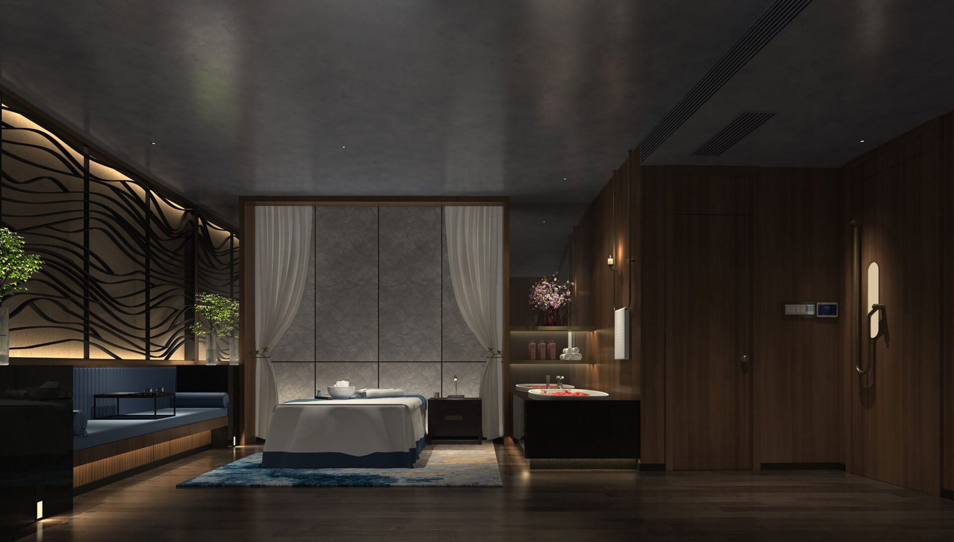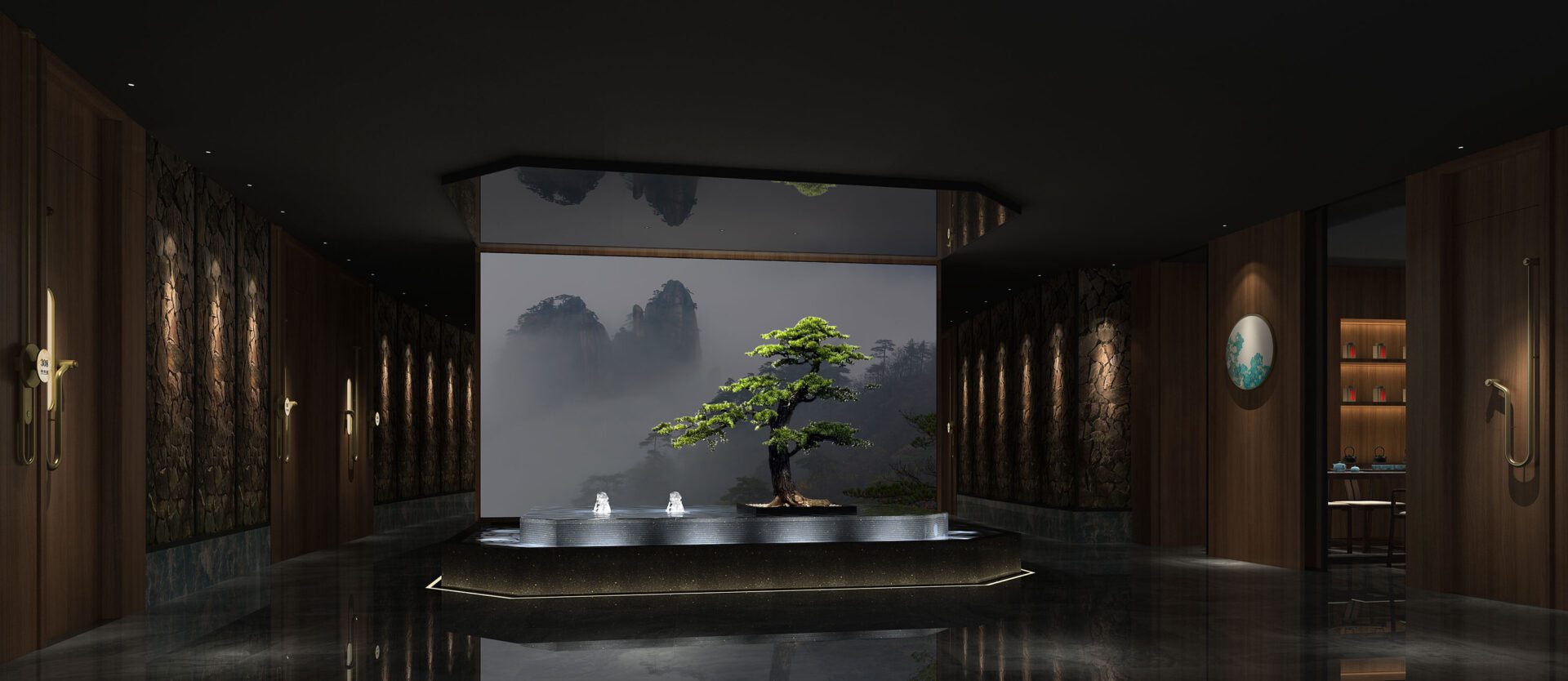 The linear decorations of the facade and curtain as well as local lighting guide the guests to their doorway respectively. The light is vaguely scattered, like "the moonlight covered by the mist". As implicit and vague natural metaphors, the design creates a relaxed atmosphere that is just right to leave a blank canvas for the visitors to perceive and organize the surge of emotions.