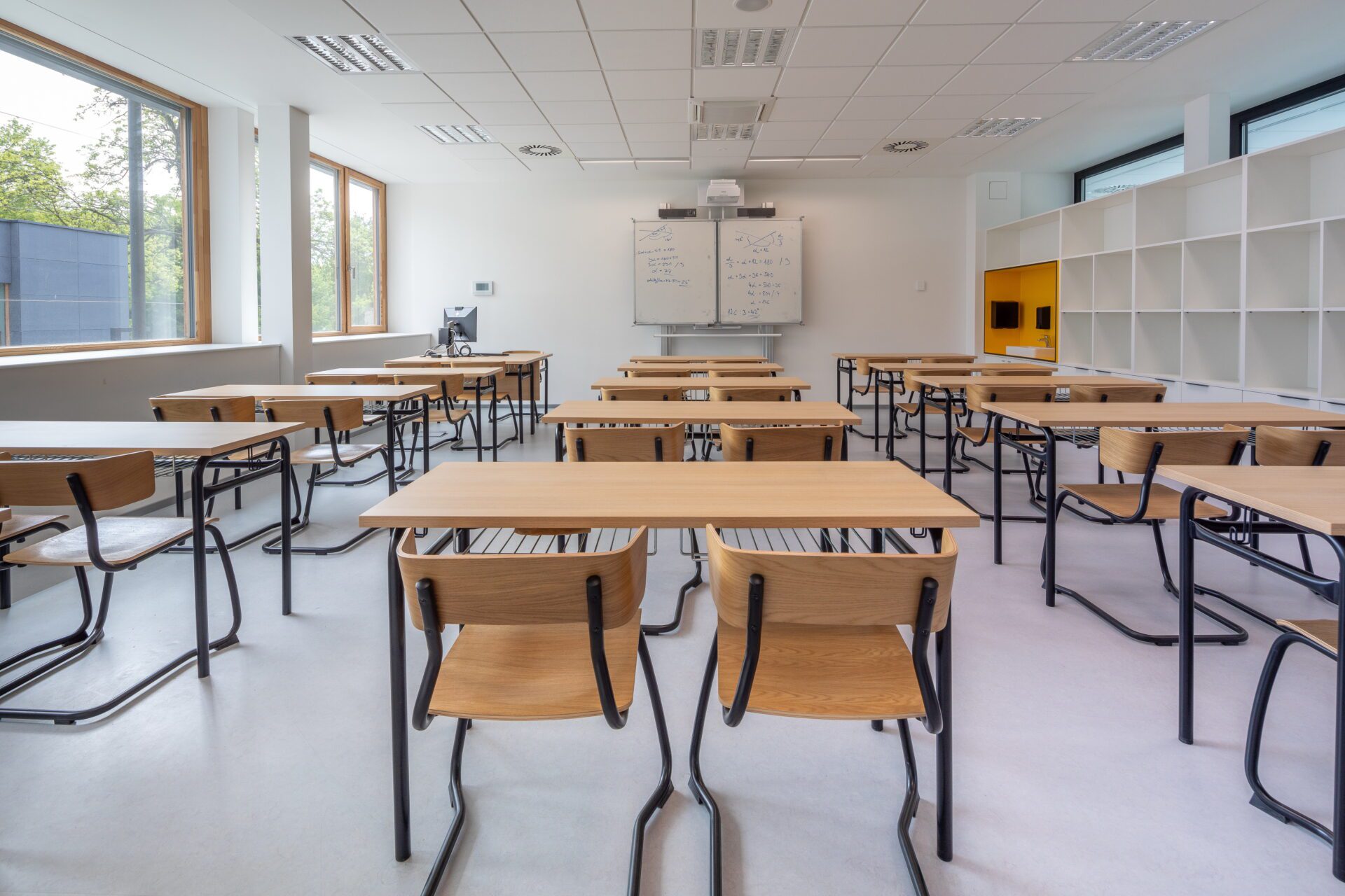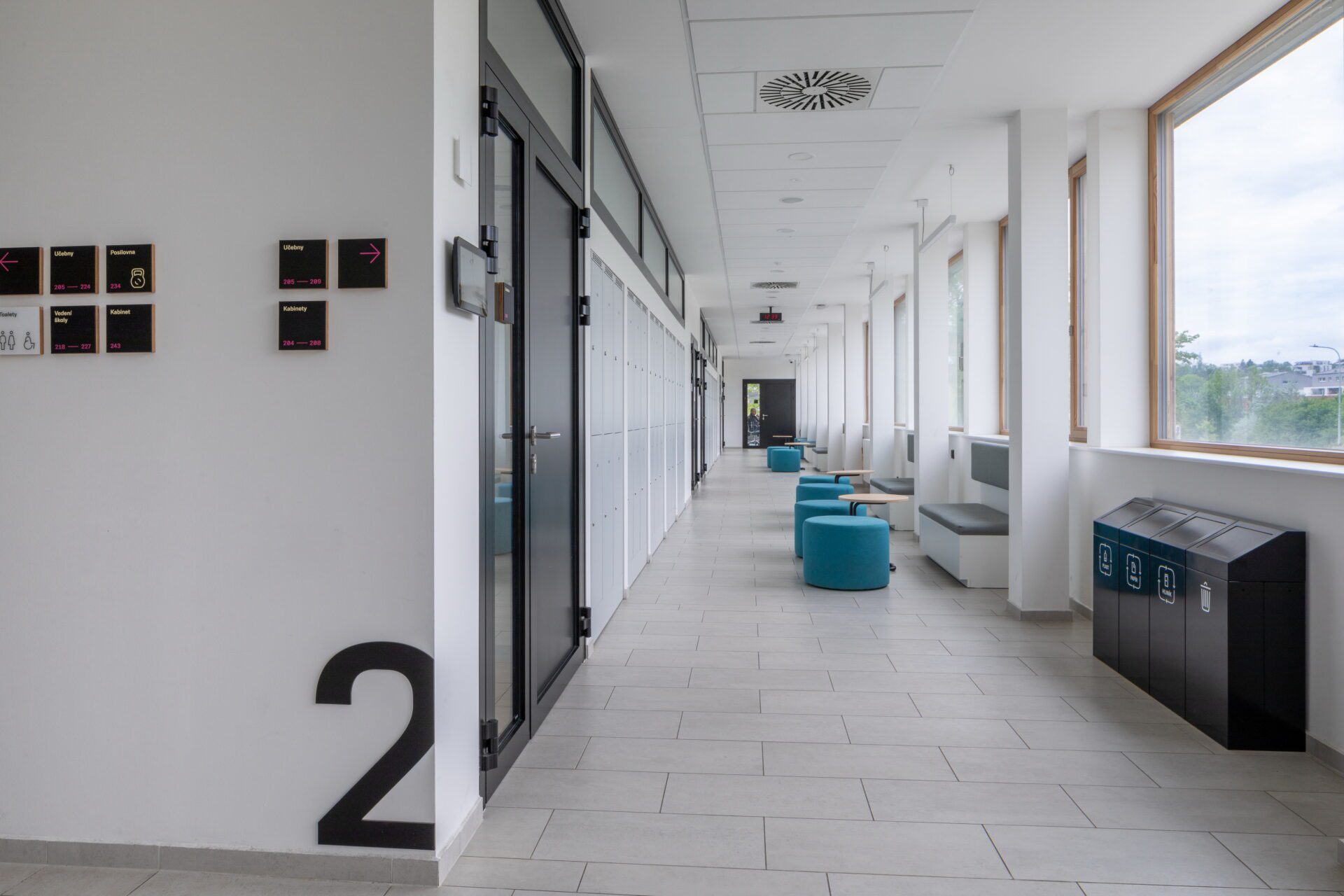 The originally intricate layout maze has been replaced by a clear layout that respects the specific requirements of all educational disciplines. Moreover, the new school premises are versatile, allowing the institution to adapt to the future requirements of modern education. Generous, well-arranged corridors represent the basic backbone of the building as well as the meeting place. The fresh open style is enhanced by vistas into greenery and by the new outdoor living atrium, into which the common areas and some teaching spaces face. The atrium transitions into outdoor spaces for alternative outdoor teaching, as well as for active students‘ relaxation. The color accents of the warm yellow classrooms, dark blue cabinets and school management are easily identifiable. In contrast, locksmith constructions, doors and small accessories are executed in black, including a unique orientation system. The building and its immediate surroundings thus work in a pleasant symbiosis that aims to positively motivate regular users and visitors.