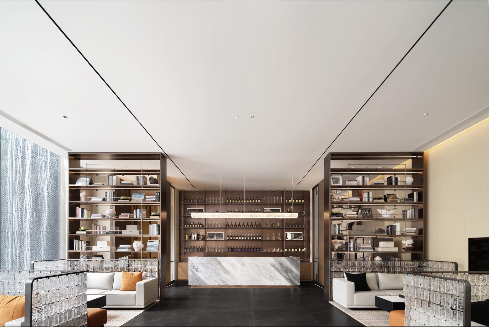 The water-light corridor gives the minimalist space a lot of white space, where poetic aesthetics of the East grows. Water lights are specially added in this area to reflect the dynamic space through the flowing light and shadow effect. The courtyard, where the water gurgles, expands the spatial Zen. The contrast of black and white materials, primitive and clear, subtly melts into the soft gray space, forming a prominent visual center. Amid the softness of gurgling water and flowing artistic conception of emptiness and reality, one walks in the corridor as if walking into the picture scroll of oriental charm.