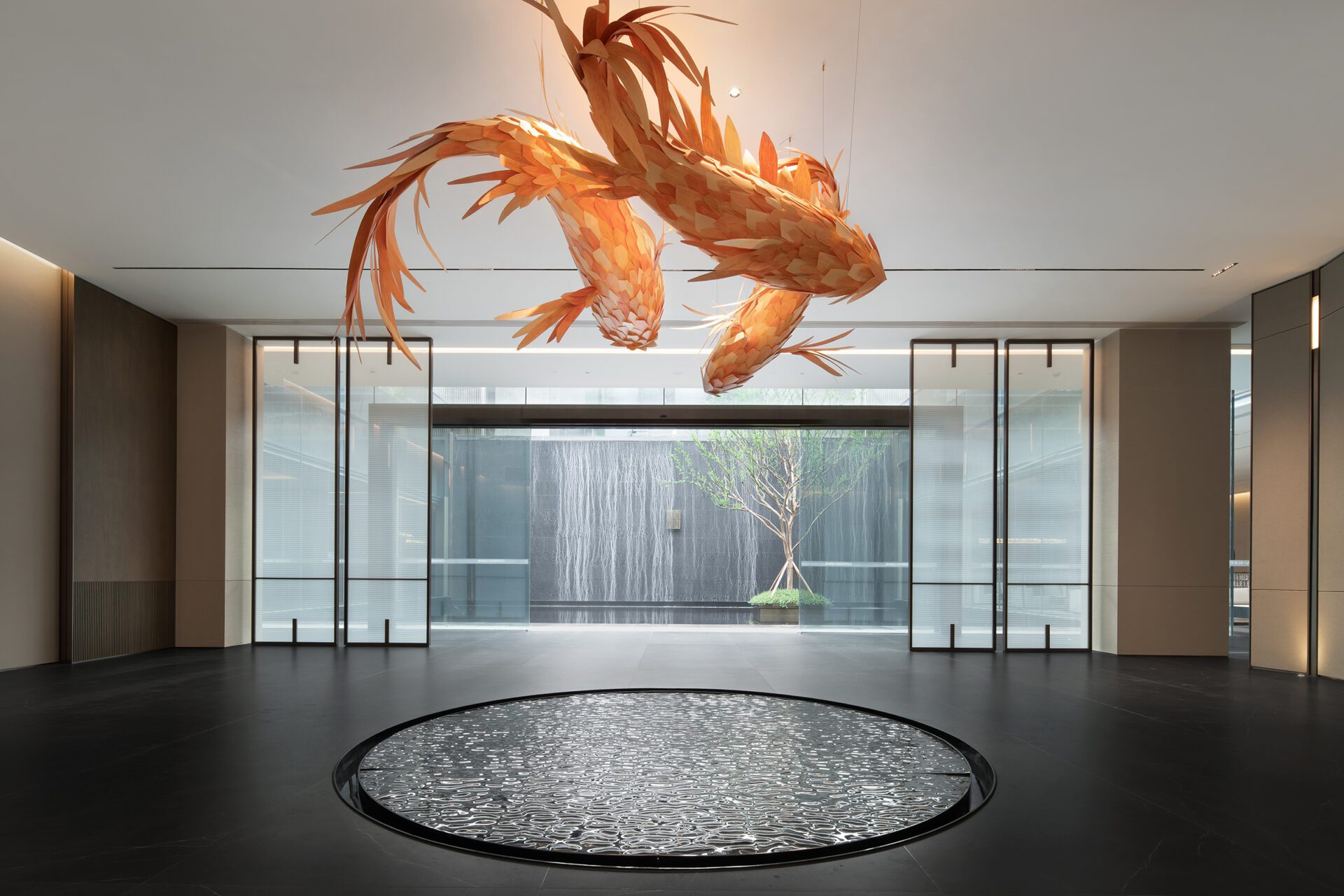 Down the stairs is the interior courtyard, surrounded by functional blocks, a place for artistic growth, where the ground is rippling with water, and the floating art installations are illuminated by light and shadow, as if the concept of “water begetting all things for everything to grow” was taking shape in the space of humanity and landscapes.