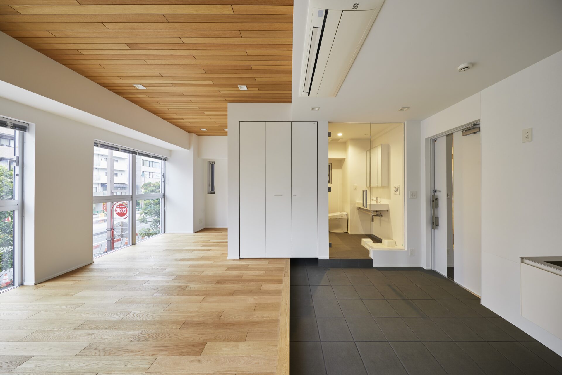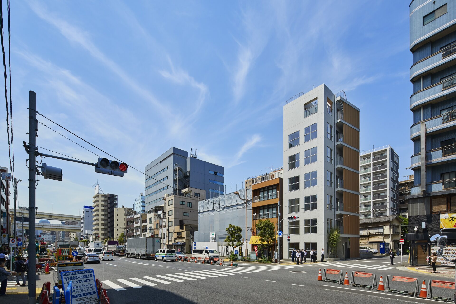 This is a project for rebuilding a small residential building in a small site of Tokyo *Kiba. For adaptation of the various lifestyles and improving the added value of the building, we designed multiple spaces by using exceptional cases of maisonnette style housing to the building standard law. Also, we attempted to put the building in harmony with the historic site of Edo Tokyo Kiba which was known for lumber dealings. We designed three different types of housings, namely a residence for one person, a couple and a family with children in a single building. Even though the size of the building is small, the different types of housings are being together, therefore constructed the fine community of a residence in a city. The façade of the building consists of two elements. A design of the grid windows and sashes comes from the Japanese traditional latticework. The wooden louver reminds us of the original landscape of Kiba which was the lumber leaned against the entrance of a lumber retail shop vertically. We try to make new values and new lifestyles by the inside, and to show historical and cultural heritage by the outside. *Kiba: The name of a place. "Ki" means wood, and "ba" means town.