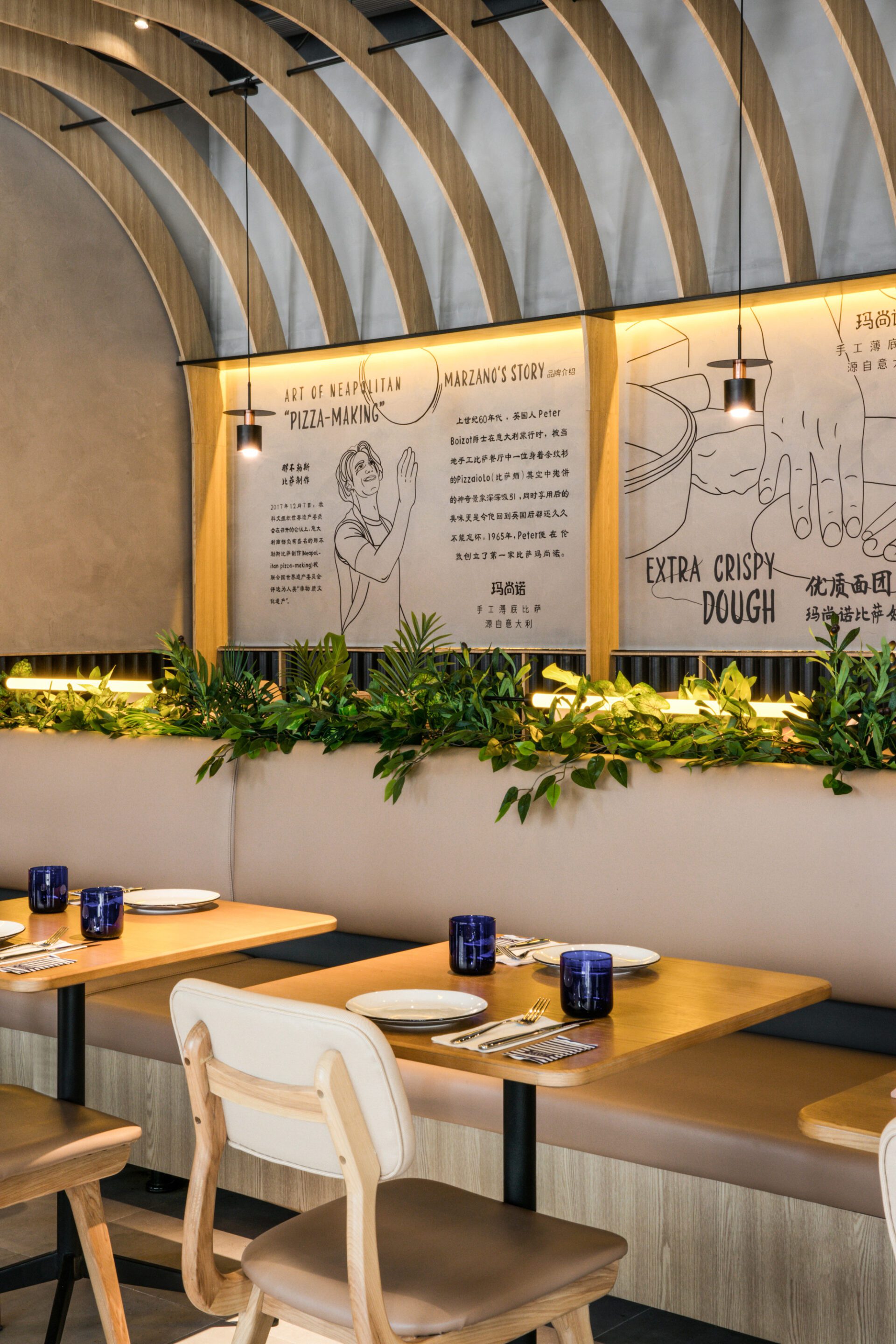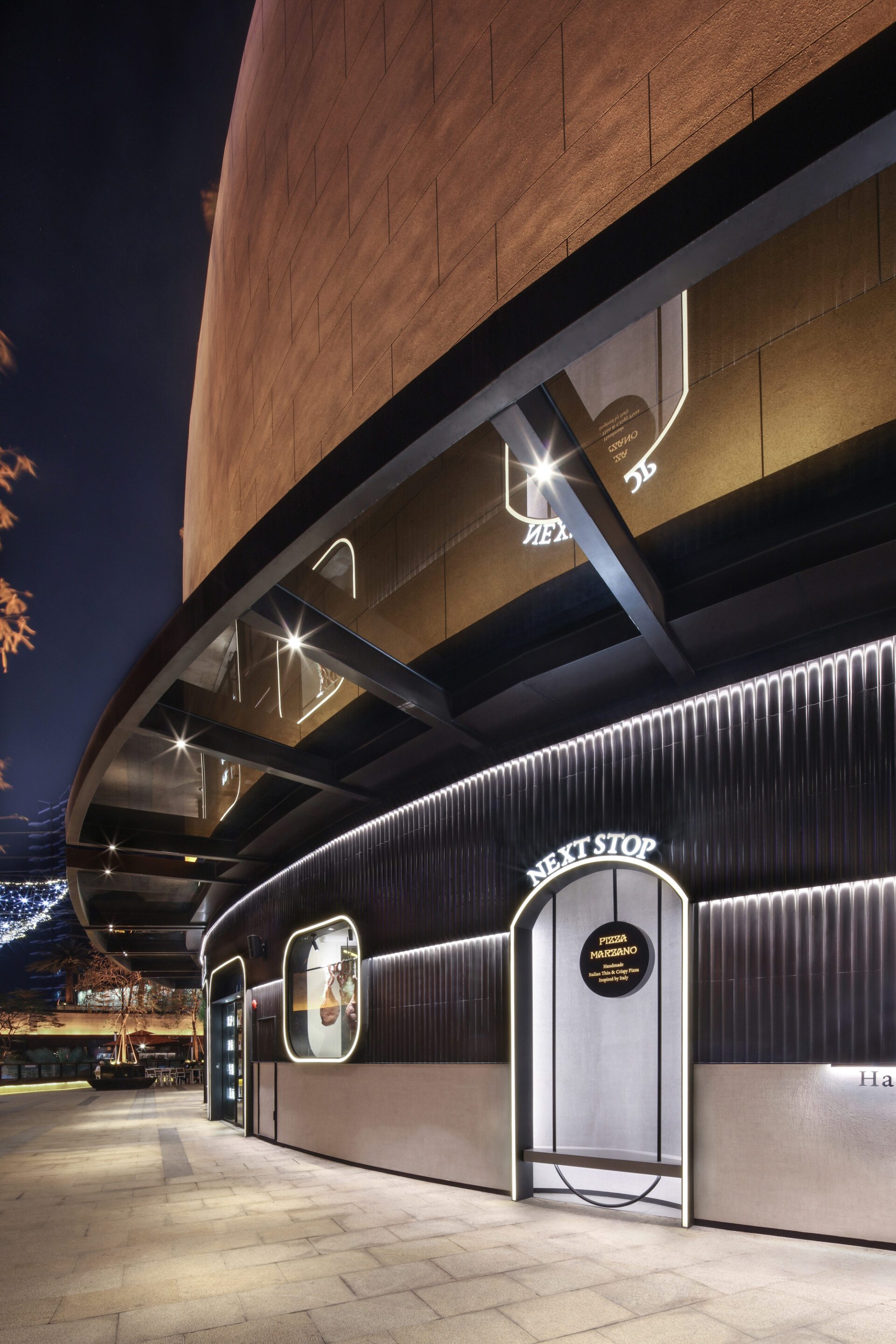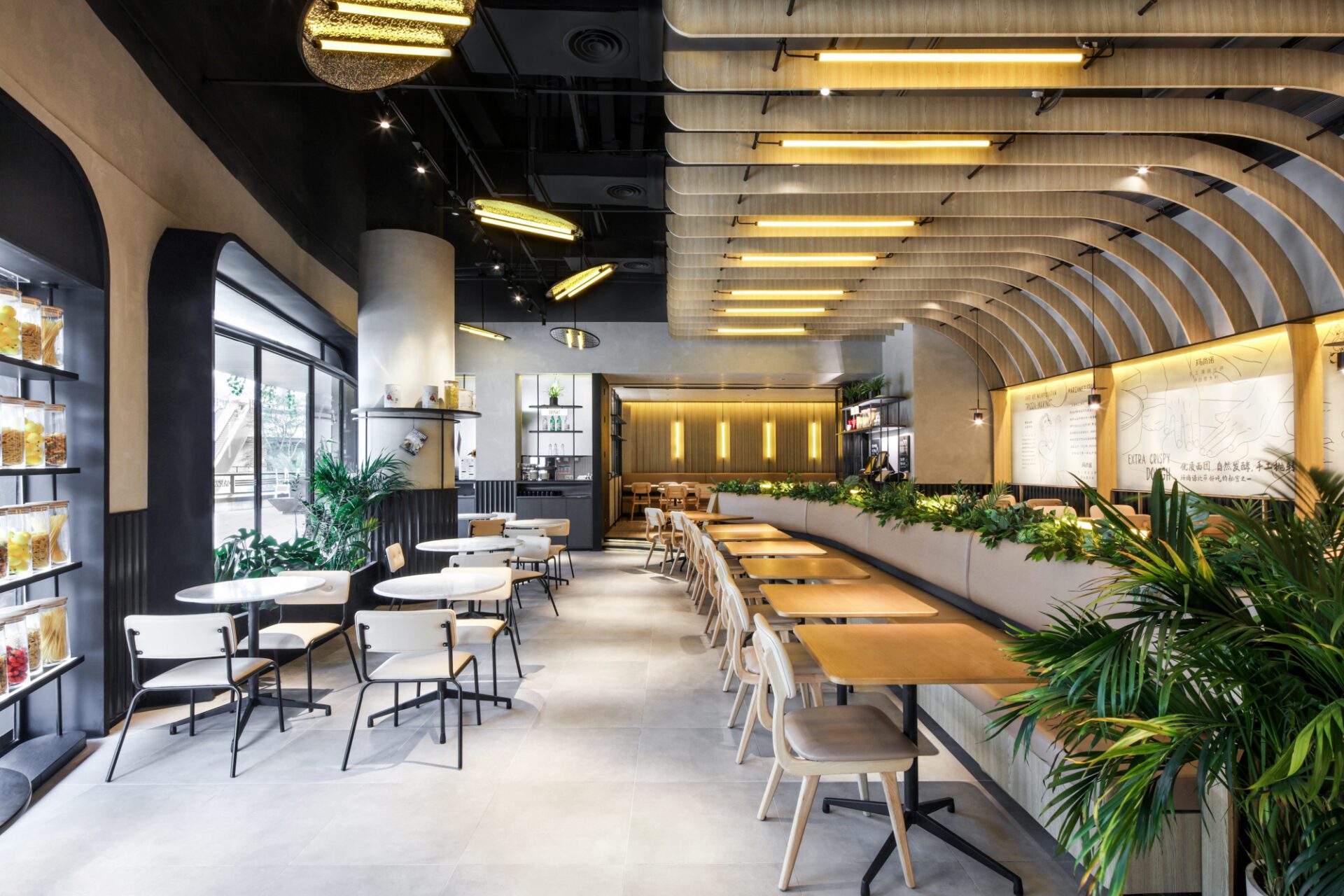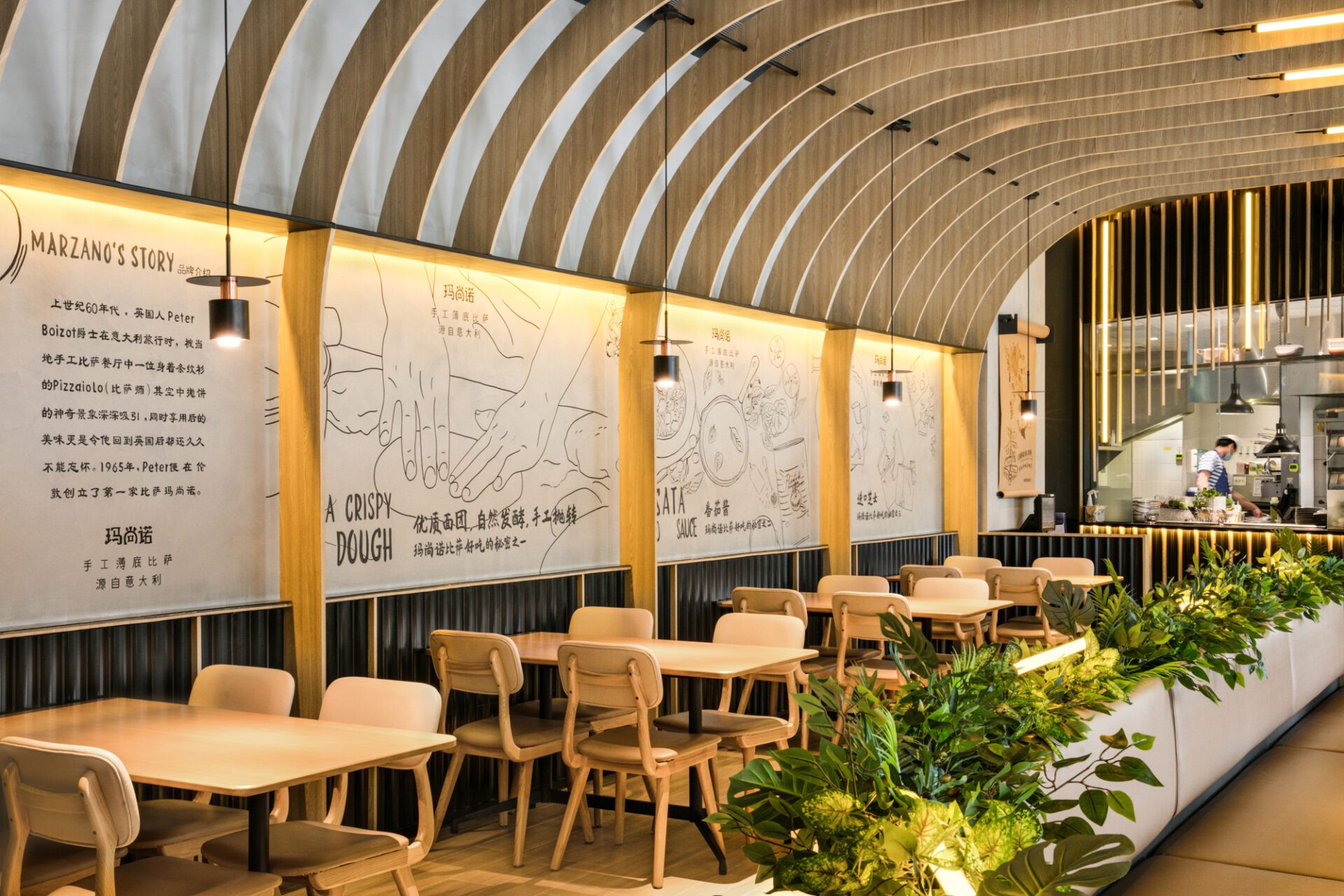 JYDP was invited by to design Pizza Marzano’s first re-inventing, golden black line - Marzano, to rejuvenate the interior located in a brand new commercial plaza in Guangzhou. Since its establishment by Sir Peter Boizot in 1965, London, Pizza Marzano has opened 59 restaurants in mainland China after its first store commenced in 2006. Base on the understanding of Pizza Marzano's brand development and consumes’ demand for dining experience, Marzano's interior design pays more attention to the diversified sense of space and dining atmosphere in a day brought by different lighting applications. Meanwhile, by blurring the boundaries of the indoor and outdoor, the space was designed to accommodate all-day dining experience and to enrich visual enjoyments and the overall atmosphere. The extension of the total-design language from the outside to the inside constitutes a coherent space atmosphere. Possessing an area of 250 sqm, the site was equipped with 38-meter-long arc-shaped facade, and 7.3 meter indoor ceiling height. The client envision the restaurant to be an all-day dining, paying tribute to depth, friendly and comfortable connections, while break the boundaries between interior and exterior to attract patrons.The unique site has become both a design feature and a challenge. In order to make the 38-meter facade transparent and relatively hidden amongst the building columns and fire-fighting facilities, starting from the left side, a continuous arch shape is used to form open spaces such as bar counters, entrances, rest areas, and display windows. Utilizing the enclosed facade of the kitchen area, the overall shape is continued, forming a photo-taking spot and a brand advertising wall. The entire façade is divided into 3 levels vertically, using tailor-made curved bricks and texture paint to generate a sharp color contrast. The hidden light strips and the light on the arches pop out the shape of the façade at night, a sense of layering is born under the texture of urban landscape.In thinking about the division of interior space, the designer has associated different functional areas with the facade according to the unique site conditions, and at the same time distinguished the opening type of the facade and the interactive direction of the circulation, so as to break the boundaries between indoor and outdoor. In this way, the plan not only cleverly caters to the narrow space, but also meets the demands for various functions and circulation. The designer divides two highly scattered areas to present customers with different dining experience, and solve the alienation caused by the high ceiling of the space to create a warm and comfortable ambiance.Combining the sense of industry with modern design language, the design divides two dining space in the relatively narrow and long interior. The background wall corresponding to the curved glass facade is regularly arranged with a wooden arched structure extending from the wall to the ceiling, and orange lamps are added to form the overall shape of the central dining area.The window seats are planned for the afternoon tea, echoed by the customized chandelier hanging irregularly on the ceiling. The open kitchen on the right of the restaurant also uses vertical wooden structure and light tubs as elements to connect to the wall design of the multifunctional room at the other end. The overall space uses the exterior facade materials to the interior, and is equipped with different areas and different lighting methods to make the overall space coherent and create a warm and delicate dining environment. Marzano is a brand new interior space designed by JYDP for Pizza Marzano, which applies to the site conditions. Breaking the circulation of the indoor and outdoor boundaries, the warm and comfortable atmosphere with a sense of hierarchy, together with the modern design language of industrial style has been introduced to provide a good place for catering, leisure for the city consumers.