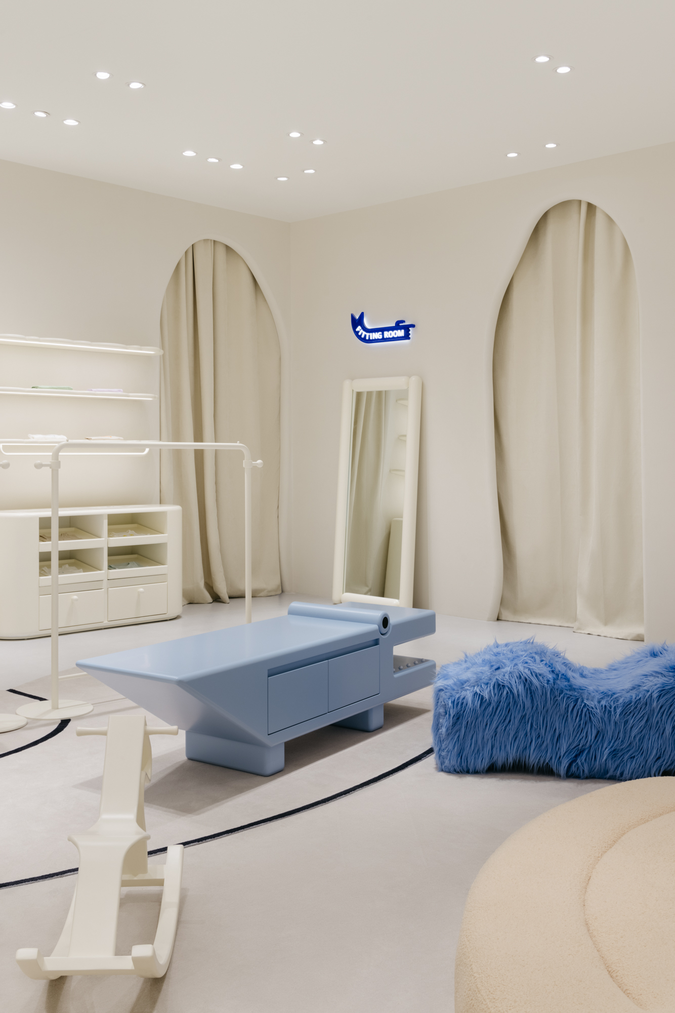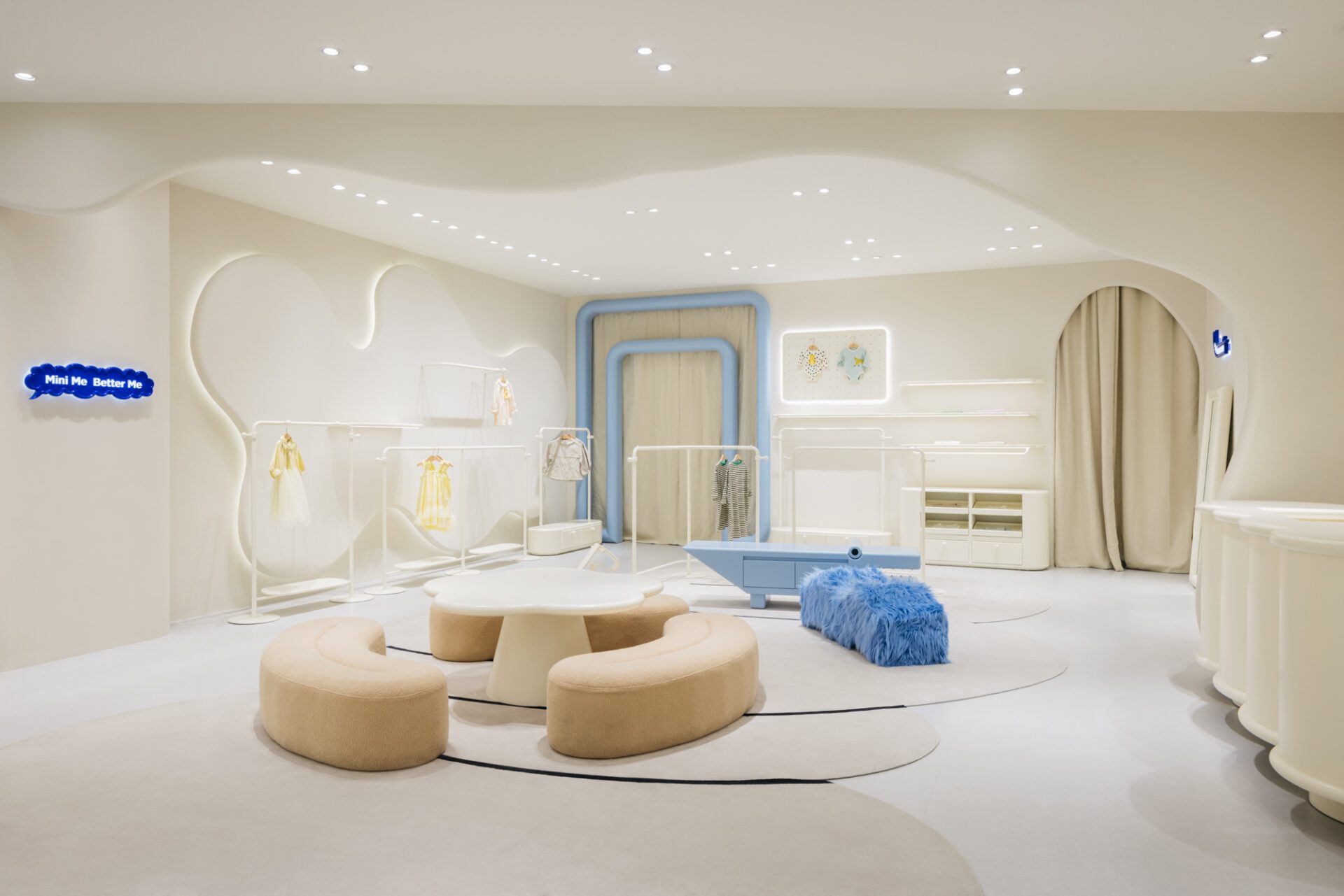 The entrance design adopts an open inner retreat structure to show the store structure and art installations to the greatest extent. Beige-toned art paint and soft light line lights are used as a whole on the wall to create a soft and delicate sense of space and a sense of hierarchy. In terms of materials, E1 grade environmental protection materials are used to ensure the health and safety of children. The shape of the shelves and display props in the store is based on the characteristics of children's drawings and love to touch, and designed comic-like flower installations, various monsters with eyes and long hair, as well as small crocodiles, small wooden horses, small flower-shaped tables and more.