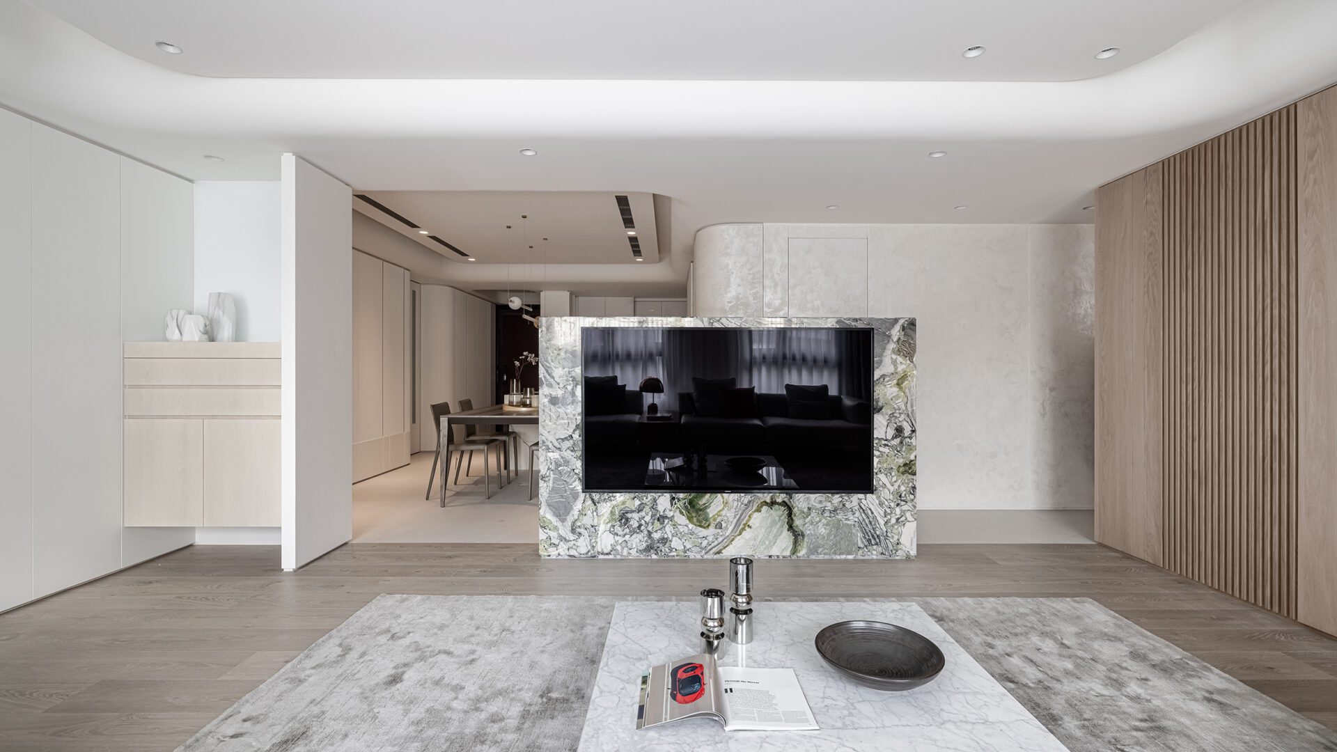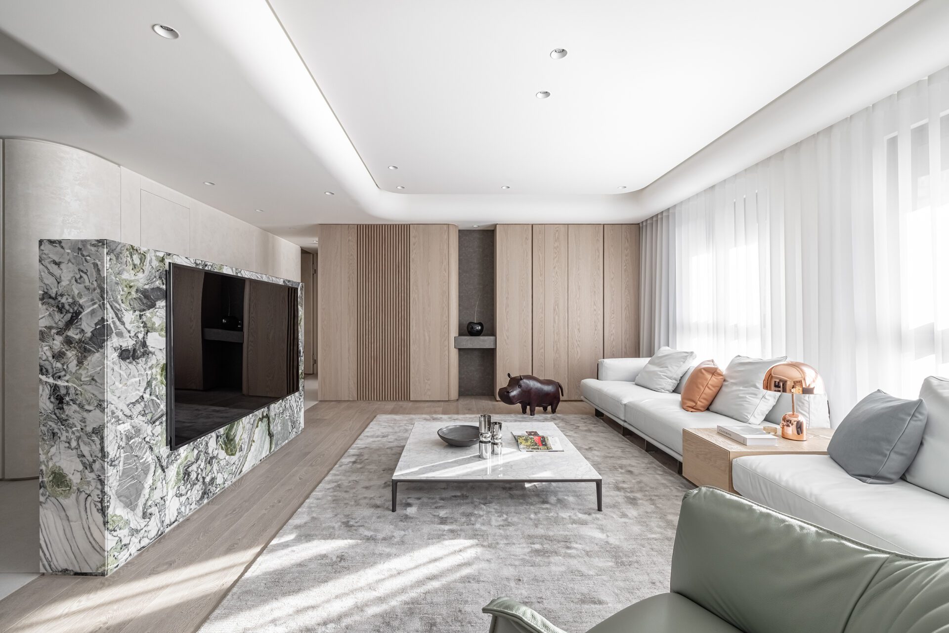 At the heart of the social area, an eye-catching and striking half-height TV wall crafted from ice jade marble stands out amidst the elegant theme. Although the bold pattern may seem unconventional, the TV wall serves as the centerpiece of the area. Furthermore, the designer utilized flooring to delineate the different themes within the open social space, effectively expanding the overall visual perspective by avoiding additional partitions.