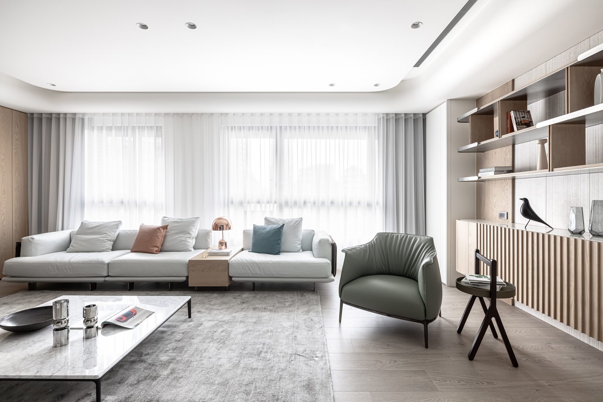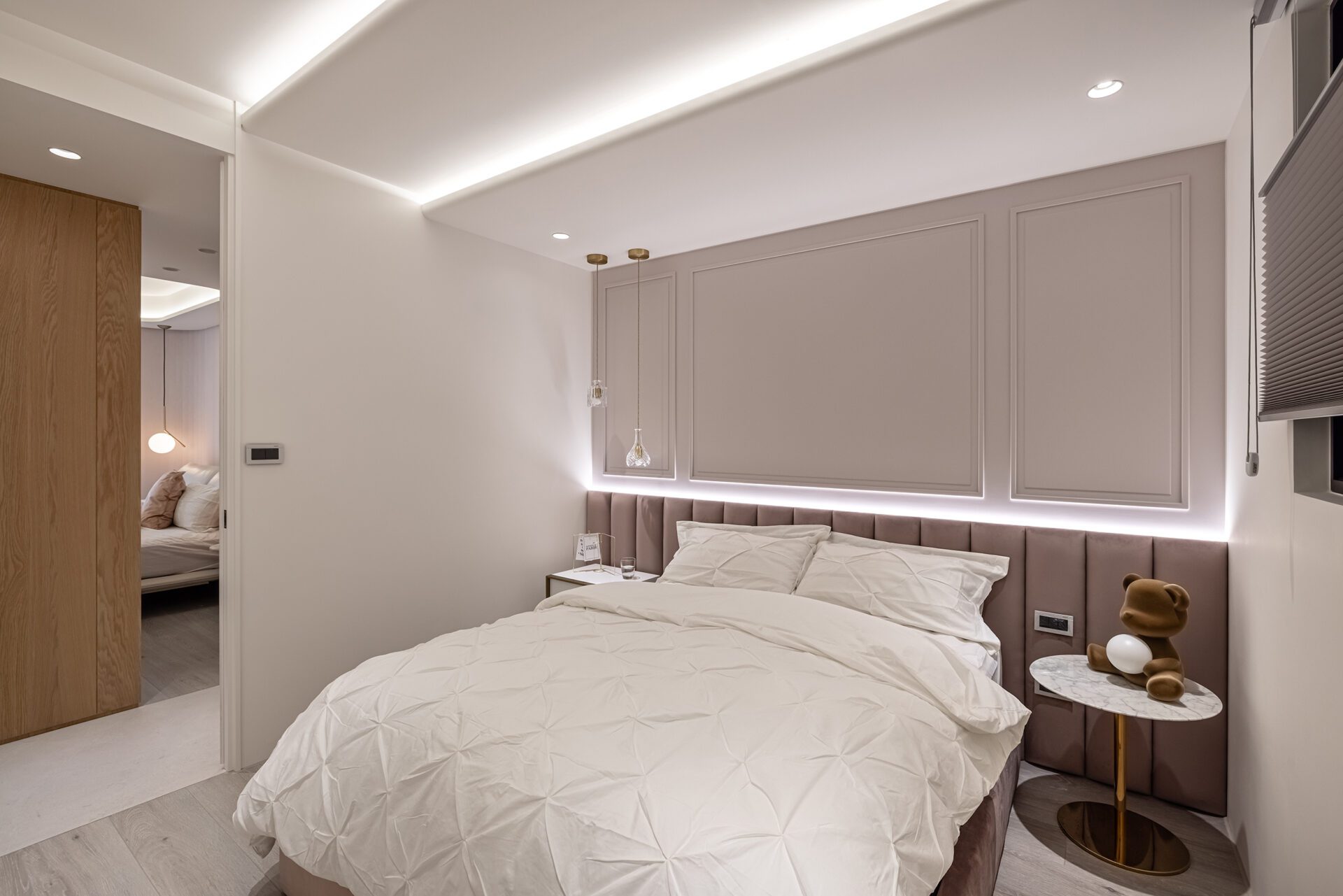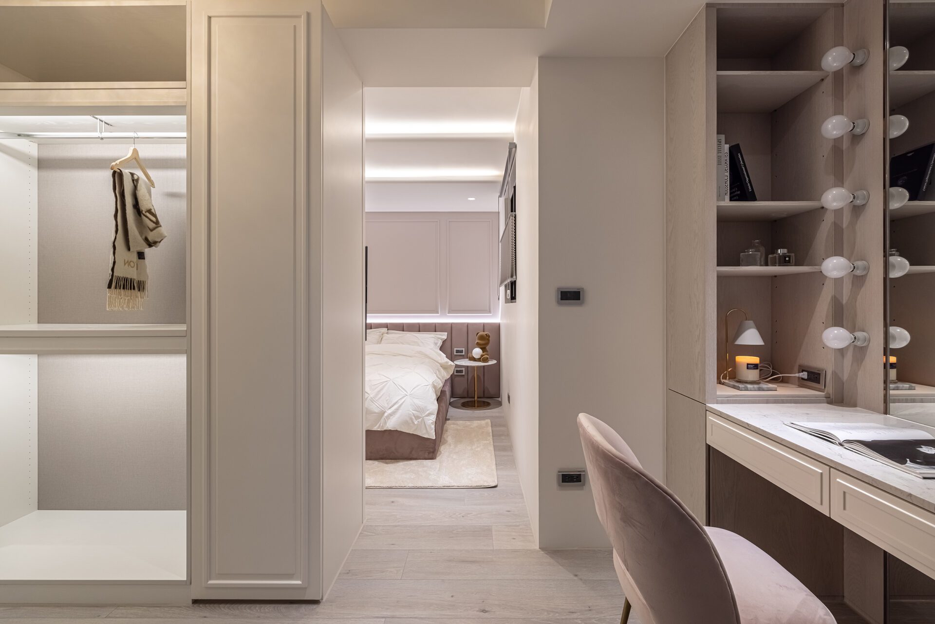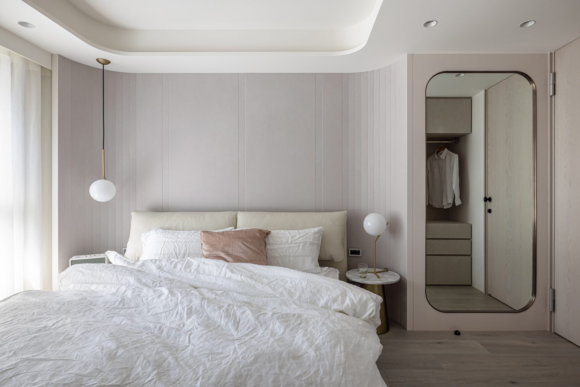 The site is located in downtown Taipei and benefits from lighting on two sides. The designer envisioned a modern space with a soft style, catering to two women. The entire room is adorned with low-saturated white and earth tones, creating a tranquil ambiance.