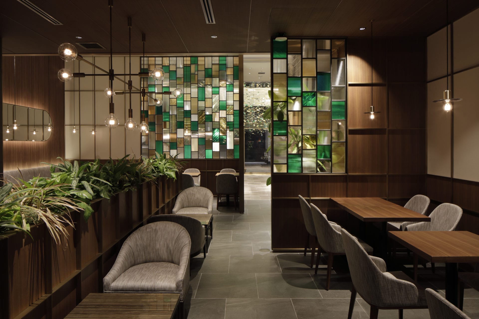 This is the design for the Morozoff Flagship Store, which has a history of over 88 years. So we respectively set two themes. First, a design still needs to be loved by its existed guests. Second, the guest would expect the future of the company and keep being their loyal guests. And tried to use their iconic color and cookie for the interior design and materials.inished in green and gold reflecting panels, it is the corporate colors of Morozoff. And Service areas in the front and cafe areas in the back are separated only by a glass panel. The glass partition is composed of three types of differently colored glass and a pendant lights hanging in each area, reflecting the light randomly from the leaf to resemble something like a large chandelier. Reflecting the light randomly from the leaf could like a large chandelier and also providing brilliance and a luxury atmosphere. Looking through the glass partition, there is a construct of classic and contemporary that we could expect a good connection between the past, present, and future of the store and the company with the guests.