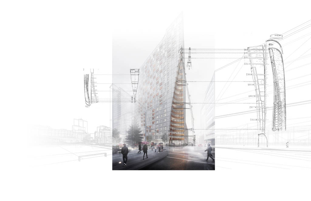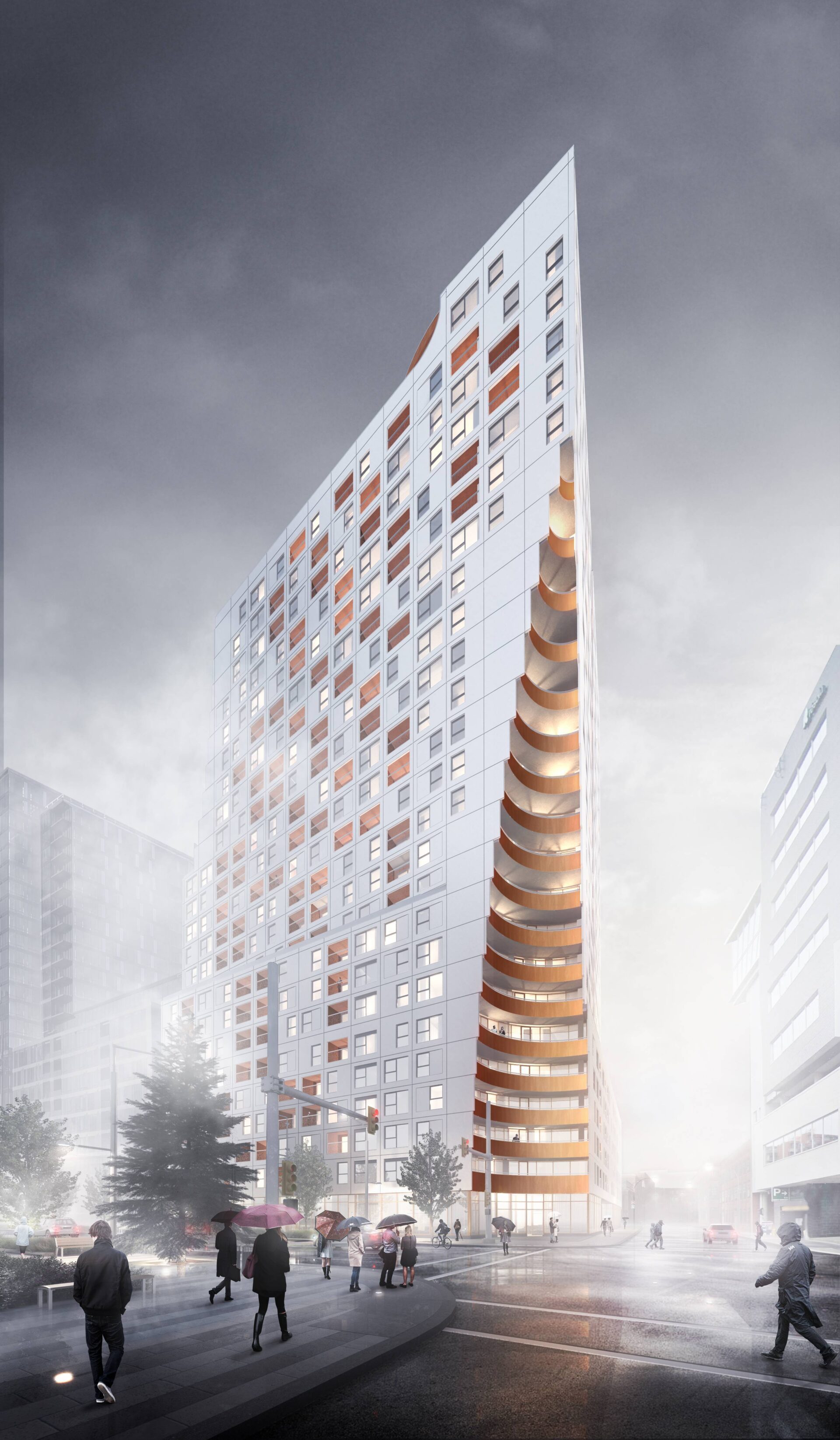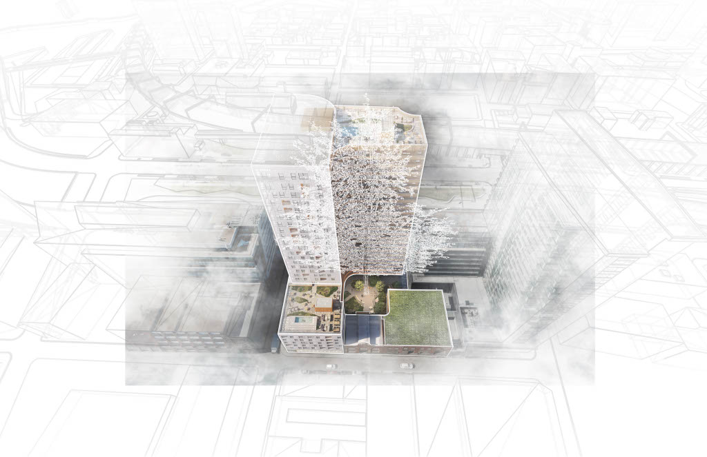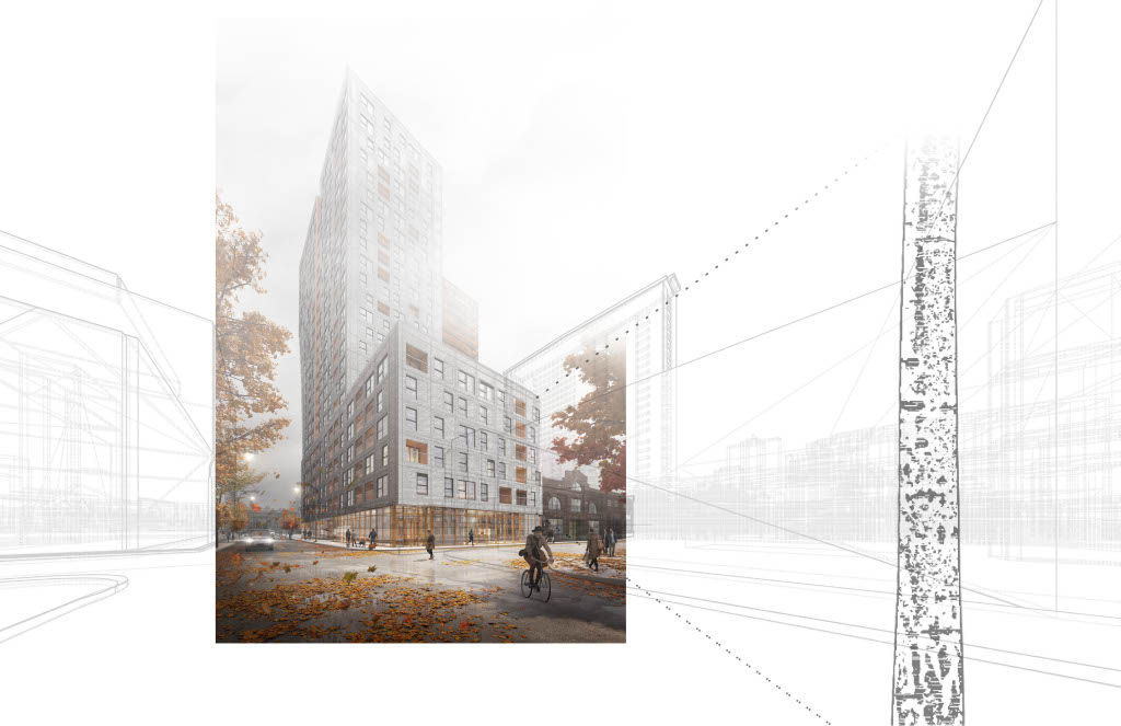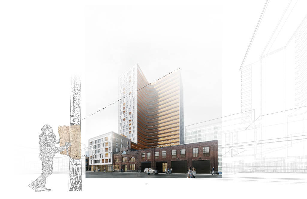 Located on Cree territory dating back to 1995, Odea—named after the Cree word for canoe, ‘ode’—highlights the Eeyou First Nation in Montreal with a distinctive presence on the city’s skyline. Forming a visual and urban link between the history and identity of the land it’s built upon, this 25-storey mixed-use tower combining office, commercial, residential space and two preserved heritage buildings integrates Cree values and culture into a design drawing inspiration from three core symbols: The canoe, the birch, and the forest.