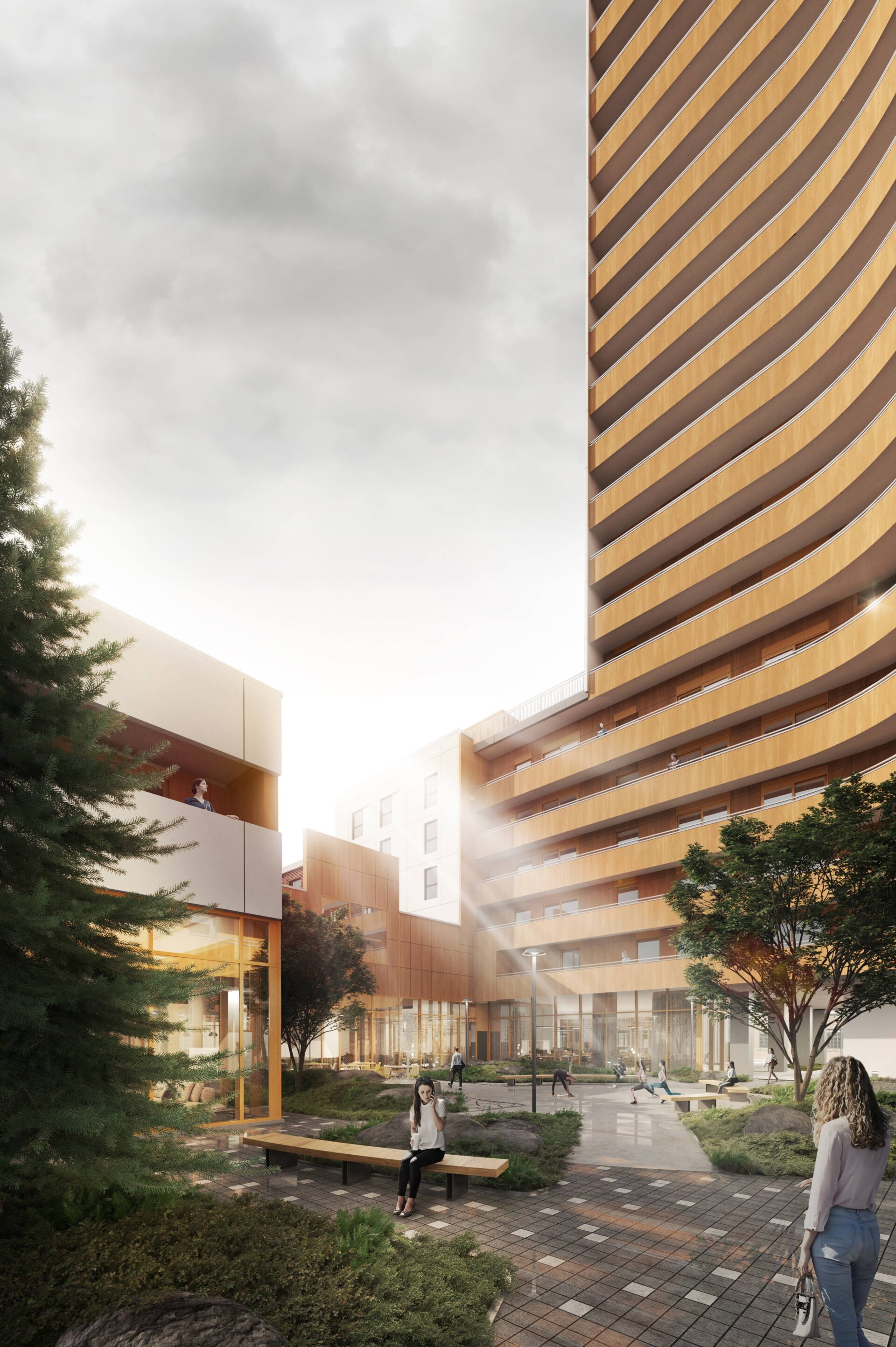 Carrying forth the Cree Nation’s principle of preserving the land, the project incorporates Lemay’s Net Positive™ framework for sustainable strategies to promote environmental protection, carbon emission reduction, and user health and well-being throughout. Aiming for LEED v4 Silver certification, the project aims to couple its greenspace with technologies such as central water heating, fresh air ventilation for all units, and efficient glazing to minimize unwanted solar heat gains and heat loss for sustainable construction and good water management.