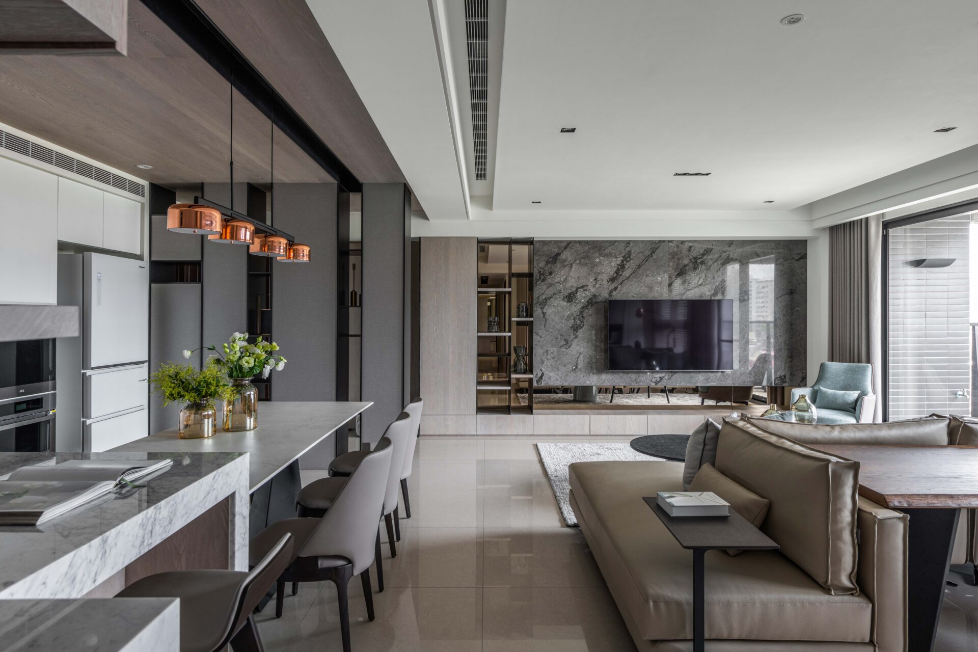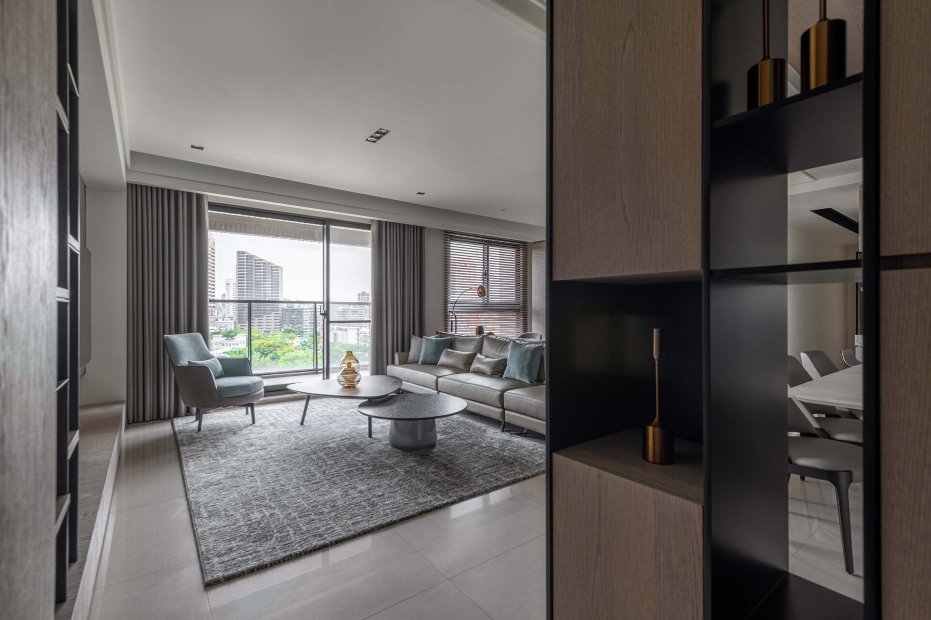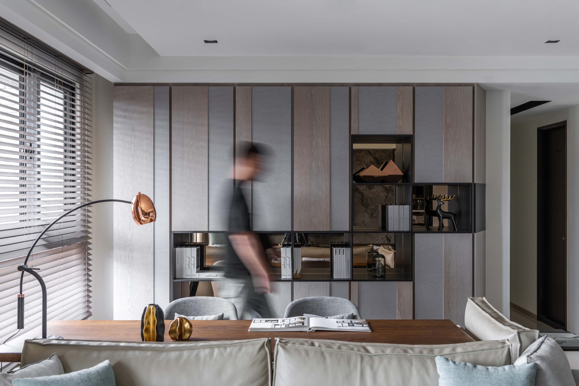 By utilizing the lines and the sunlight, the designer has outlined the mansion with several different materials so as to build a low-key luxury residence. The contact between each space has become the point of this construction. In addition to using the french windows to bring the lights, the walls aren’t used to separate the fields, but only to define each other's functions such as the cabinets at the entry. In order to keep the visual sight clear, the cabinets are designed in a hollow shape so that people can still see the study room through the finest deck ornaments and the wood. The interlaced display cabinets in the study have extended into the kitchen, and the elegant wooden ceiling at the entrance has spanned the corridors of the public domain. Moreover, the designer has outstretched the volume and color to create the conceptual connection between the fields and the staggered lines which has become the index of the lights, weaving a natural and modern home style.