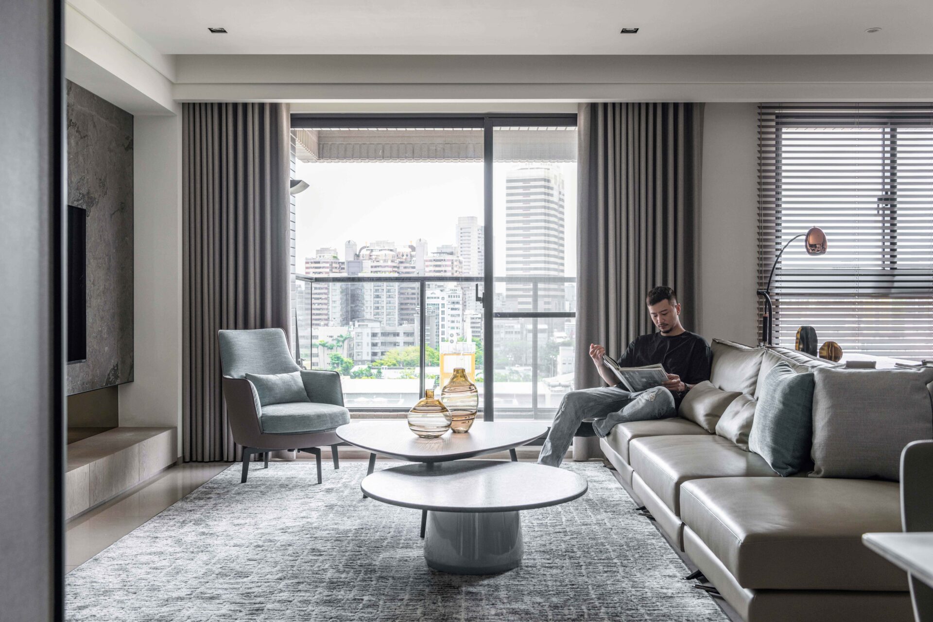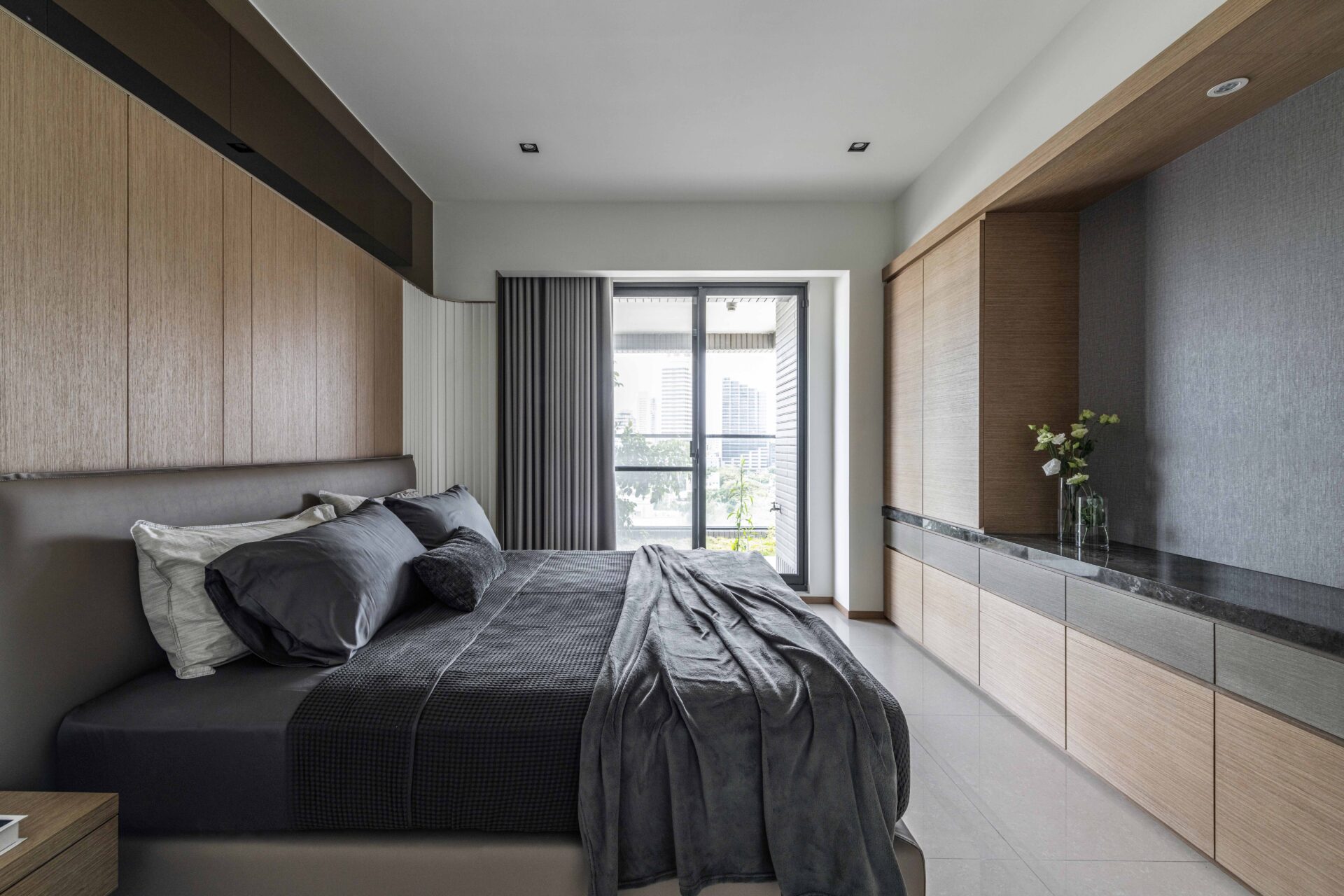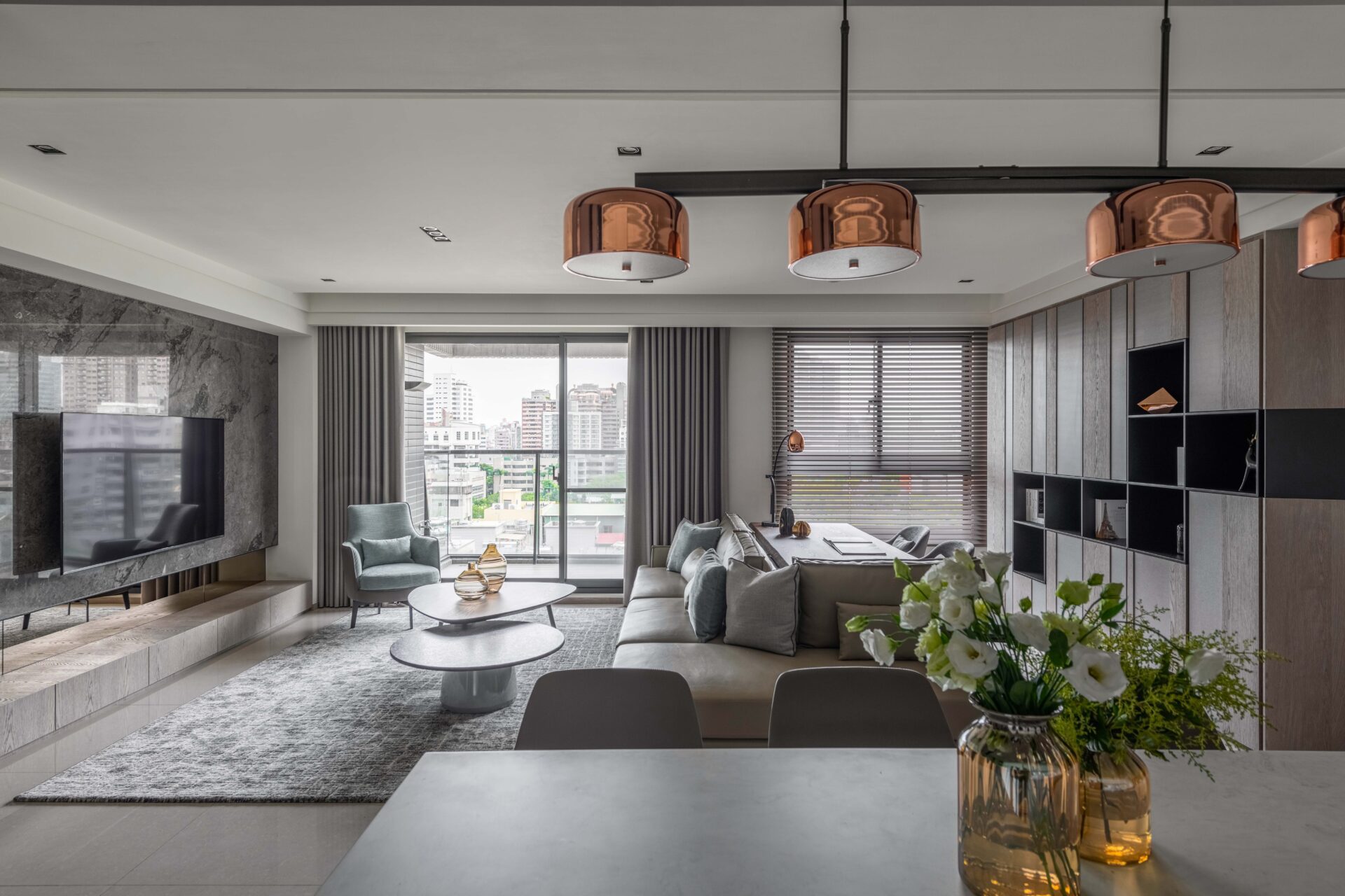 By utilizing the lines and the sunlight, the designer has outlined the mansion with several different materials so as to build a low-key luxury residence. The contact between each space has become the point of this construction. In addition to using the french windows to bring the lights, the walls aren’t used to separate the fields, but only to define each other's functions such as the cabinets at the entry. In order to keep the visual sight clear, the cabinets are designed in a hollow shape so that people can still see the study room through the finest deck ornaments and the wood. The interlaced display cabinets in the study have extended into the kitchen, and the elegant wooden ceiling at the entrance has spanned the corridors of the public domain. Moreover, the designer has outstretched the volume and color to create the conceptual connection between the fields and the staggered lines which has become the index of the lights, weaving a natural and modern home style.