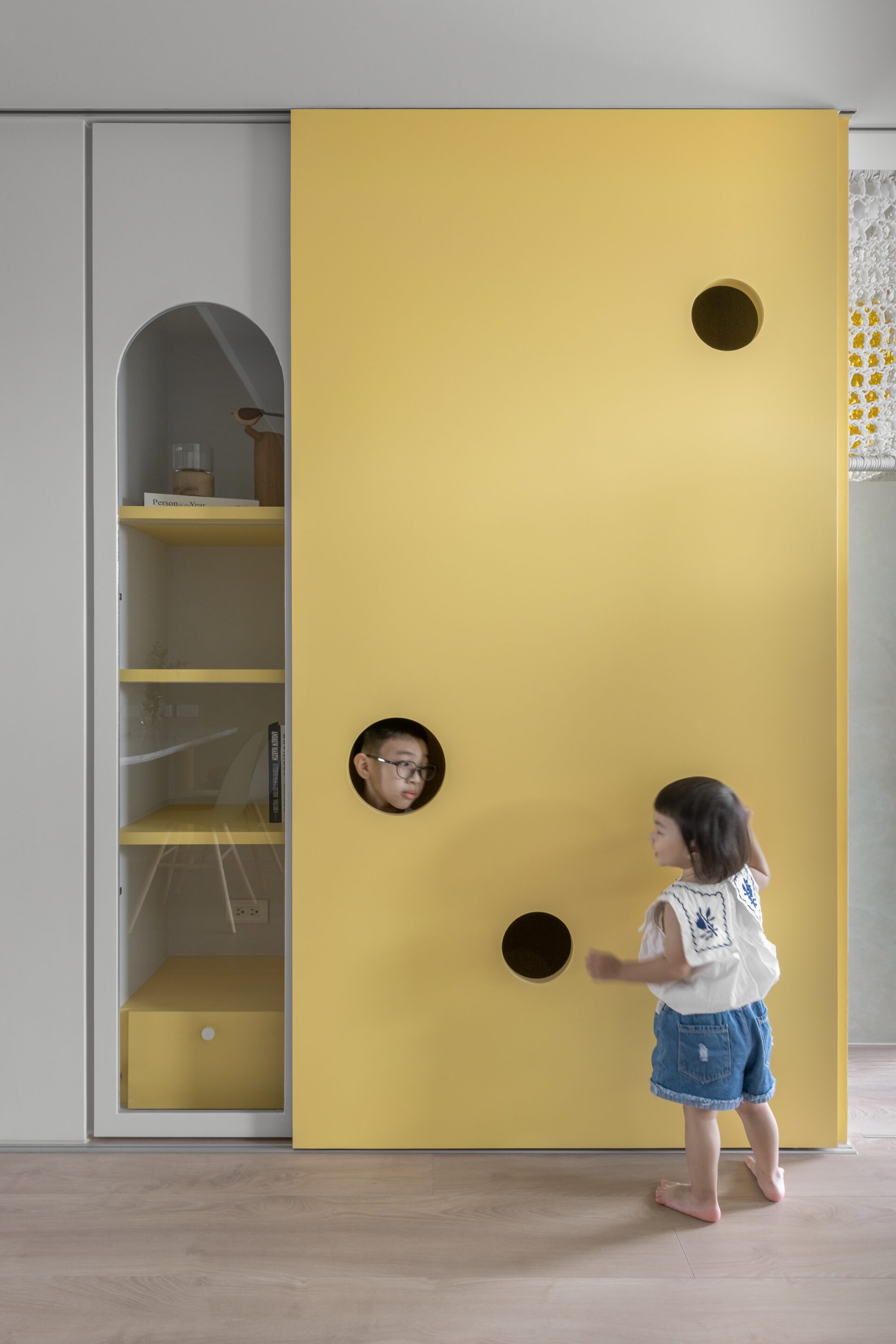A labyrinthine path leads from the entrance to the living room, introducing an element of mystery and diversion. The living room and playroom are separated by a movable sliding door, enabling versatile use of the space. The playroom can easily transform into a bedroom to adapt to the evolving needs of the residents. This multifunctional children's playroom caters to activities such as reading, storage, and play, while a net creates a secret area that accommodates children at every stage of their growth.