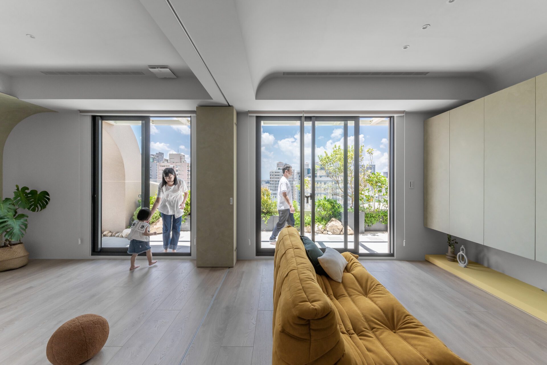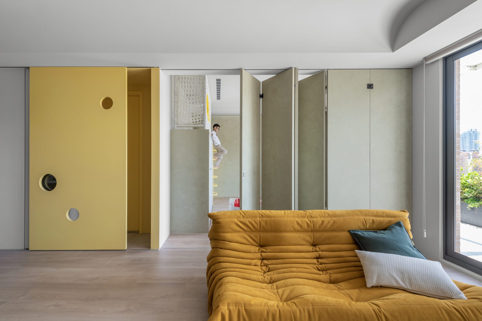Despite the common practice of expanding indoor areas, the Maze House maintains a spacious and open-air terrace on the top floor. The terrace features a sand pit and an outdoor game area with panoramic green views. The entire surface of the project is utilized to its fullest extent. Floor-to-ceiling windows seamlessly connect the indoor and outdoor spaces, creating a serene home forest. This provision of ample and barrier-free activity areas is particularly beneficial for families residing in city centers surrounded by towering buildings.
