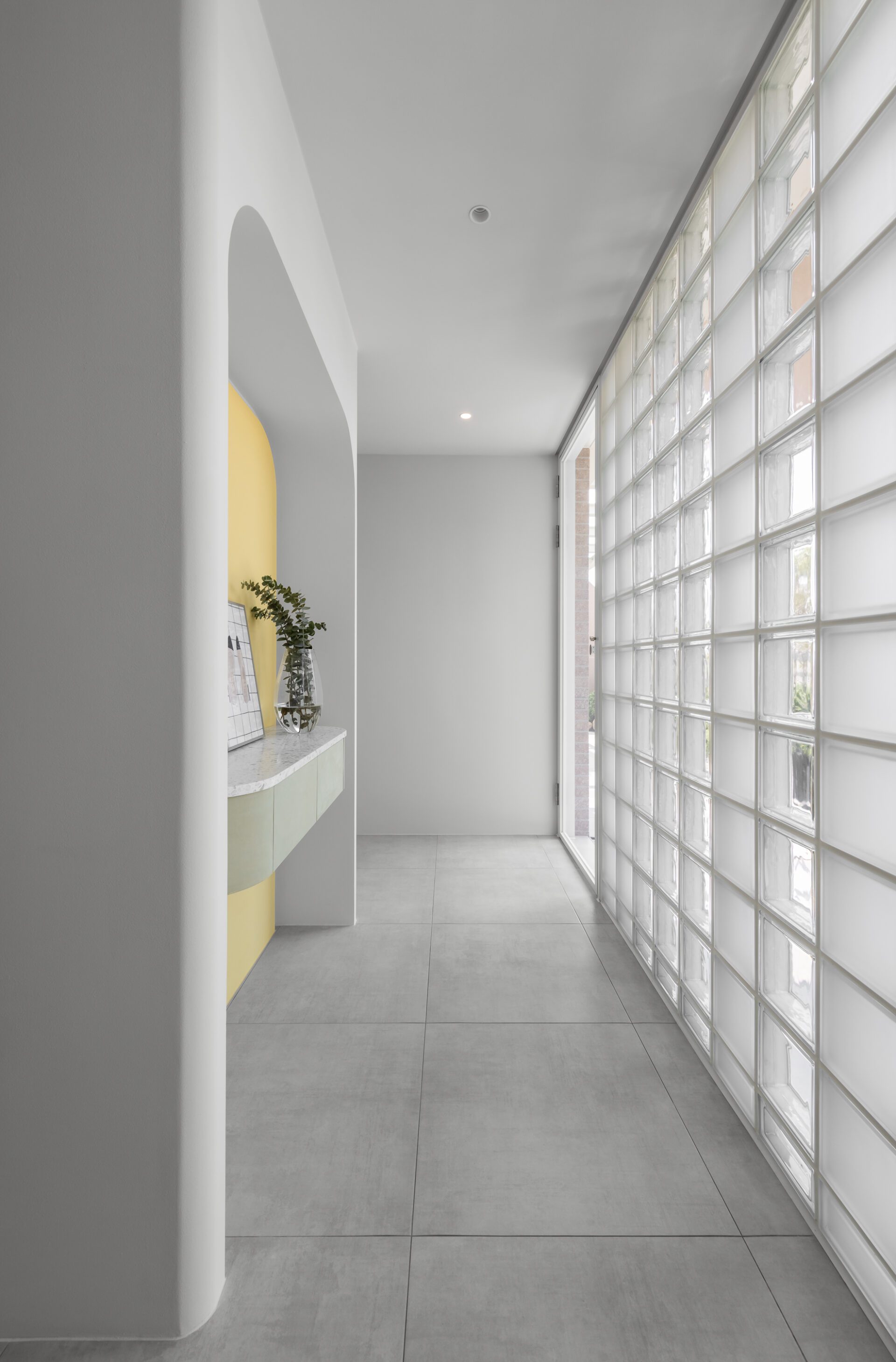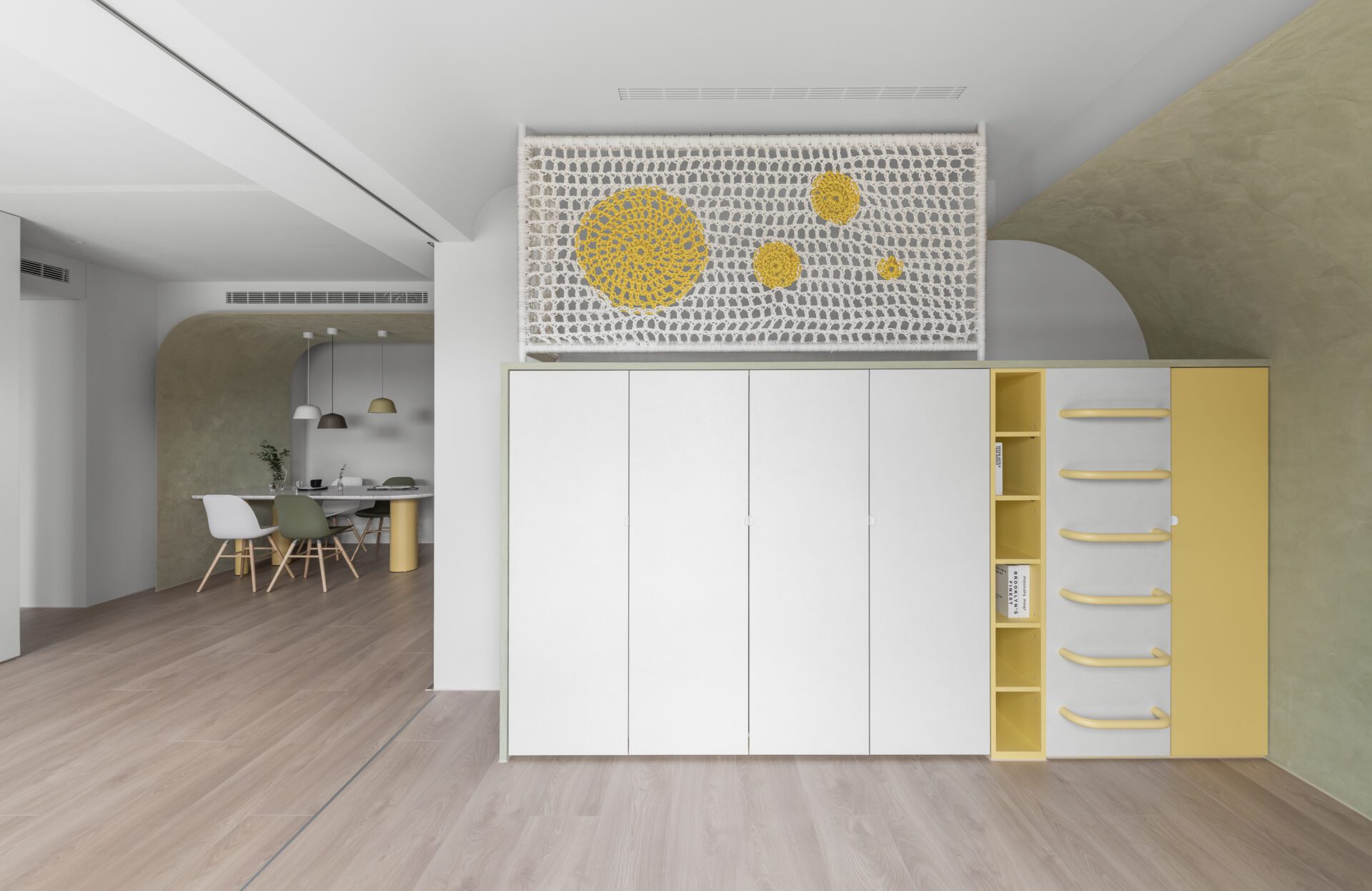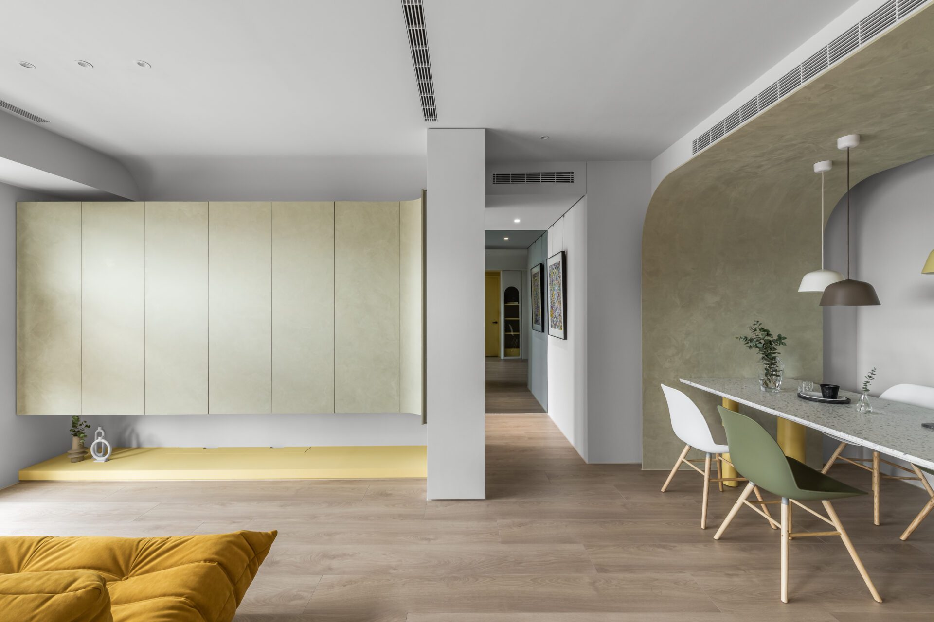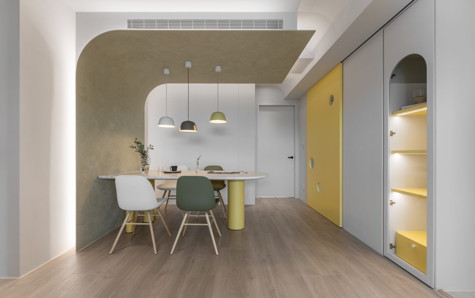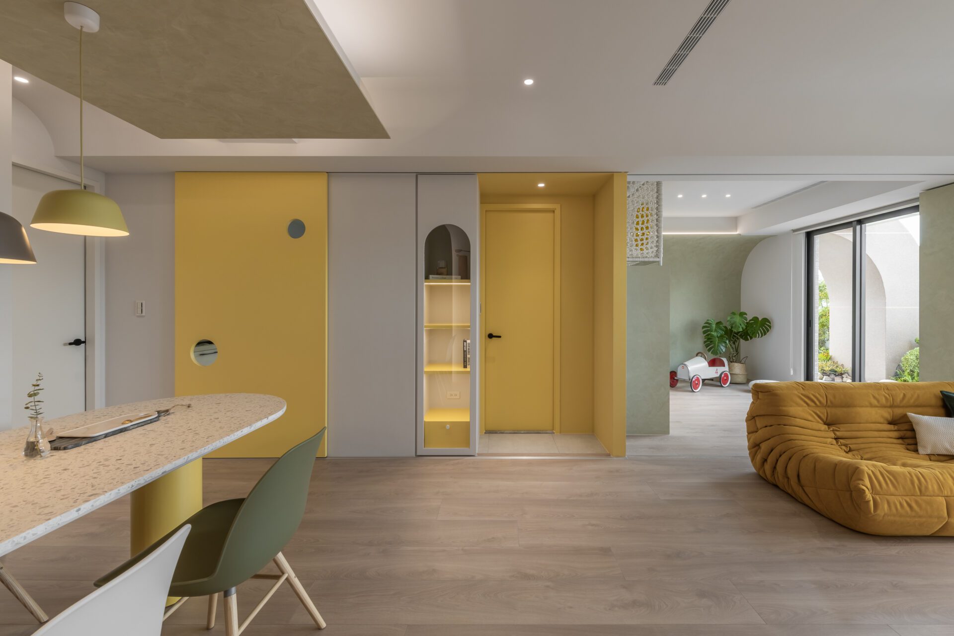 An arc-shaped thin plate integrates into the dining area, stretching from floor to ceiling to conceal various equipment and create captivating visual effects. The living room is adorned with a simple empty cabinet to house the television, resulting in a clean and minimalist aesthetic. The kitchen's exterior main wall echoes the design of the porch, adding a touch of drama to the overall spatial hierarchy. Sliding doors on the kitchen's exterior enhance the sense of playfulness, reinforcing the notion that home is a playground. Vibrant colors are carefully introduced to enhance the lively and playful atmosphere throughout the space.