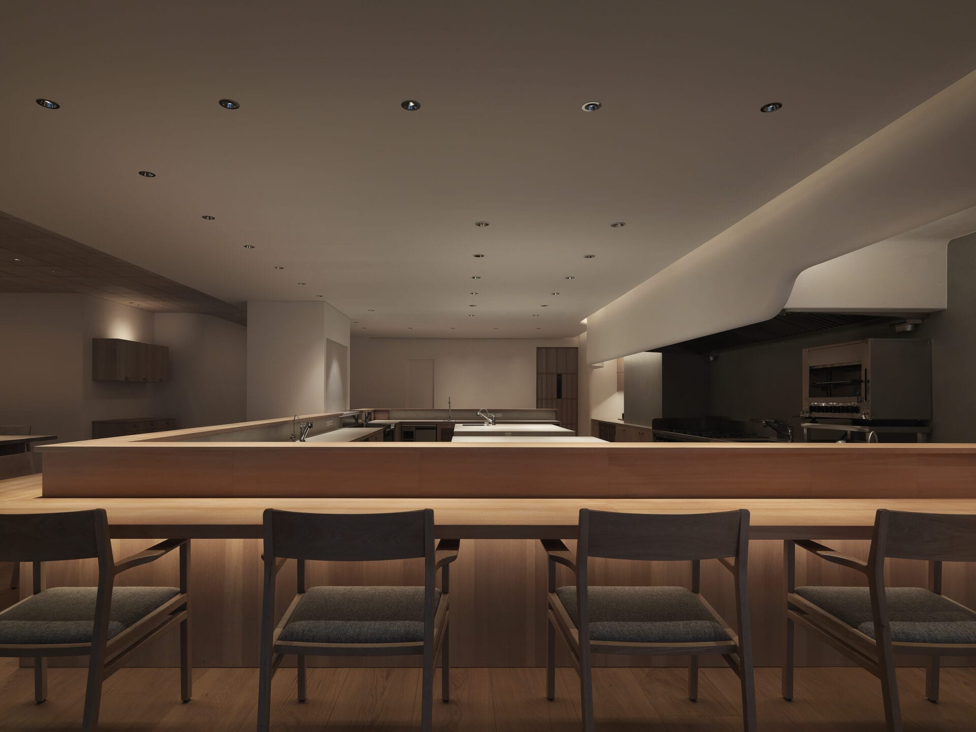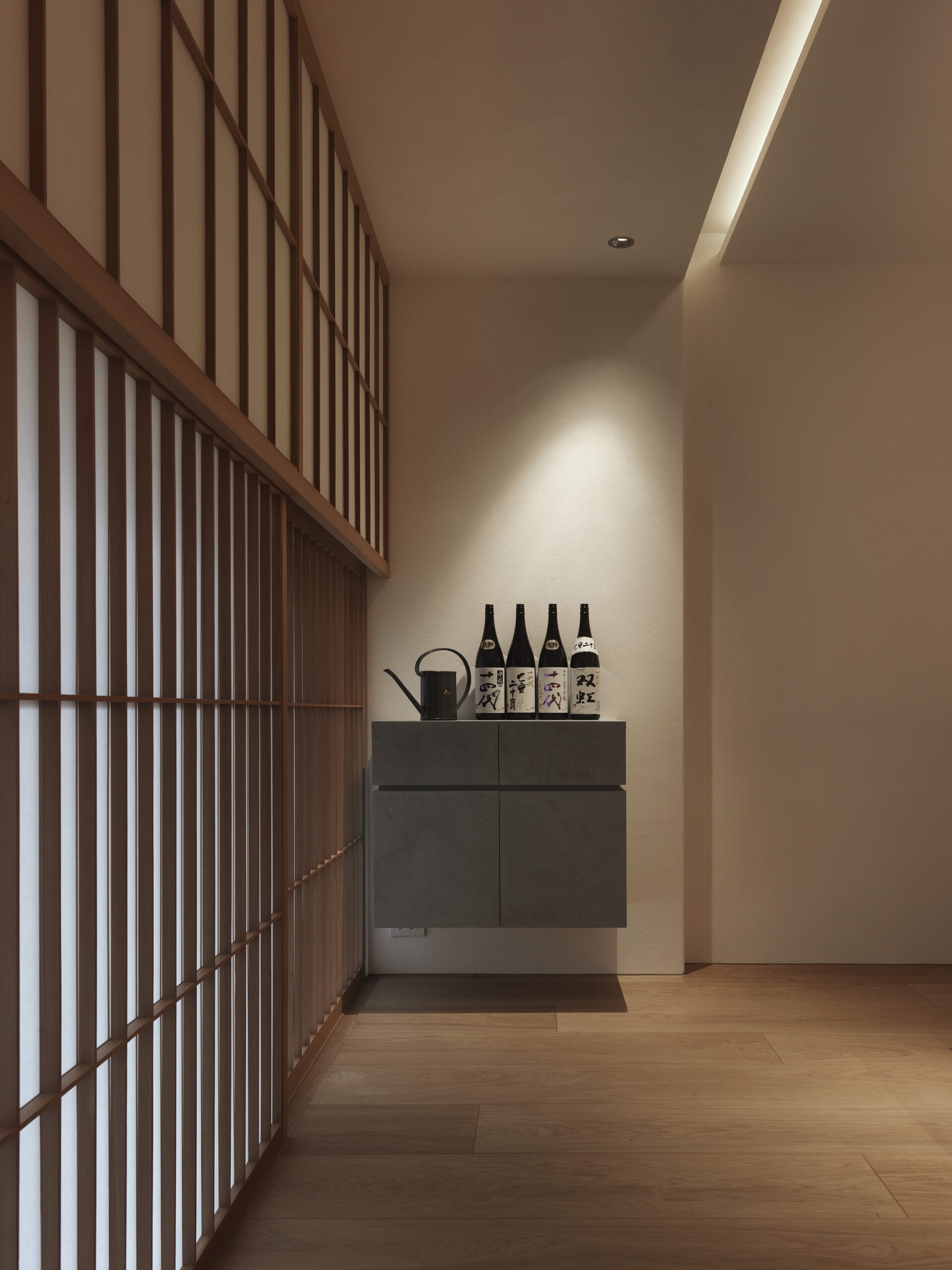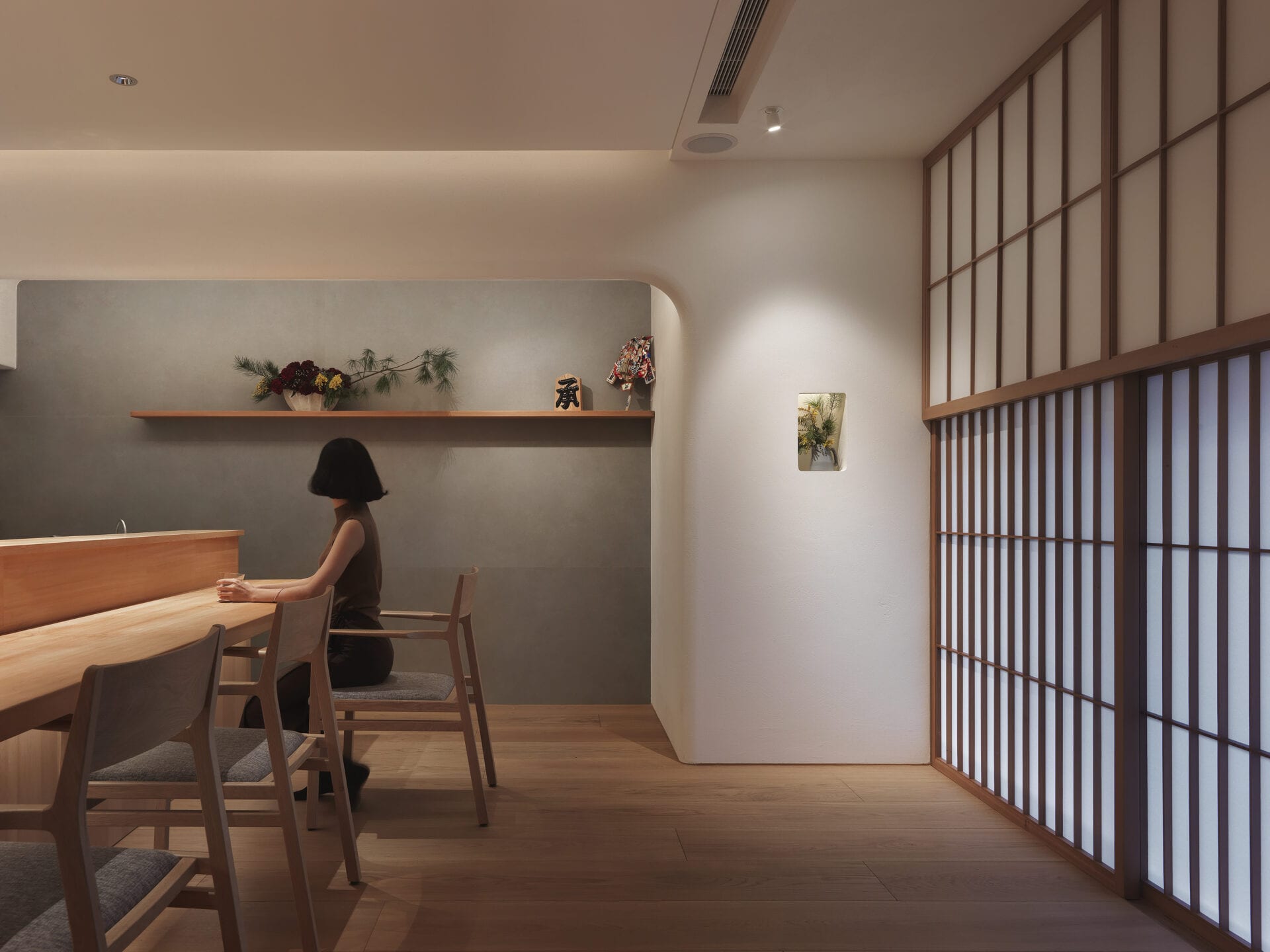 “True flavor is found in unseasoned food. “Chinese writer Hong said in his book Vegetable Roots. However, this concept seems to be more practiced in Japanese cuisine. The head restaurant Den in Tokyo is inspired by “ryotie”, a traditional Japanese style restaurant. Instead of being restricted by traditions, Den connects itself to the world with innovation and a sense of humor. Taiwan-based branch Sho carries on the elements. The yakisugi ban at the main entry may seem rough, but on the second look you’ll find that it connects with metal hardware beautifully, carving out a Japanese-garden-like entry in a modern architecture. The slate on floor in intended to remind people of the Oya slates used in Den. Going through the path and then upstairs, thin lattices on the side blur the line between light and shadow. The route from entry to the entrance is an “indoor teien” experience, which represents the faint ambience in a Japanese garden. Walking into the room, however, brightness and openness play strong contrast and tell a different narrative. At the ryotei a set of cypress counter lies, separating the space into dining area and working area. The whitewash lime wall and the niches show the essence of the space: simplicity. In a traditional ryotie, the working station is usually small and multilevel. Yet here in Sho, the station in opened up where chefs can work smoothly without bumping into each other. This also fits the new multiplex trend in Japanese cuisine. The celling is made of bamboos from Taiwan, reforming into a design that reminds the viewers not only subtle impressions of a wooden cabinet but also a sense of modern neatness. The seats with a Nordic style design are customized by craftsmen in Tainan. Different cultures blending in perfectly with each other in Sho, representing the exclusive spirit and the braveness to explore on this land.