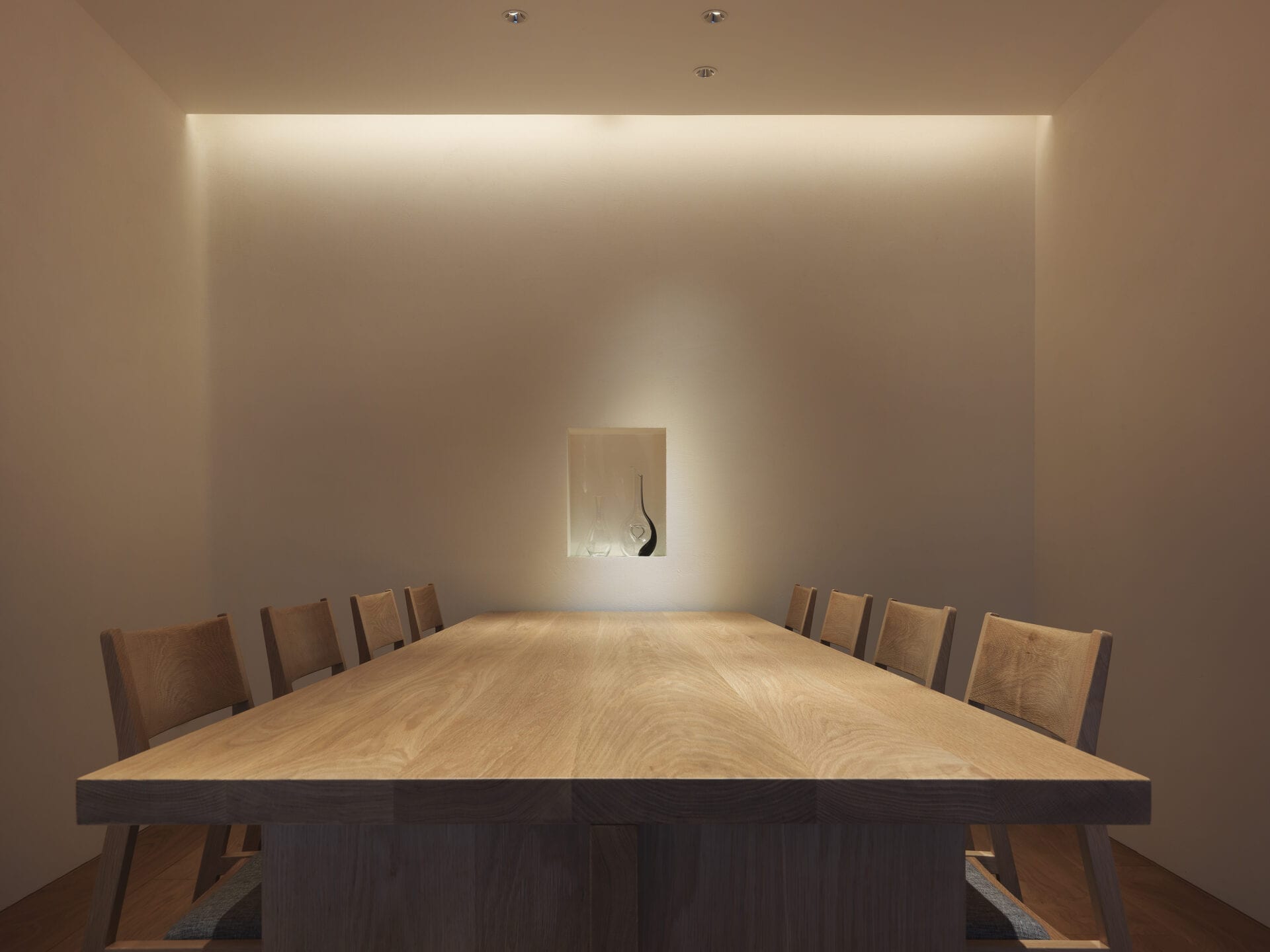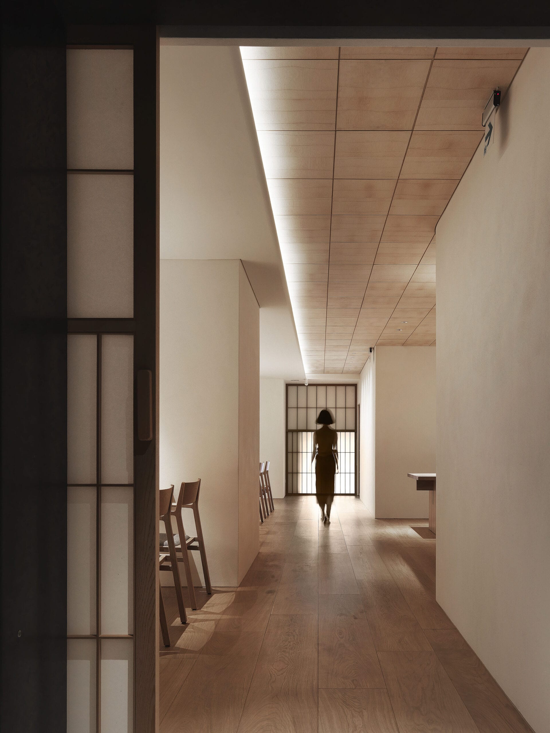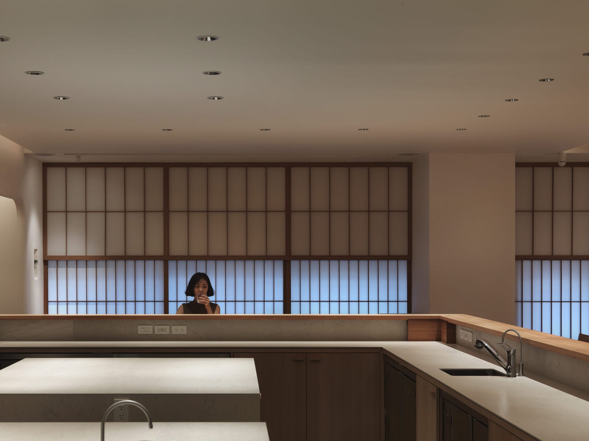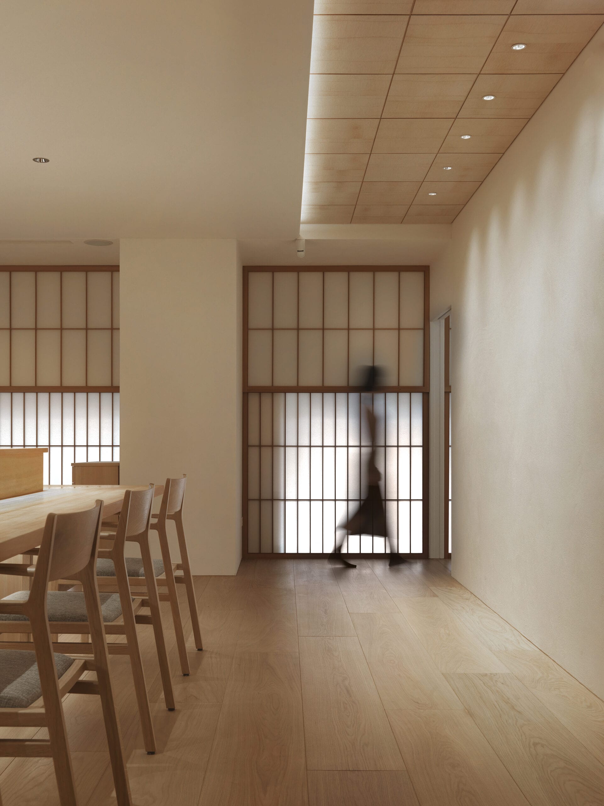 “True flavor is found in unseasoned food. “Chinese writer Hong said in his book Vegetable Roots. However, this concept seems to be more practiced in Japanese cuisine. The head restaurant Den in Tokyo is inspired by “ryotie”, a traditional Japanese style restaurant. Instead of being restricted by traditions, Den connects itself to the world with innovation and a sense of humor. Taiwan-based branch Sho carries on the elements. The yakisugi ban at the main entry may seem rough, but on the second look you’ll find that it connects with metal hardware beautifully, carving out a Japanese-garden-like entry in a modern architecture. The slate on floor in intended to remind people of the Oya slates used in Den. Going through the path and then upstairs, thin lattices on the side blur the line between light and shadow. The route from entry to the entrance is an “indoor teien” experience, which represents the faint ambience in a Japanese garden. Walking into the room, however, brightness and openness play strong contrast and tell a different narrative. At the ryotei a set of cypress counter lies, separating the space into dining area and working area. The whitewash lime wall and the niches show the essence of the space: simplicity. In a traditional ryotie, the working station is usually small and multilevel. Yet here in Sho, the station in opened up where chefs can work smoothly without bumping into each other. This also fits the new multiplex trend in Japanese cuisine. The celling is made of bamboos from Taiwan, reforming into a design that reminds the viewers not only subtle impressions of a wooden cabinet but also a sense of modern neatness. The seats with a Nordic style design are customized by craftsmen in Tainan. Different cultures blending in perfectly with each other in Sho, representing the exclusive spirit and the braveness to explore on this land.