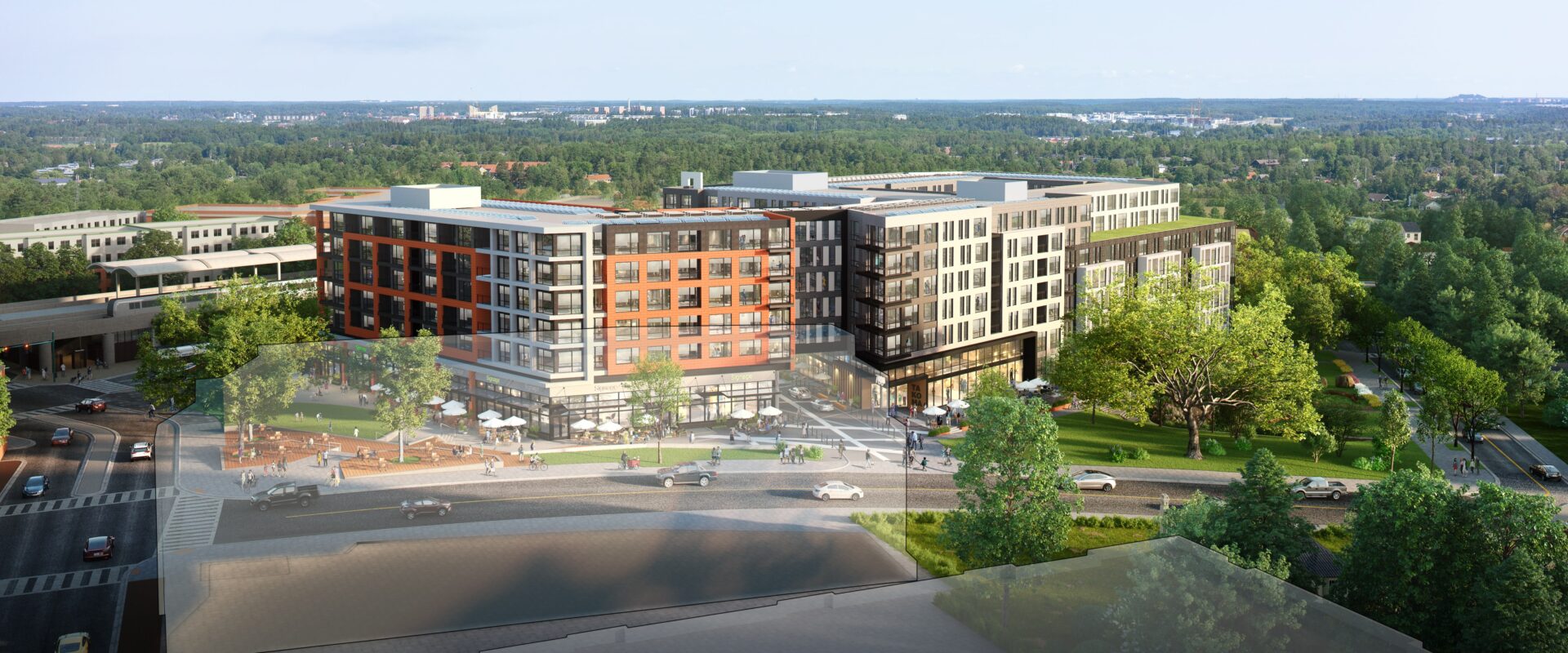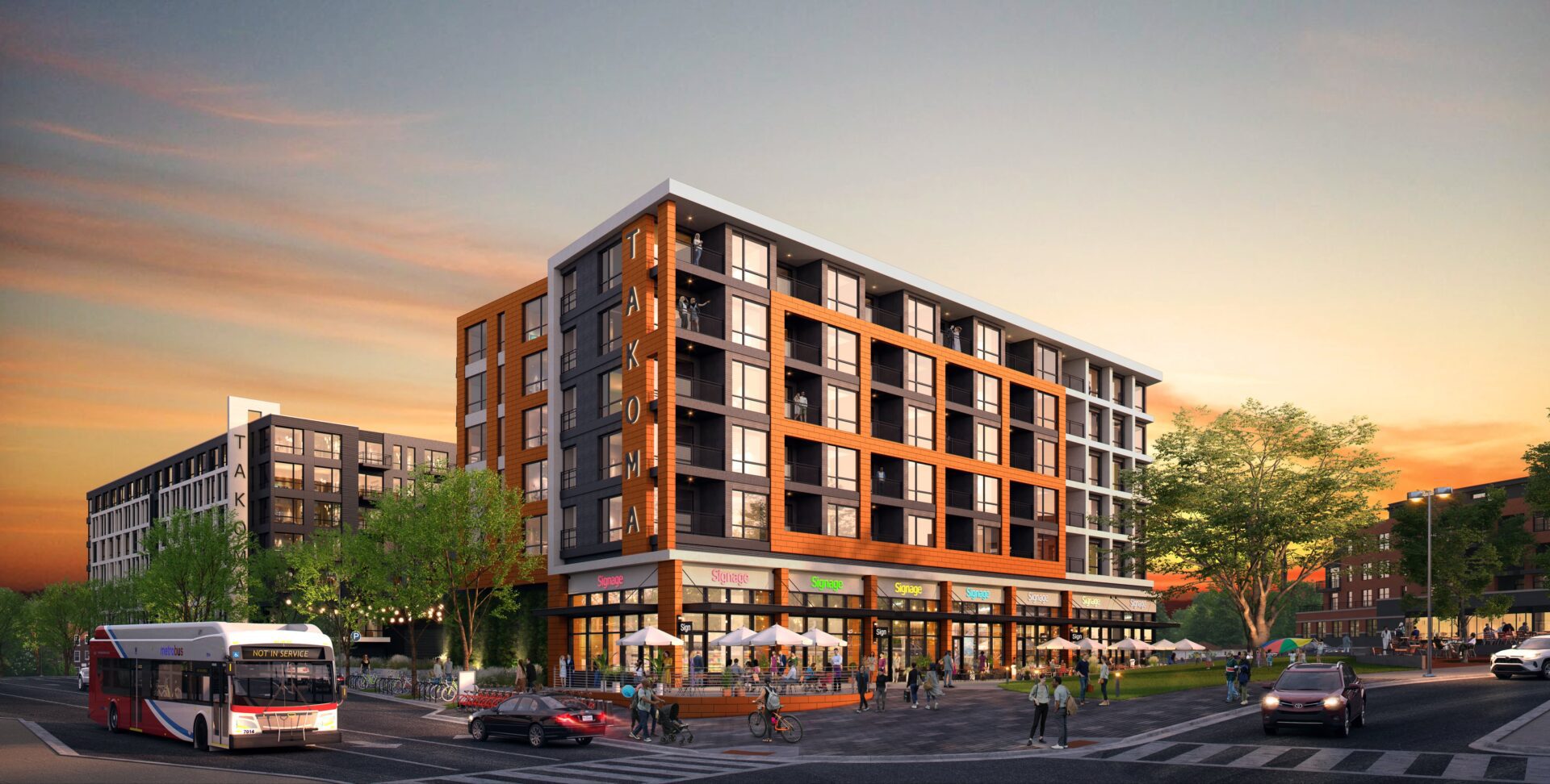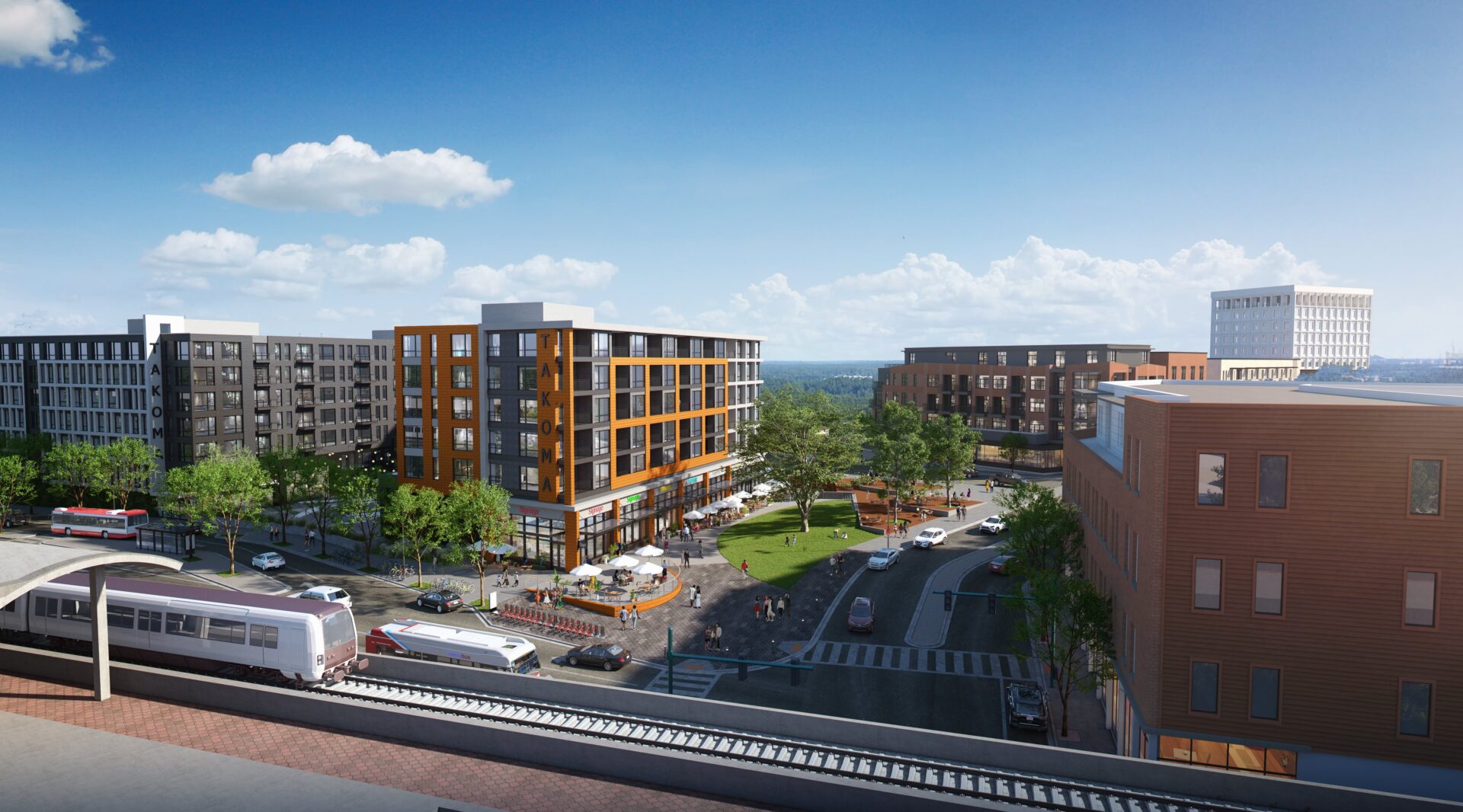 Takoma Metro is an innovative space that will serve as a hub for economic development and enhance the public space. Sits at the intersection of Takoma DC, and Takoma Maryland, next to the Takoma Metro Station. The development creates a hub of growth in a well-connected space and connects with the retail corridor of Carrol Street and the residential across Cedar Street and Eastern Avenue. Takoma’s 385,000 sf are divided into three areas within a single development to respond to the adjacent and surrounding developments. The massing is less prominent and plays with different heights, creating a visual relation to the townhomes and the publicly accessible park along the East side facade. The development increases pedestrian accessibility and serves as a buffer from the busiest traffic areas of Carrol Street, where the WMATA bus loop is located. On the south side, a more urban facade with retail on the ground floor and a large public square enhances pedestrian mobility and public safety by softening the traffic along Carrol Street. The topography of the site reduces the massing on this side.
