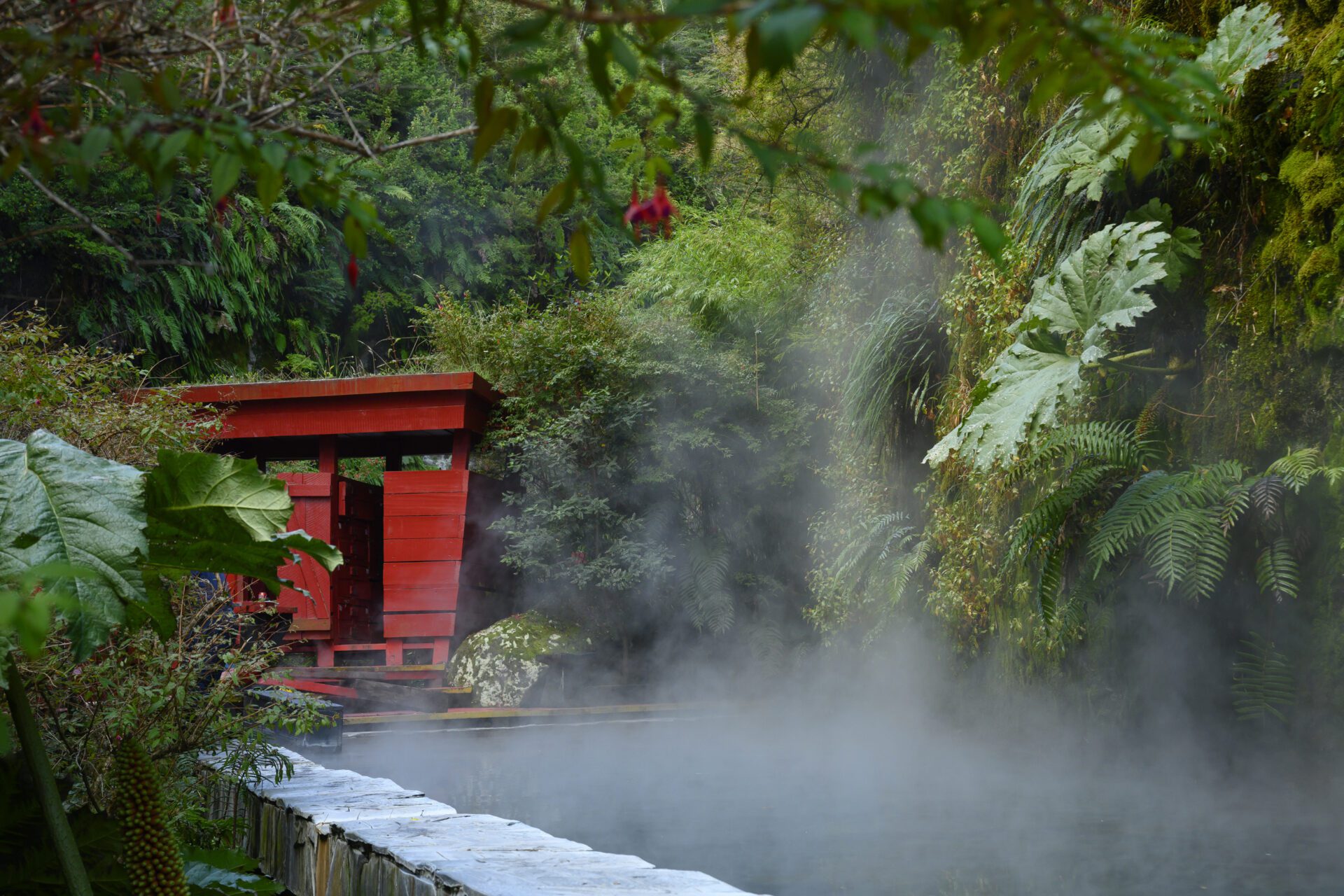 The hot springs water is distributed to the pools through wooden conduits that run under the walkway and heat it, keeping it always dry and safe. Close to every pool, there is always a pavilion built with local wood, with private bathrooms, locker rooms, and a deck to rest. A big roof planted with wild grasses covers a large secluded space to stay by the open fire, look around in silence, or have a relaxed conversation, a cup of tea, a glass of mineral water, or some deli sandwich. Or just enjoy the sunshine on the deck around.