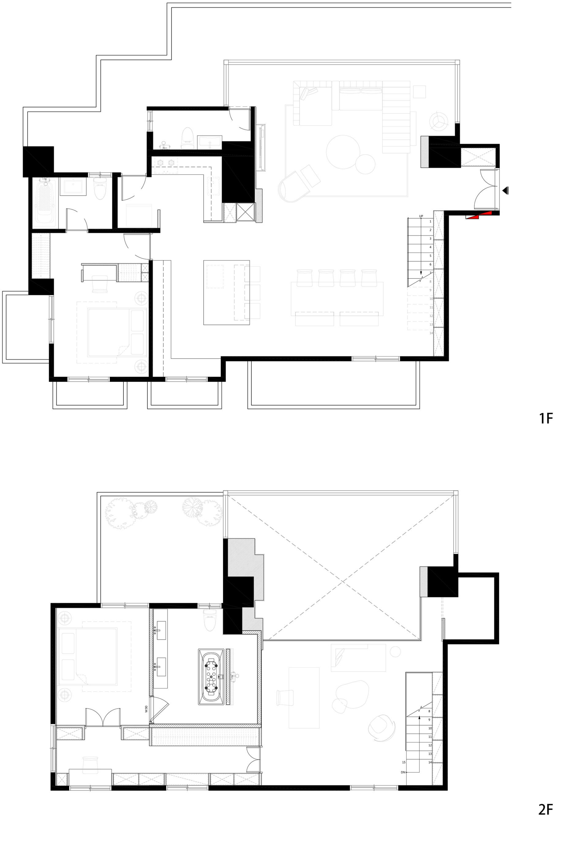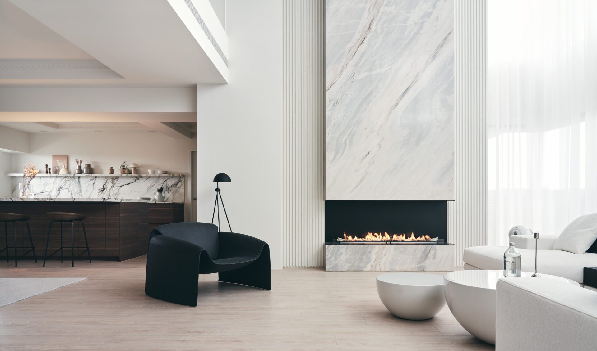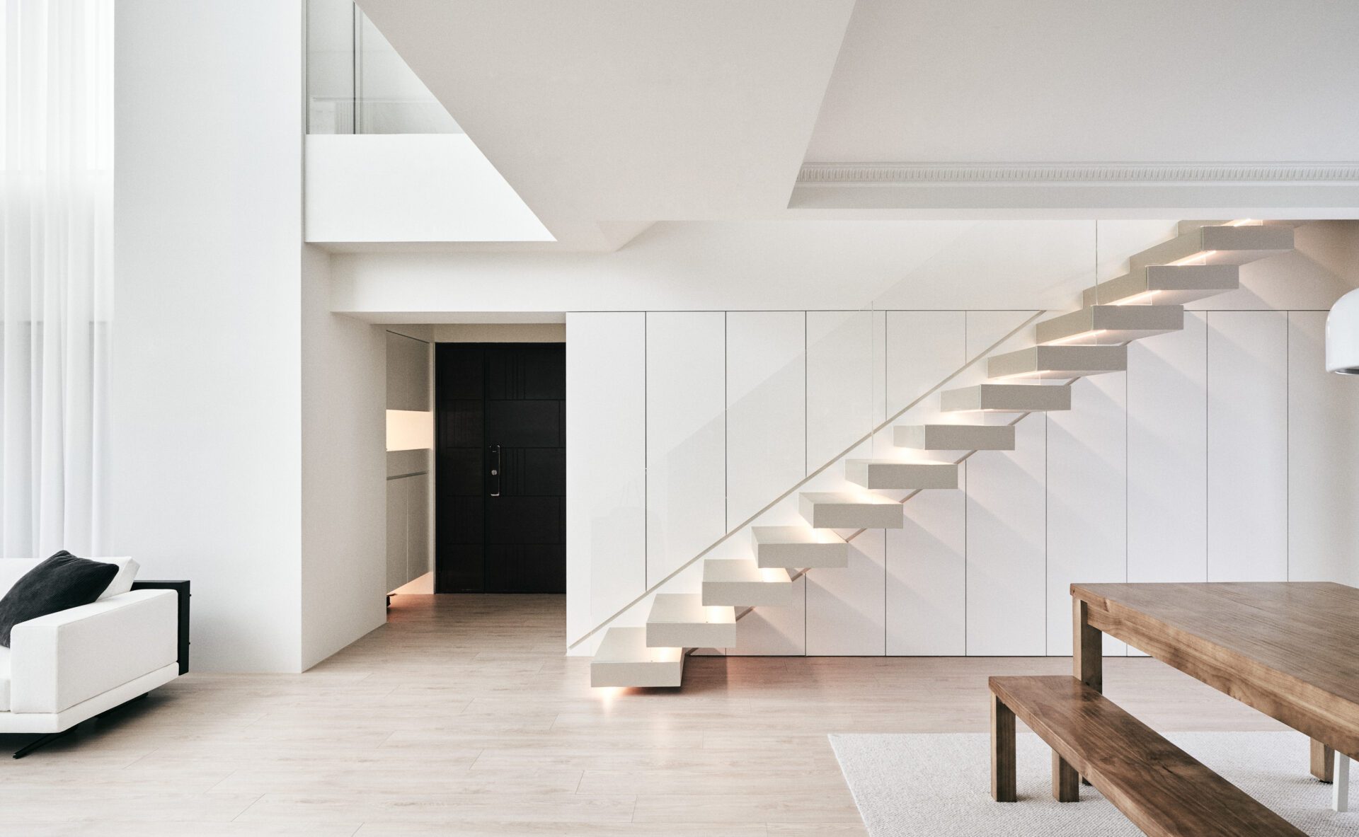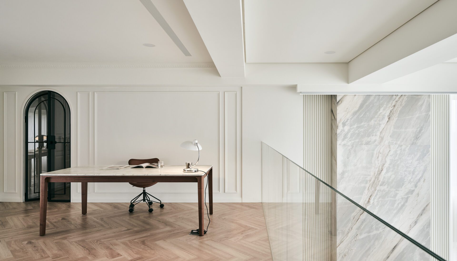 Sitting on a slope in a suburb of Taipei, the penthouse is a sleek and modern two-bedroom home immersed in greenery and boasting views of Taipei downtown. The residential is built with a nearly 7-meter height ceiling and 3 sides of the balcony for sunlight. Throughout the house, floor-to-ceiling windows let natural light pour into the different spaces. The core of the space is the living area, which contains a fireplace covered with blue-ish marble, alongside monotone color, and minimalist nifty furniture to create a soft and quiet ambiance. The kitchen is characterized by walnut wood, and great finished Neolith stone. The huge island is arranged in the middle of the space, with a built-in electric indulging cooker to create a place for gathering and cooking. The featherlight staircase with glass handrail creates a weightless structure, which also gives a huge amount of storage underneath. The staircase leads to the opened study area, where the owner can easily recreate the space for either working, reading, or painting. The upper level features a master bedroom, a walk-in wardrobe, and a bathroom with a comfy bathtub. The interior is inspired by our designer’s and client’s shared fascination for classical and minimalist in Europe. We tried to combine the elements of these two concepts, with symmetrical walls and doors, merging with a neat and minimalist structure.