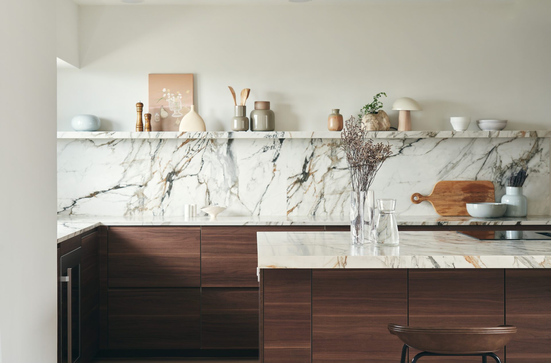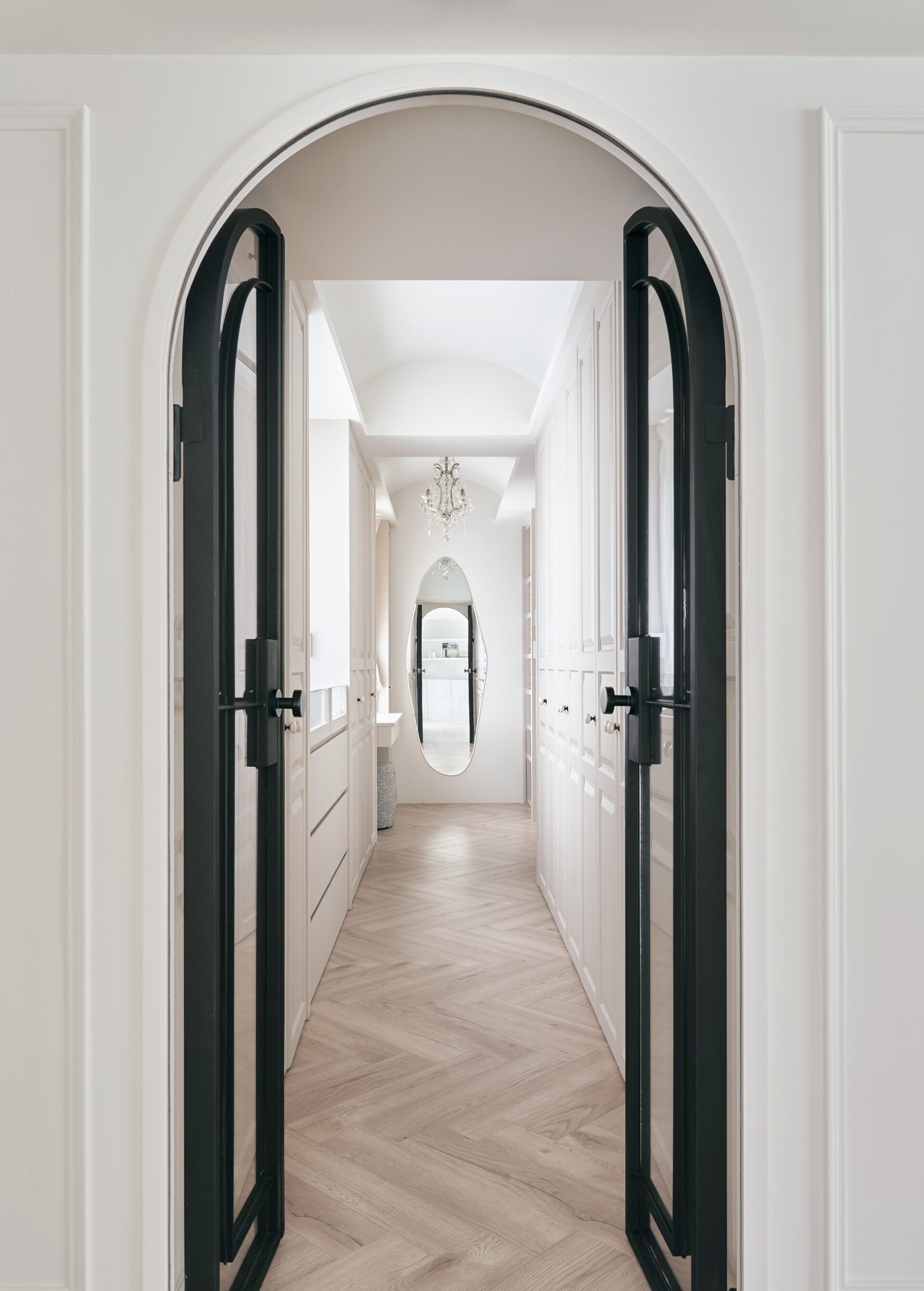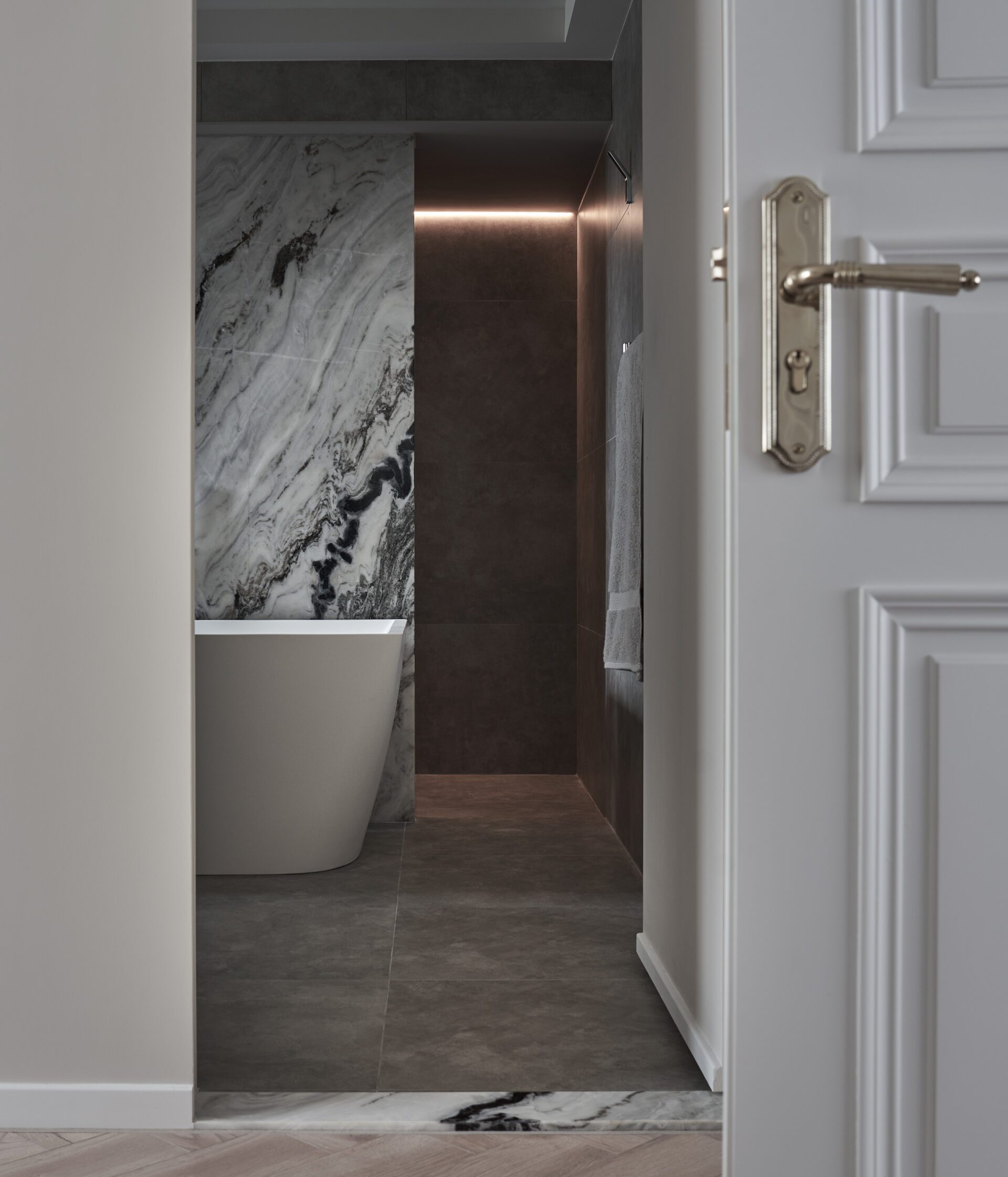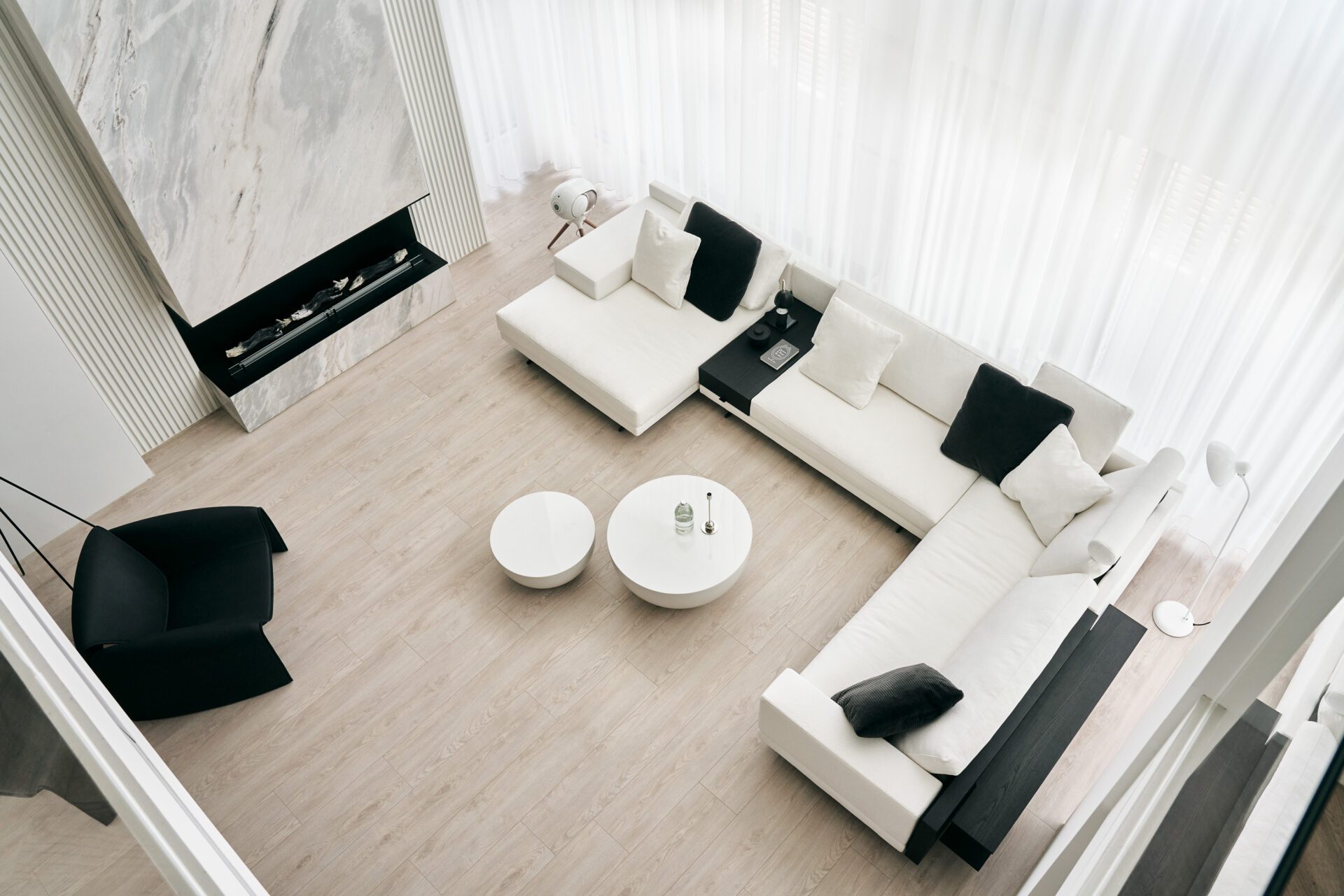 Sitting on a slope in a suburb of Taipei, the penthouse is a sleek and modern two-bedroom home immersed in greenery and boasting views of Taipei downtown. The residential is built with a nearly 7-meter height ceiling and 3 sides of the balcony for sunlight. Throughout the house, floor-to-ceiling windows let natural light pour into the different spaces. The core of the space is the living area, which contains a fireplace covered with blue-ish marble, alongside monotone color, and minimalist nifty furniture to create a soft and quiet ambiance. The kitchen is characterized by walnut wood, and great finished Neolith stone. The huge island is arranged in the middle of the space, with a built-in electric indulging cooker to create a place for gathering and cooking. The featherlight staircase with glass handrail creates a weightless structure, which also gives a huge amount of storage underneath. The staircase leads to the opened study area, where the owner can easily recreate the space for either working, reading, or painting. The upper level features a master bedroom, a walk-in wardrobe, and a bathroom with a comfy bathtub. The interior is inspired by our designer’s and client’s shared fascination for classical and minimalist in Europe. We tried to combine the elements of these two concepts, with symmetrical walls and doors, merging with a neat and minimalist structure.