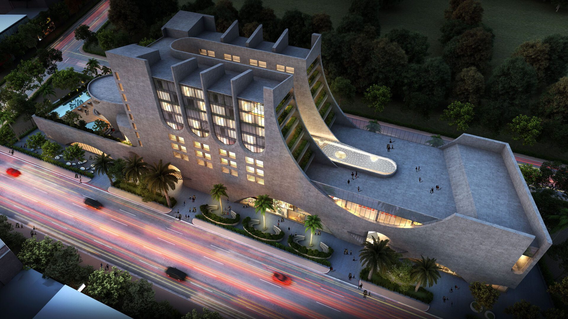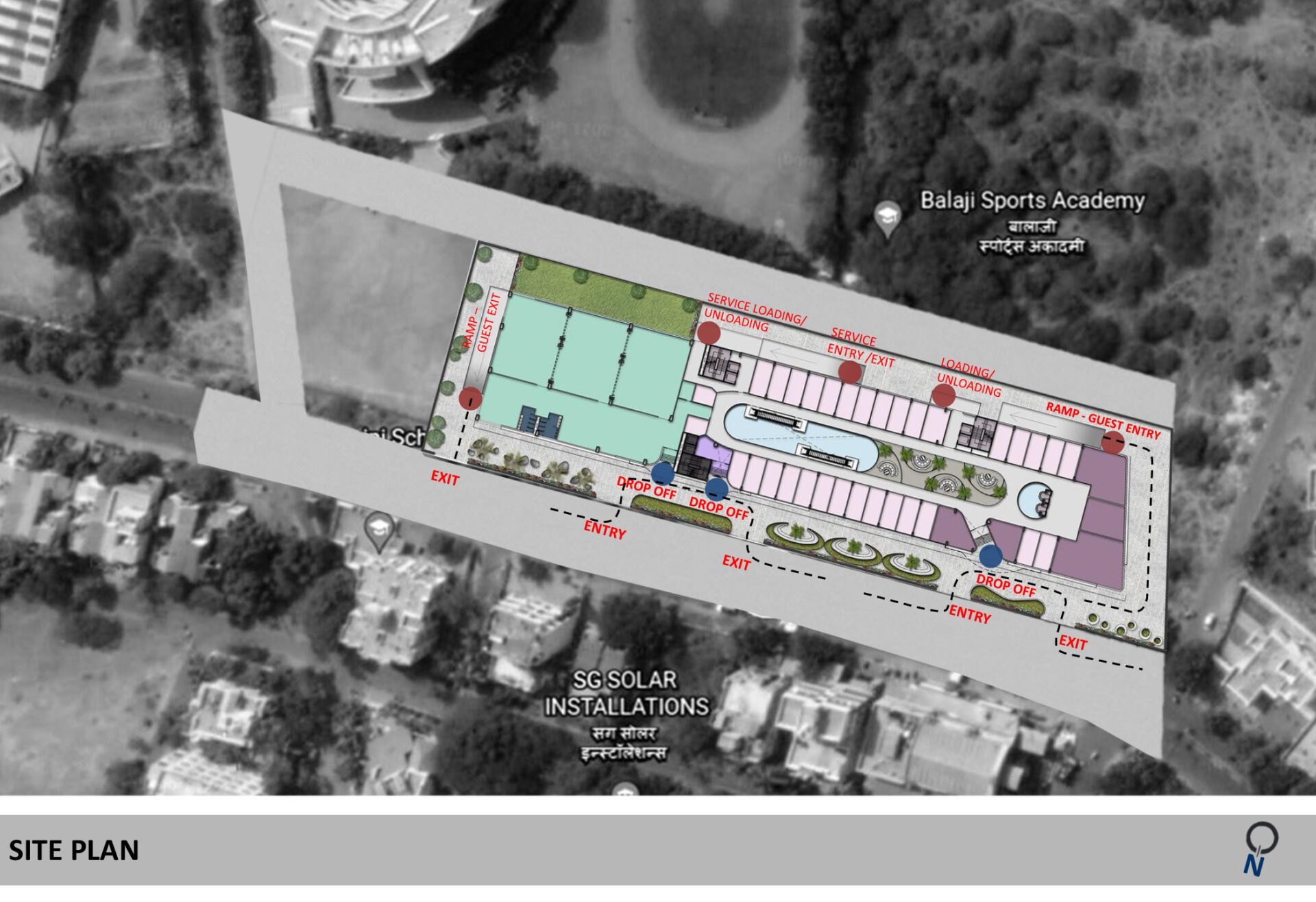 3 separate area entries created on the ground floor considering the requirement of the various activities of each zone. Landscape is designed in front of the mall with specific consideration. Banquet front will have thick plantation to reduce the noise and will be the visual barrier between the road and the mall, for retail plaza seating is created and corner areas are enhanced with small plants. One part of the terrace is provided for the landscape and the solar panels while the other part is utilized with activities like swimming pool, gymnasium etc, for the hotel.