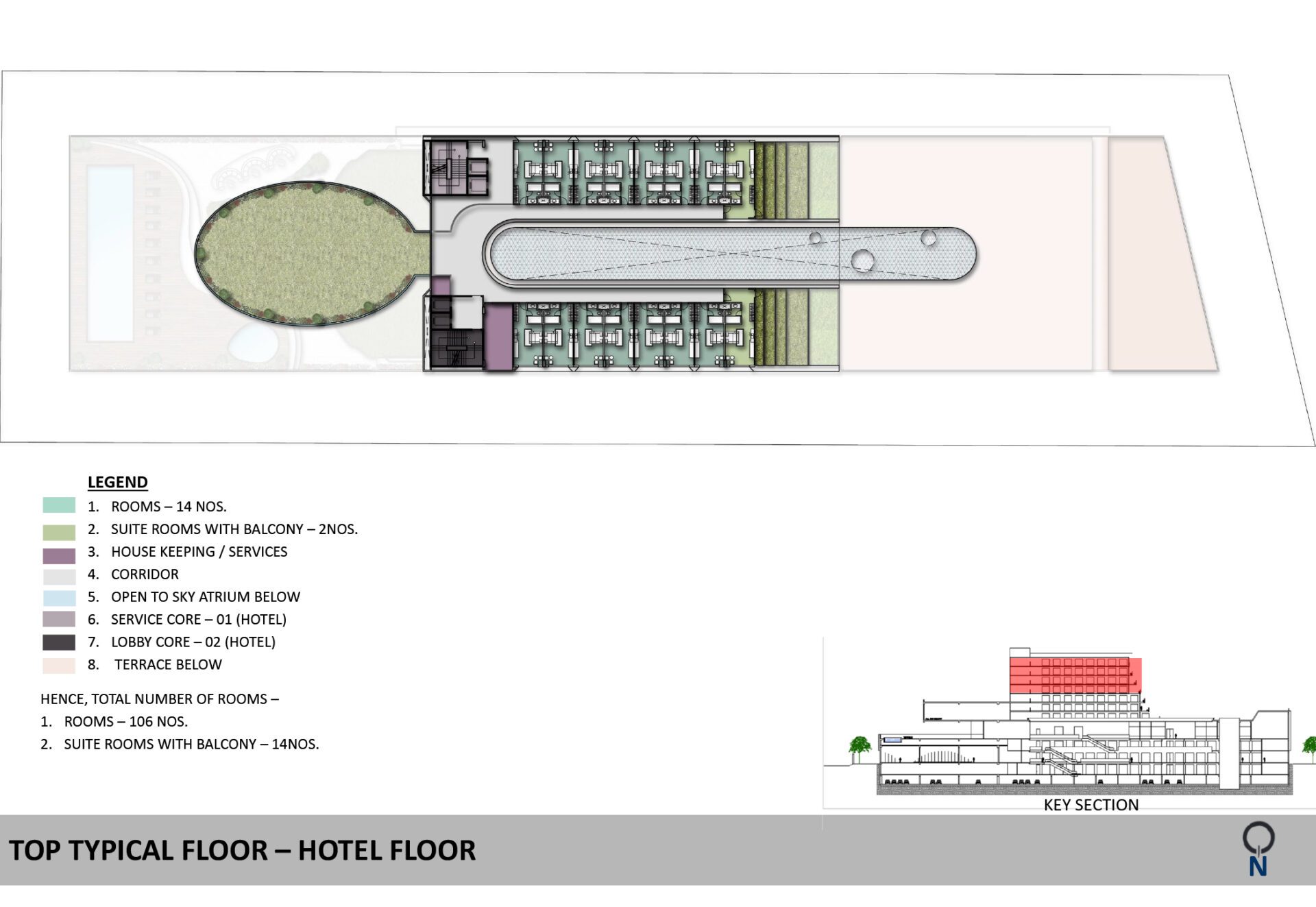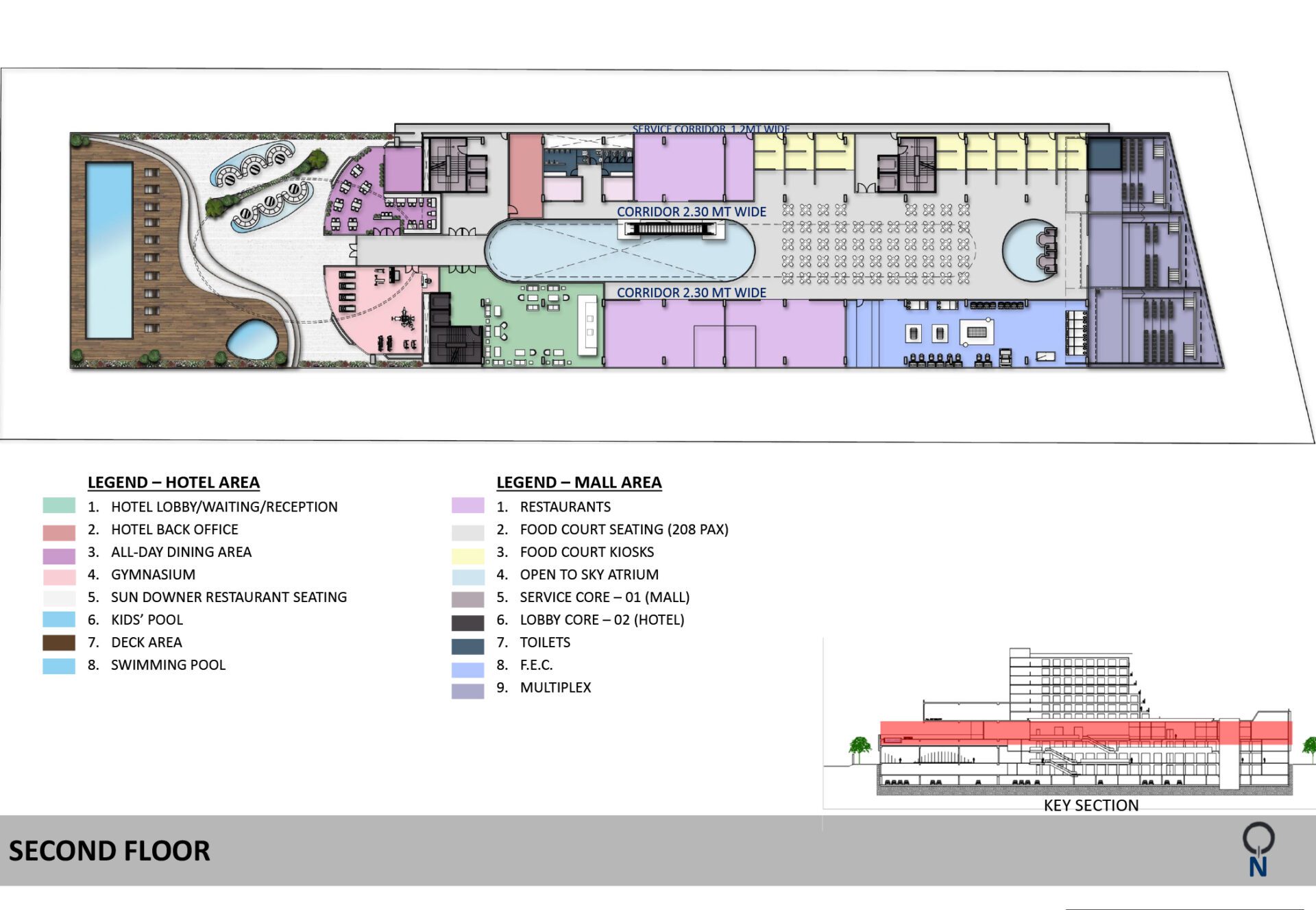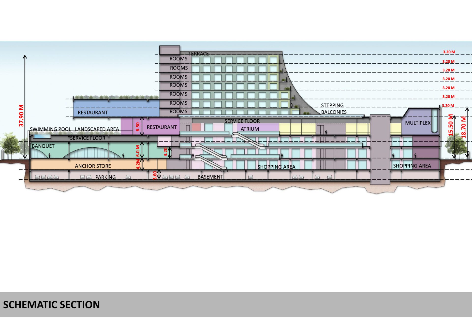Basements are provided for car park and services that needed, first 2 floors are retail, third floor is partly divided into hospitality, food court and cinema entry area while upper floors are for the hotel rooms. Few of the rooms with have balconies have step backs which in turn will get better view of the city.