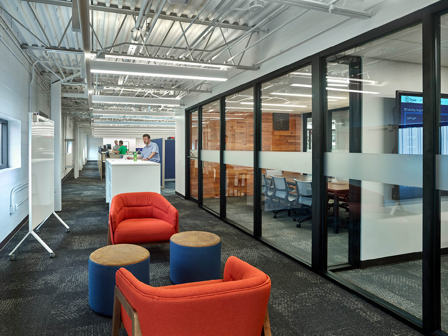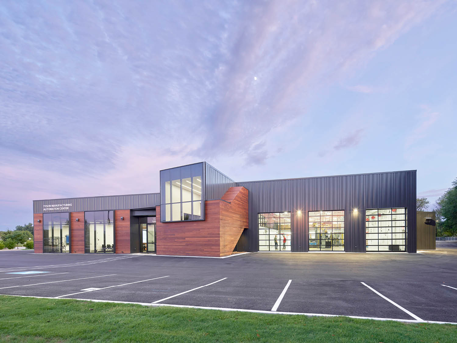 A new 2,000 square foot addition creates a formal entry and moderates the scale of the large existing big box structure. The extruded glass volumes of the addition capture and frame the rhythm of the existing overhead door openings. The materials complement and enhance the visual connection to the Tyson Emma building and Tyson’s growing downtown campus. The exterior of the existing CMU structure is wrapped in a dark insulated metal panel while the addition and infills are accentuated by a warm IPE rainscreen. The massing of the addition pivots at the recessed entry to reorient itself with the context, enlarge the lobby, and frame the view from the second-floor break area.