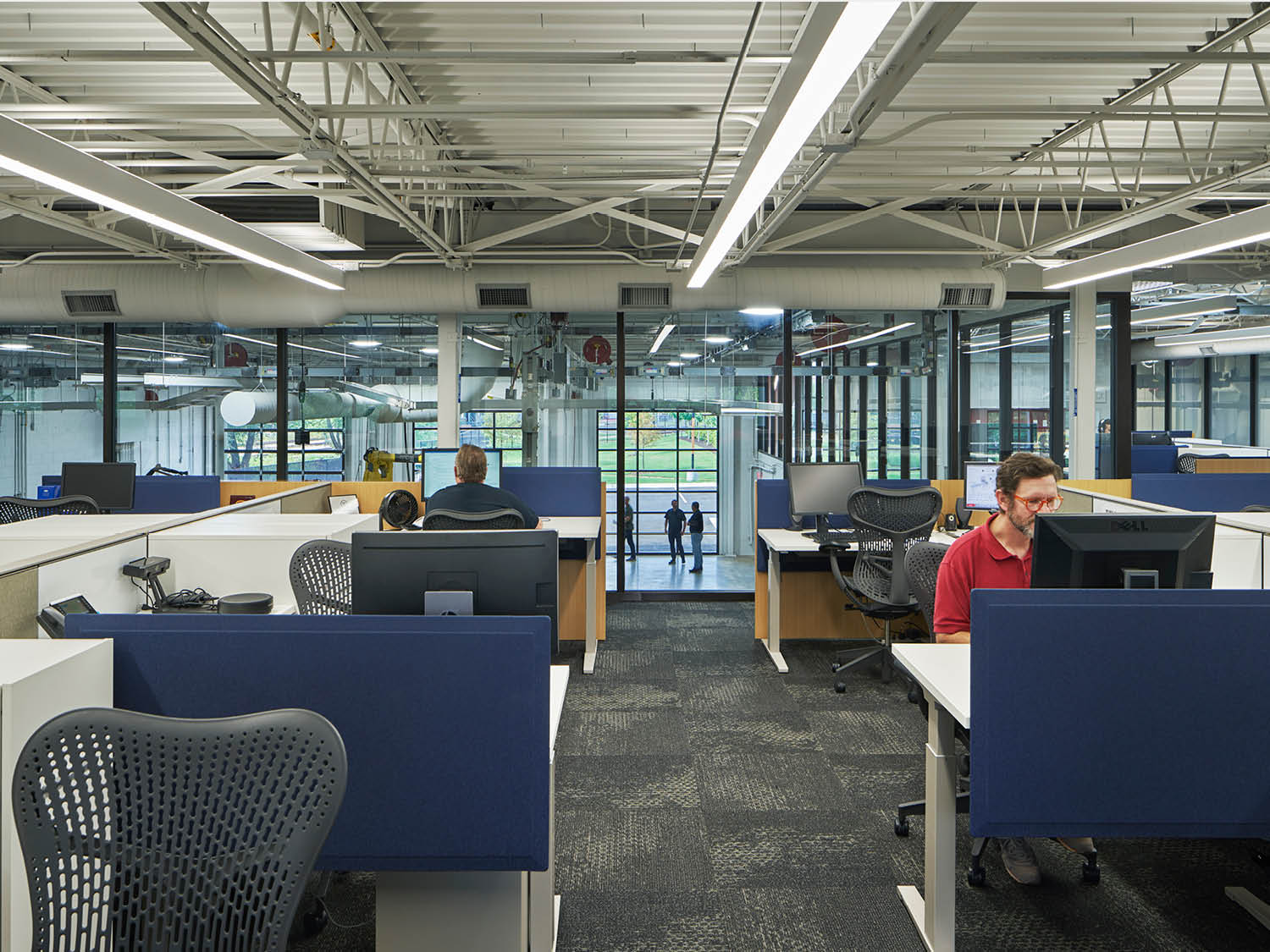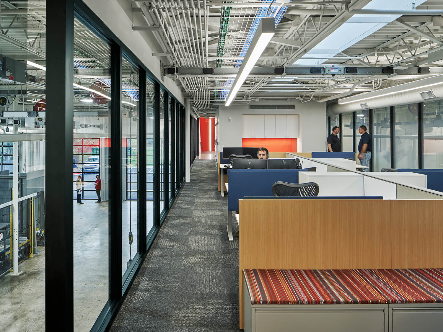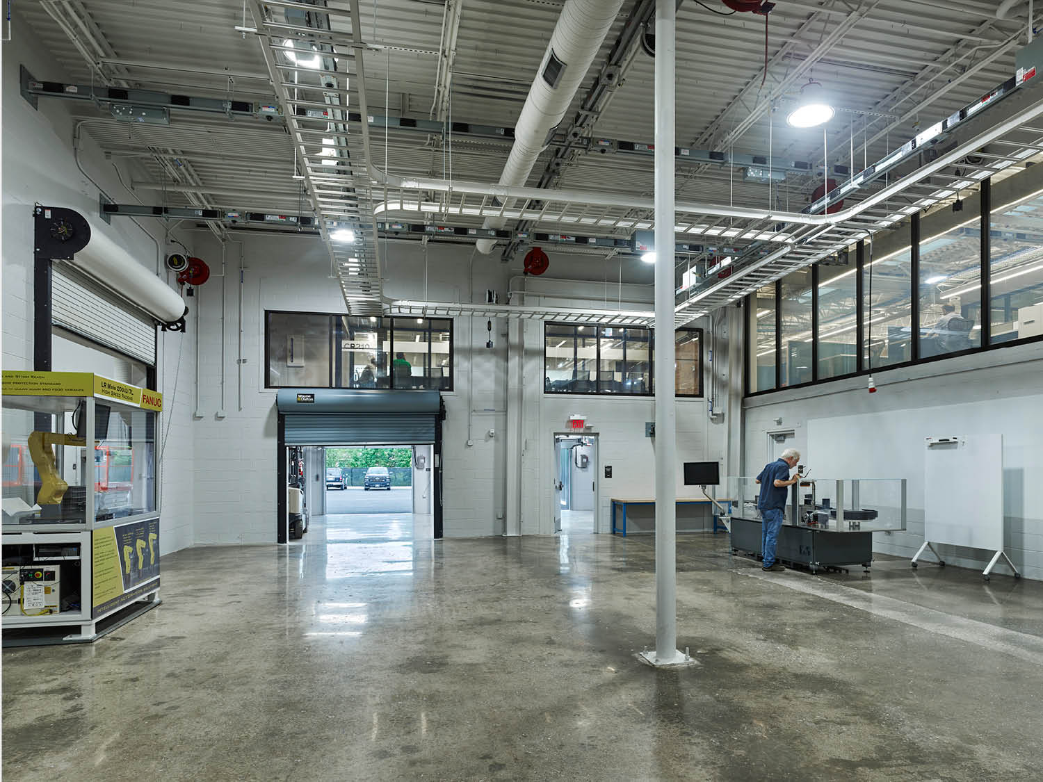 Inside, various research labs have been organized within the existing truck bays. The existing mezzanine which bisects the Systems Assembly and Innovation Lab has been extended laterally along the south wall for additional office space and utilizes windows infilled in the existing overhead door openings on the south elevation. Floor to ceiling switchable privacy glass along the innovation lab allows the mezzanine to function as an observation deck during normal operations, but still gives Tyson the ability to obscure proprietary research from guests and venders as needed.
