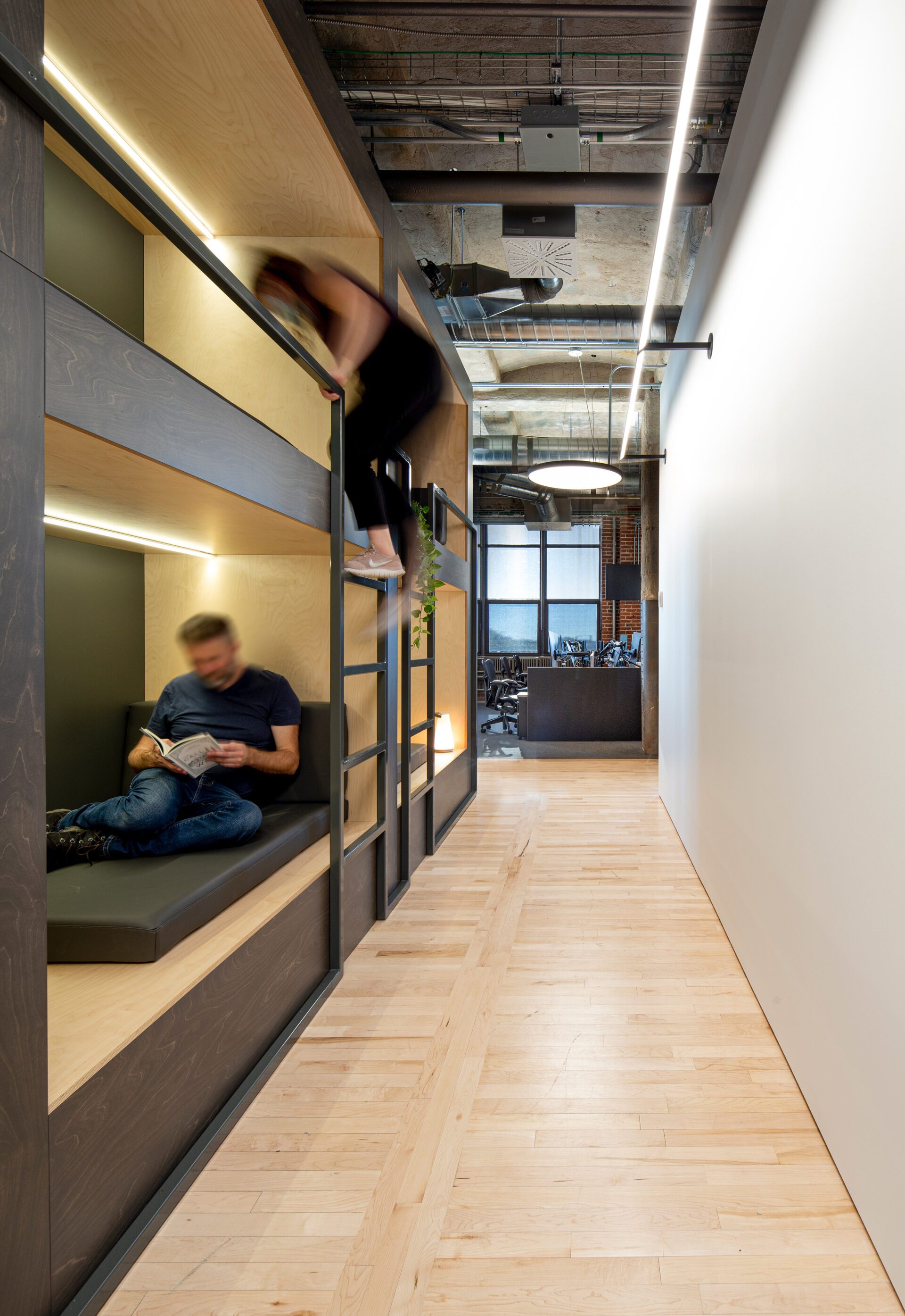 Circulation follows the same logic as Montreal streets and alleys, as primary or secondary traffic routes, and superimposed "rest stations" that refer to the city's duplexes and triplexes and offer employees a space to relax or concentrate away from more active areas. On the top floor, a food court opens up views of the city and provides a large gathering space for public and private events.