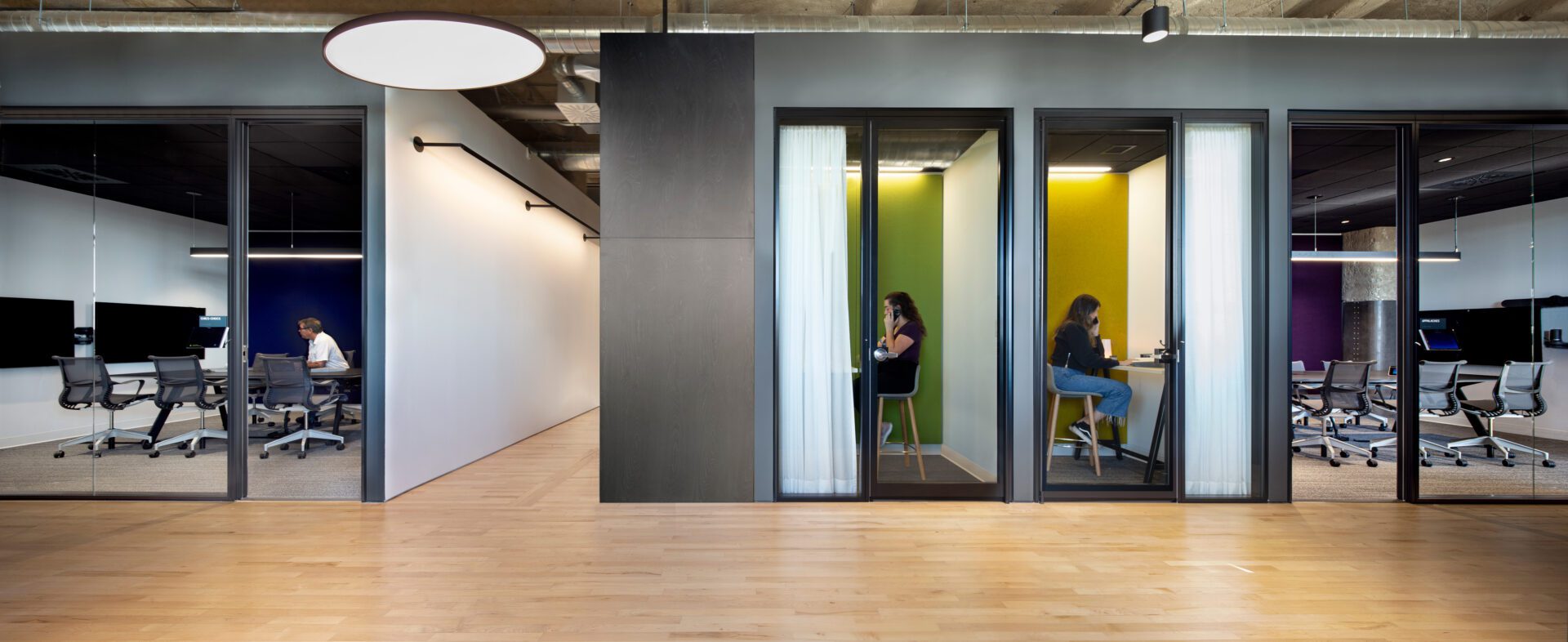 The existing steel and concrete structure is left exposed, complemented by the ample natural light. The surface materials, chosen for their longevity and clean design, combine wood, plywood, ceramic, and quartz, as well as a variety of fabrics, panels, and acoustic ceiling tiles. By deliberately limiting the palette of materials and colors and selecting which pieces of Unity's private collection of artwork are displayed, the design avoids oversaturating the space and allows the art to become the focal point.