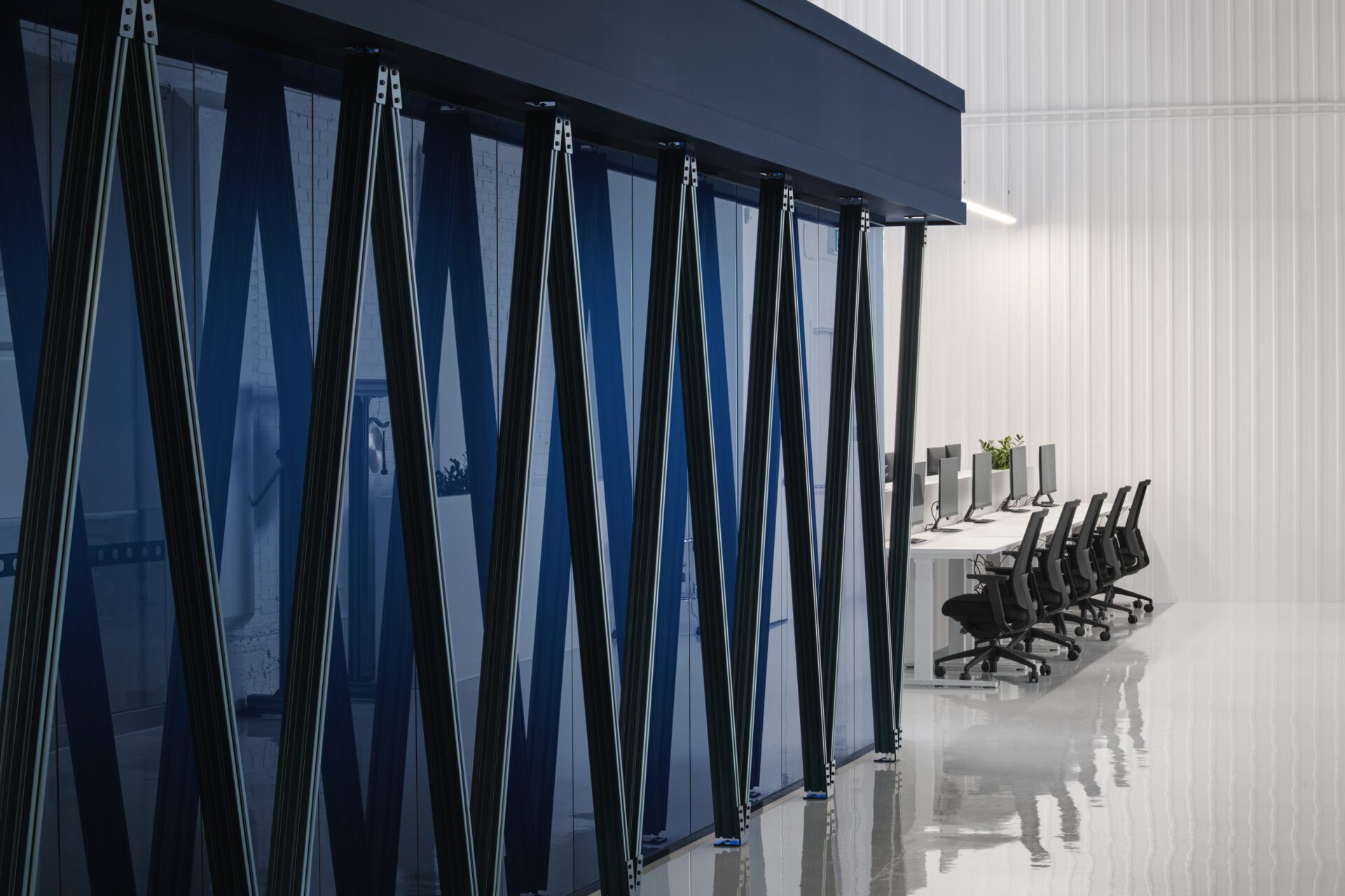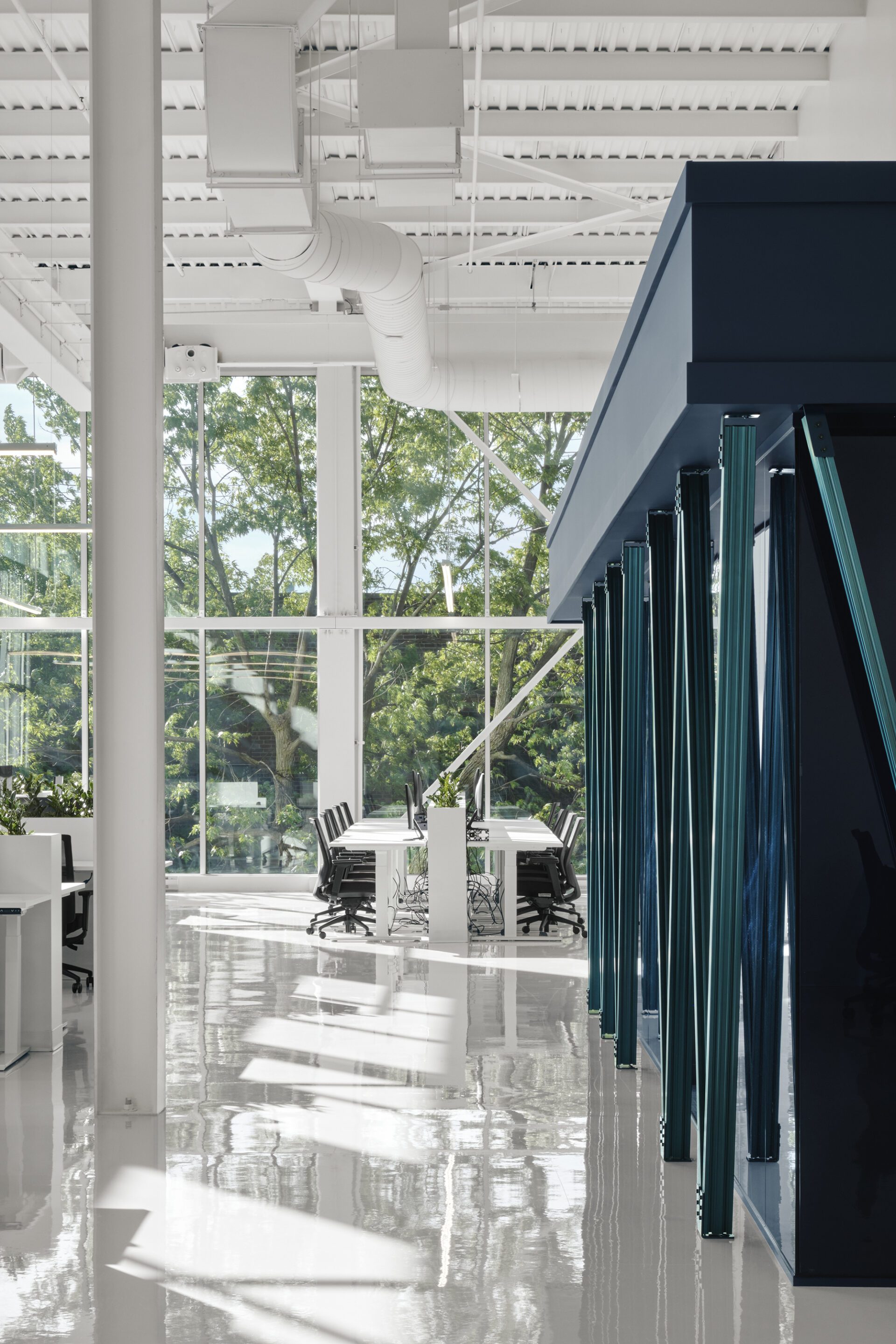 As a nod to their frequent use in robotics and on production lines, structural shapes are used extensively in different sections, creating a look reminiscent of Meccano toys. But their function is not merely symbolic, because these metal structures serve, among other things, to support the cantilevered roof.