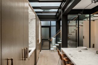 Walkable skylights in an NYC Upper East Side Townhome allows for the home to bring natural light during the day into the kitchen of the lower level in the home, while illuminating the outdoor living space during the evenings. The walkable skylight on the third level lights up the stairway with natural ambient light during the day and illuminates the rooftop space in the evening.