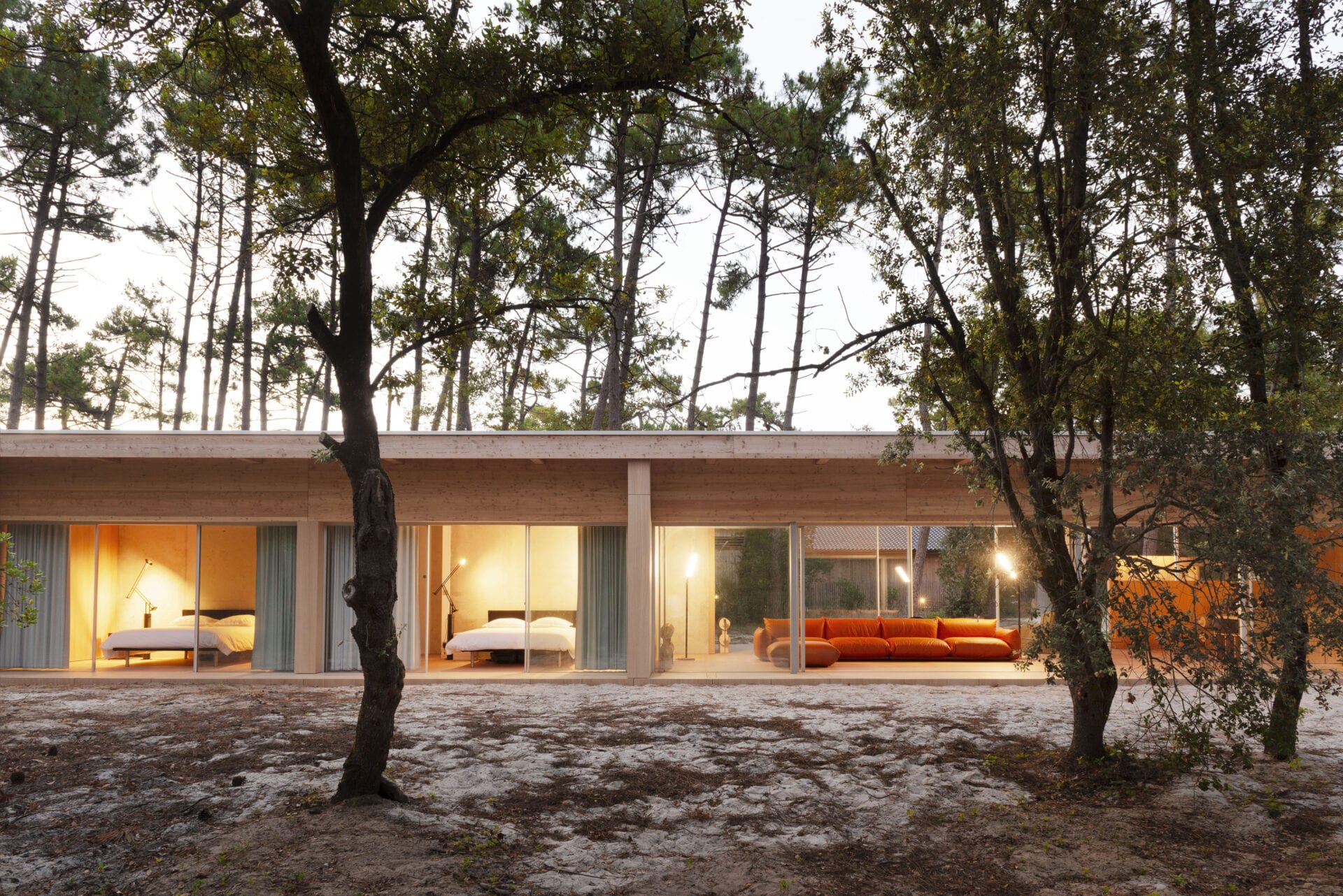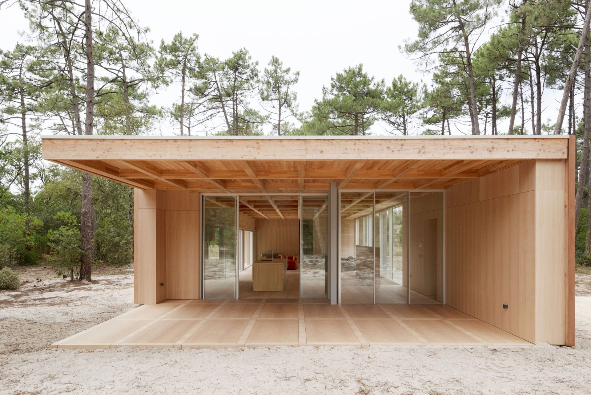 “A space to live and move within the pine forest”. The wooden villa is a see-through heaven inviting the beauty of its surrounding environment inside. A seamless wonder built with unique expertise of the best wood engineers. The floor and the ceiling mirrors each other’s dimensions, breaking down all notions of hierarchy. The Eyesight glides between pine trees and interior perspectives, feet wander with ease from the warm sand - outside onto the softness the okoume wood flooring - indoors. “To enter the pine forest is to enter the house ». (The site itself is integrated to the architecture). The house is built where the air flows. The pine and oak trees provide shelter from strong winds. The ocean, though not visible, is so close that the sound of surfers rhythm the day. Nature runs through the bedrooms and the living room. In order to redefine the threshold, we haven’ t created a traditional front entrance. To enter the house, you stride right into the 130m2 living space or into one of the 5 rooms sitting on the 4000m2 pine forest. The roof is made out of 136 larch caissons, a matching floor with this time 136 okoume wood panels, all in a perfect aligned symmetry … an architectural sandwich. A scaffolding warehouse had to be installed on-site to shelter the construction, the level of precision required to build the roof did not allow any humidity. The larch has been sanded down to acquire a refined finish usually reserved to furniture. There are no screws and no apparent nails. The use of shadow joints offers a unique sense of fluidity both inside and outside of the house. If the standard height for sliding glass doors is 2,20m, here they reach beyond 3 meters high. The shadows of the pine forest, projected onto the interior wooden surfaces, accompany the inhabitants with different degrees of intensity all throughout the day. The bedrooms and living room make the most of all four cardinal directions, north, east, south and west. Two thirds of the house is built using glass walls that are too light to hold down the roof in heavy weather. We have been forced to weigh it down with metal and to anchor the house with cement walls. We have pushed wood and glass to their limits, in such a way that they reveal their strengths and weaknesses. The house is a member of the family in the Japanese sense, a member that must be taken care of.