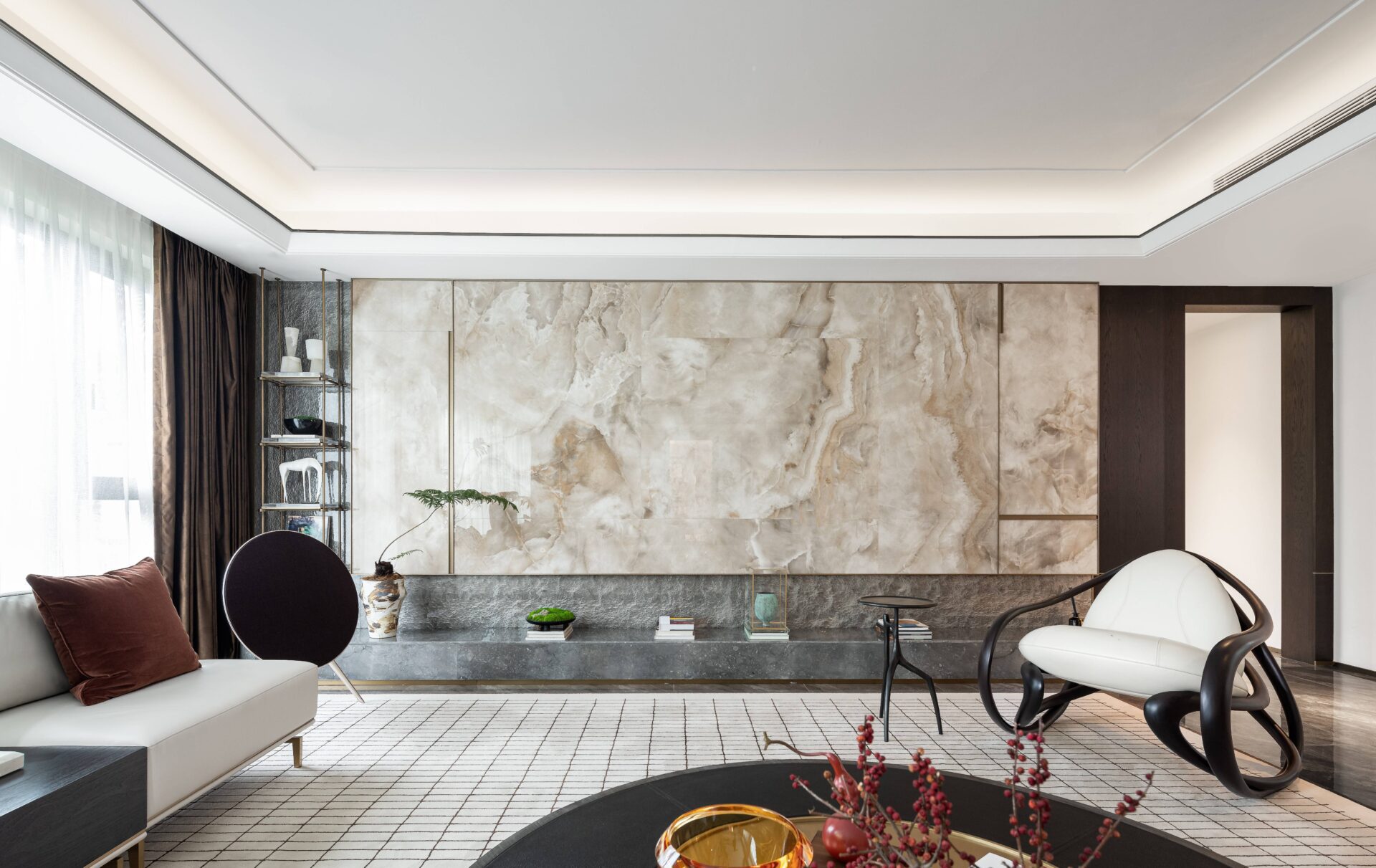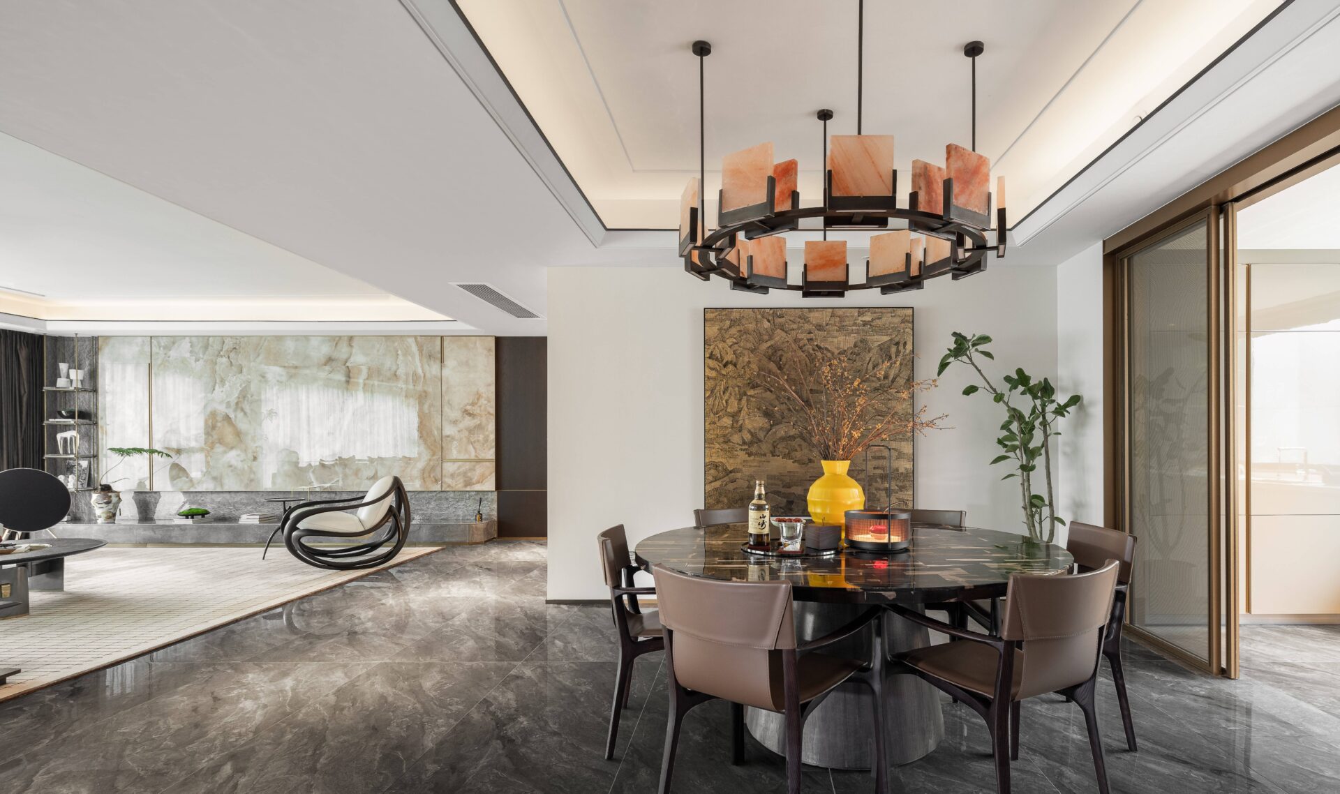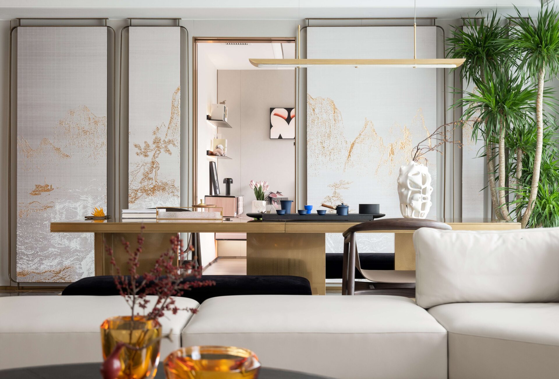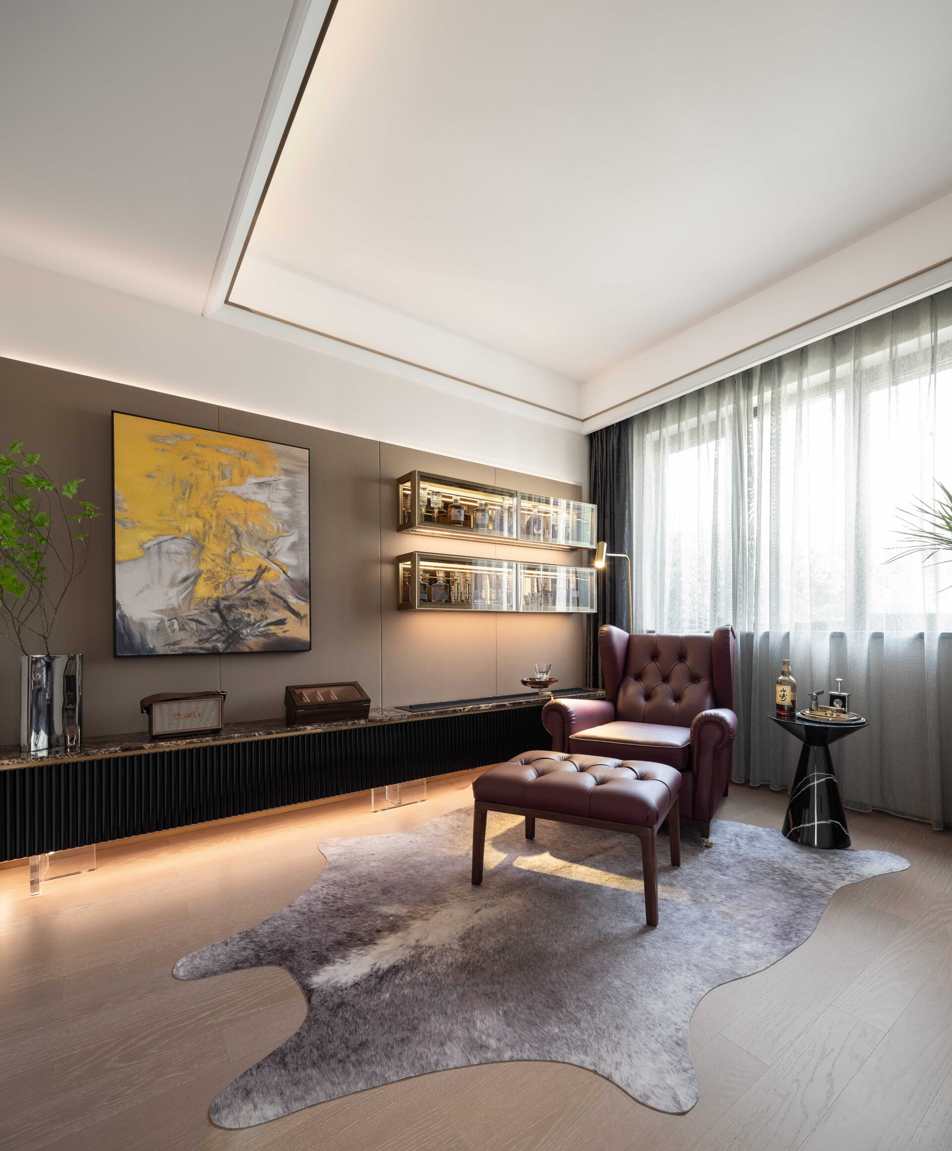 In the interior design of the Yun Park project, the designer focused on creating an elegant and uncompromising quality of space. Whether it was the artistic expression of the furniture or the unique selection of accessories, all of which were an expression of the care for the homeowner's experience and Italian aesthetic style. As Mary Crouse said, 'Art is not on the wall, but is deeply rooted in your perception.' The large area of gray and white tone with an open layout, while rendering the overall mood of space without losing calm and restraint, creates a modern urban area with luxury quality and contemporary spirit. The yellow color accents create a pleasant and energetic space atmosphere, giving positive emotional feedback. Leather, metal, and wood materials achieve aesthetic unity in dynamic balance and convey a harmonious visual effect. The designer team also introduces the element of ink and oriental as the background wall, poetic and elegant design language, constructing an architectural system that intertwines and integrates classic oriental aesthetics with modern and supreme craftsmanship.
