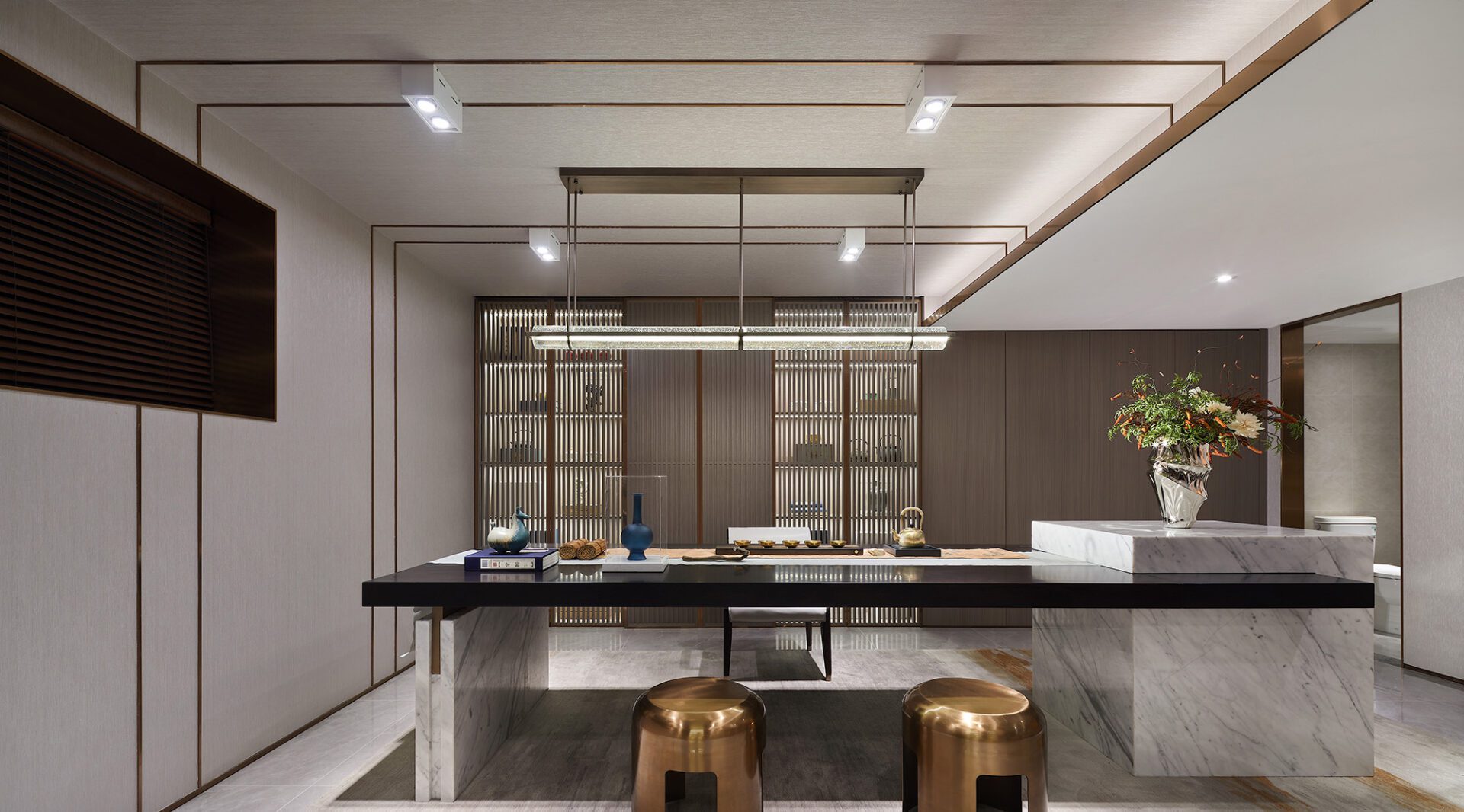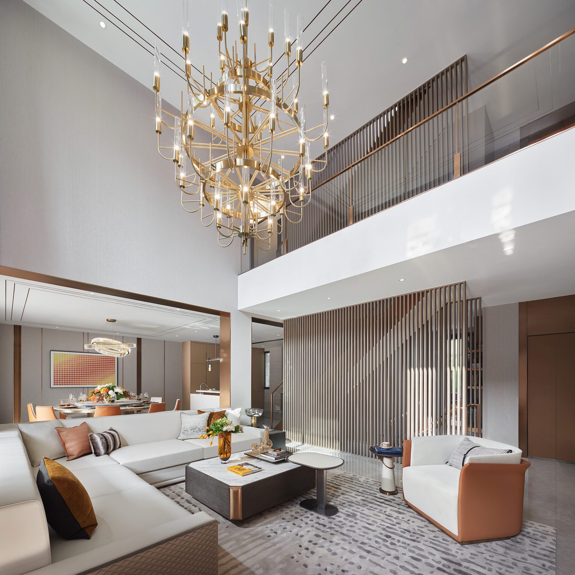 While respecting the external landscape, the designer has explored the inherent beauty of the building. With a raised ceiling of 5.75m high and large floor-to-ceiling windows in its living room, the noble spaciousness and comfort are self-evident. From the sense of extension, to lighting, textures, and form transition, all details are elaborately and sophisticatedly designed.