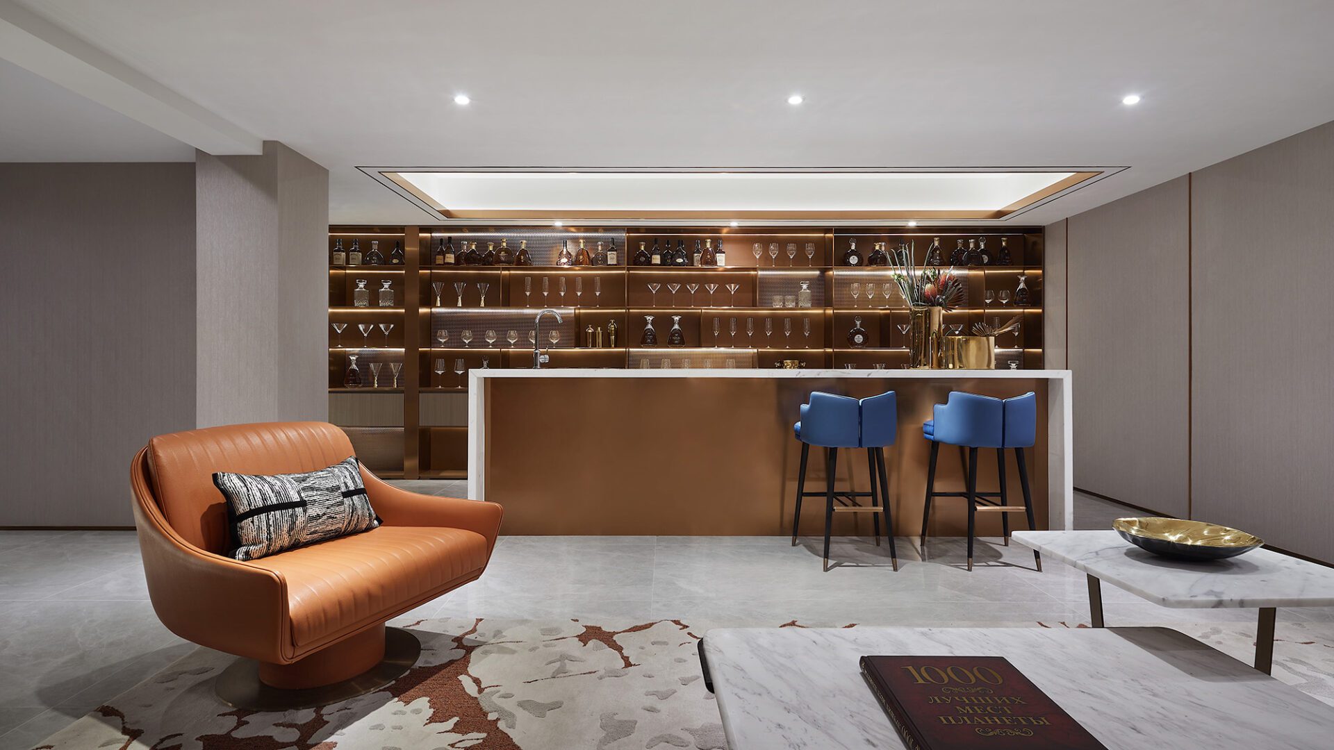 The combination of materials such as leather, marble, metal, wood veneer, as well as the matching of lighting and furnishings, brings a unique style and a sense of quality. In terms of color, the high-grade gray is the main color, and the jumpy Hermes orange is used as the color embellishment, strengthening the spatial level and enriching the interest. Low-key luxury and sensibility are permeated into it, thus making the space have a transition of different rhythms.