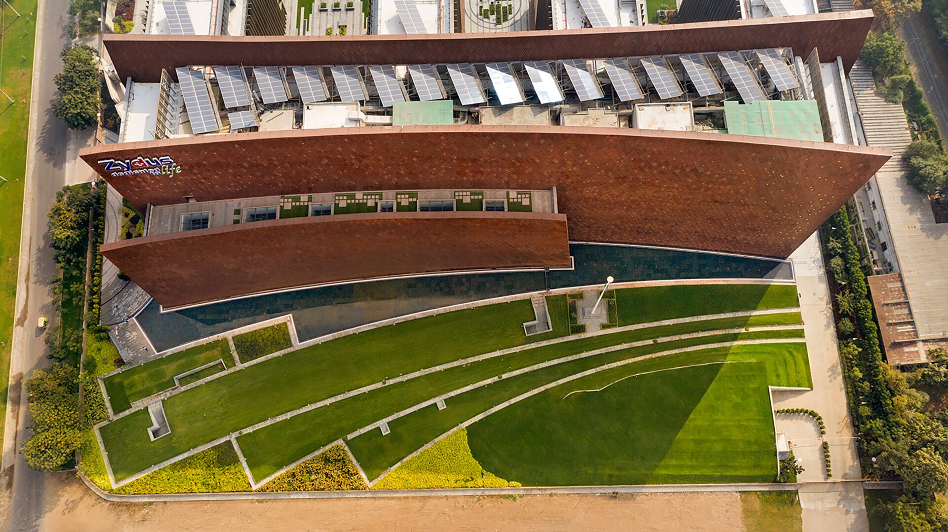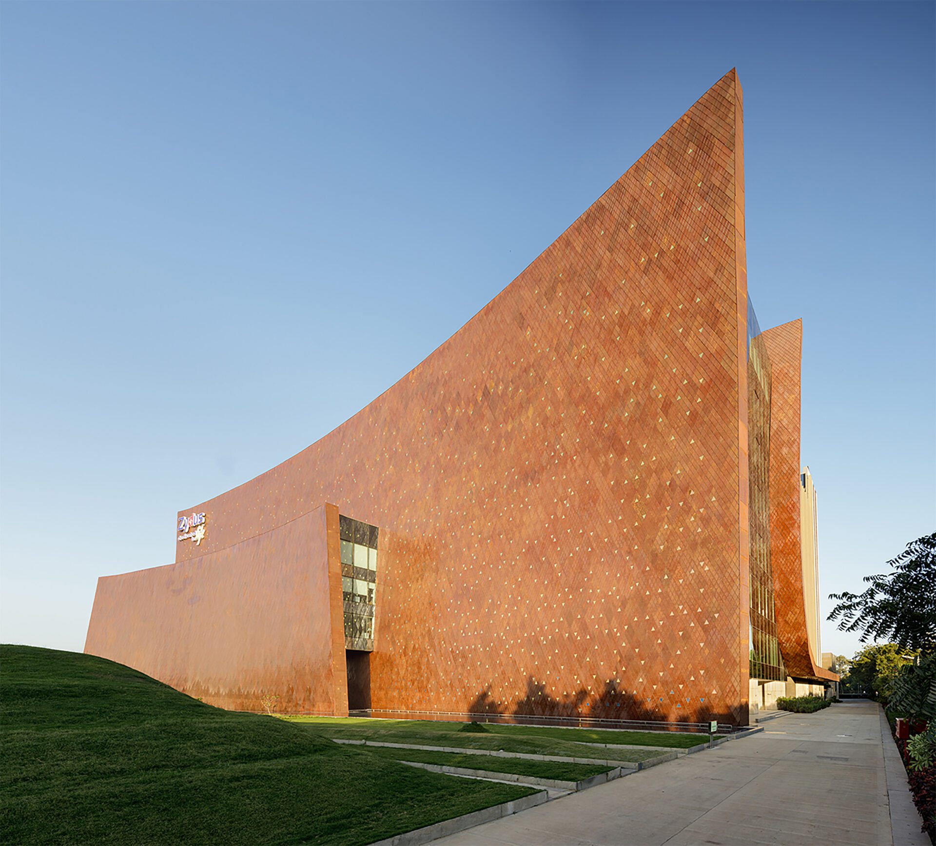 The headquarters of pharmaceutical group Zydus is located in Ahmedabad, which has an extreme hot and arid climate (max 120°F). This building amalgamates technology and tradition to redefine global sustainability benchmarks. It is deeply rooted in the rich architectural heritage and crafts tradition of the local communities. The design takes cognizance of the fact that is situated in an UNESCO world heritage city that has simultaneously been a patron to Modern architecture and architects like Charles Correa, B. V. Doshi, Le Corbusier and Louis Kahn amongst other Modern Masters who have created noteworthy architecture here.