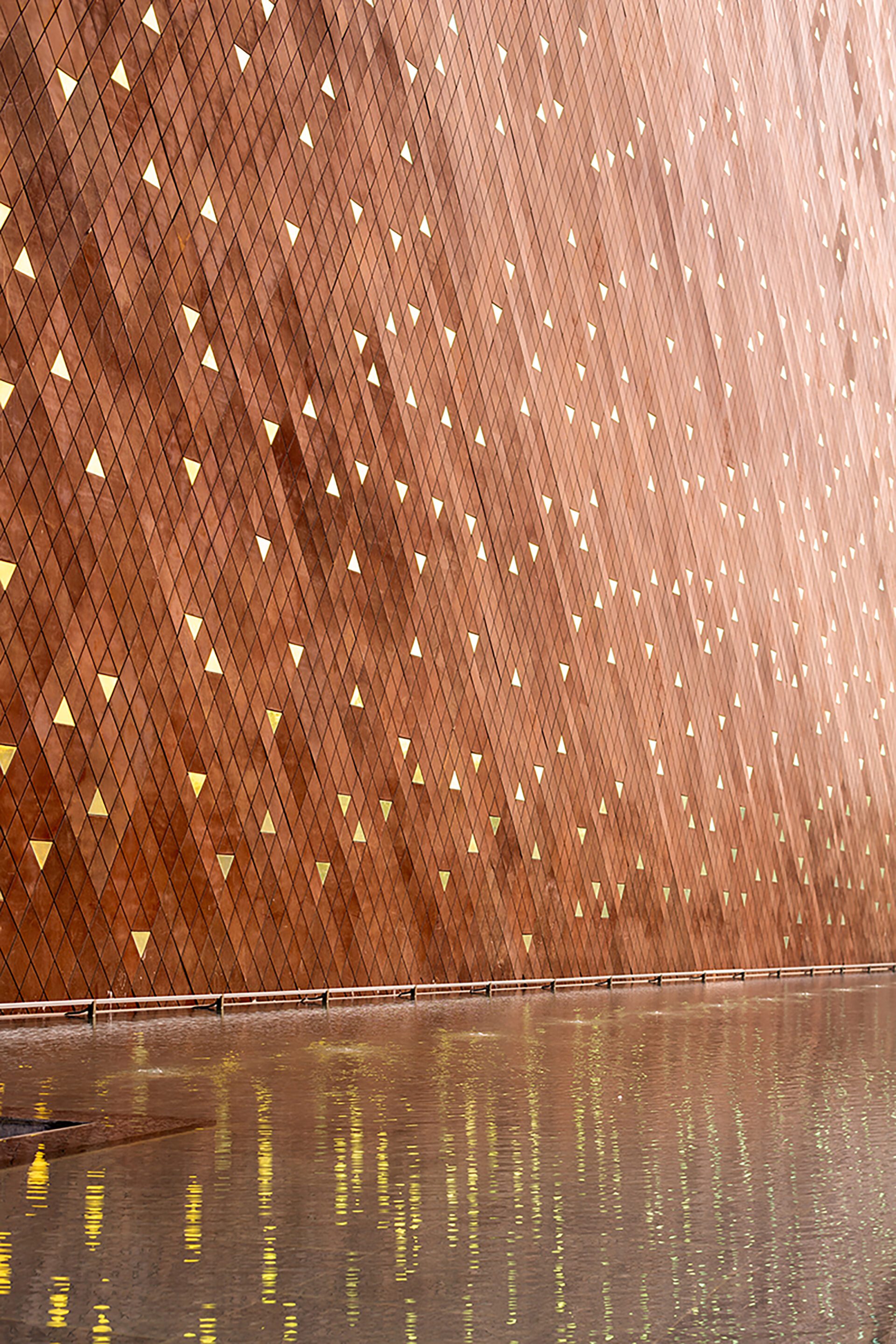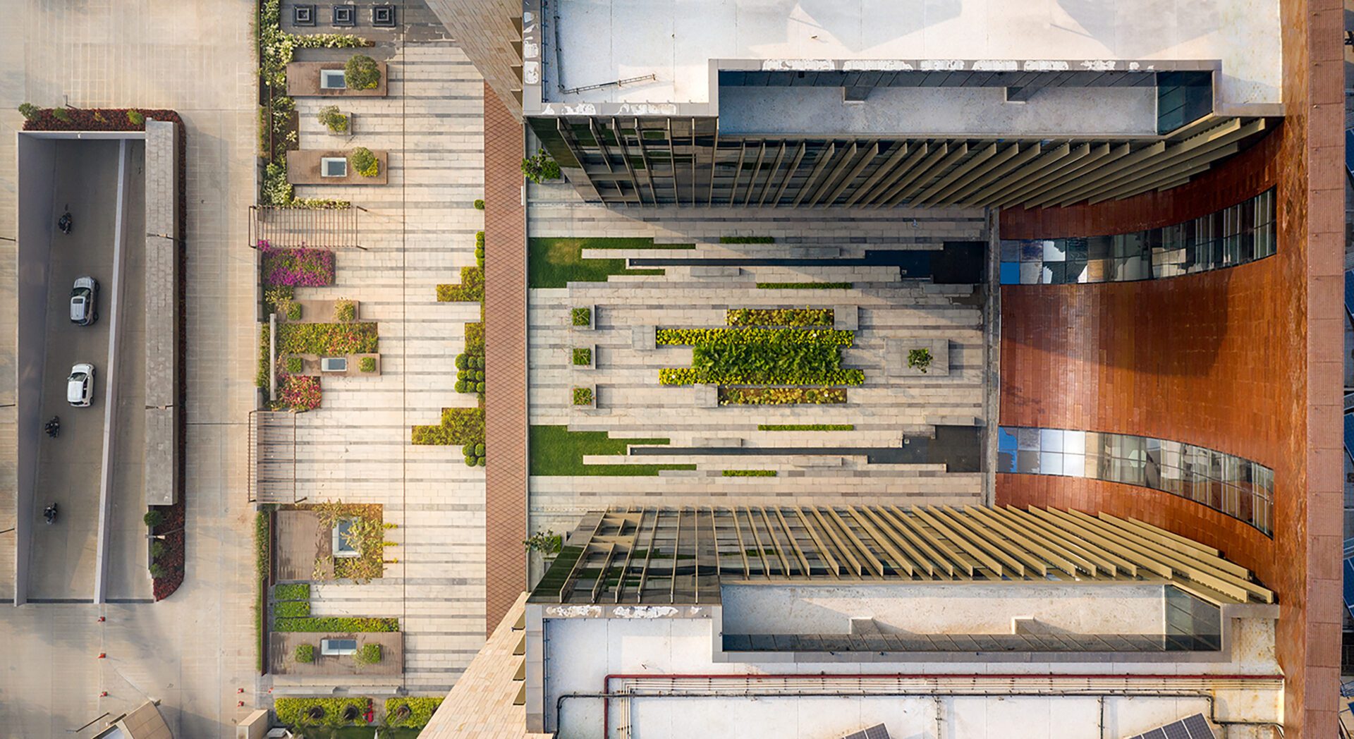 This region is replete with contextual references such as the mediaeval Bhadra and Pavagadh Fort, stepped courts of Adalaj and the iconic ‘Bhunga’ architecture of Kutch. Three large rampart-like walls form the western façade and shield occupants from the harsh temperatures of the highway (145°F). This microclimate screen is traditionally inspired in its conception and executed with contemporary bespoke detailing. These complex, curved steel surfaces refer to the tradition of metal work of the ‘Kansaras’ (vessel makers) that are age old masters of complex geometries. These were scaled up using computational programming. Corten steel is the primary material and the triangulated glass modules inserted within the walls are inspired by the mirrorwork of ‘Bhunga,’ Kutch structures that are architectural ornamentation and identity elements. These glass tubes have a dichroic finish that catches the sun's movement through the day & year, rendering the façade with perpetual dynamism.