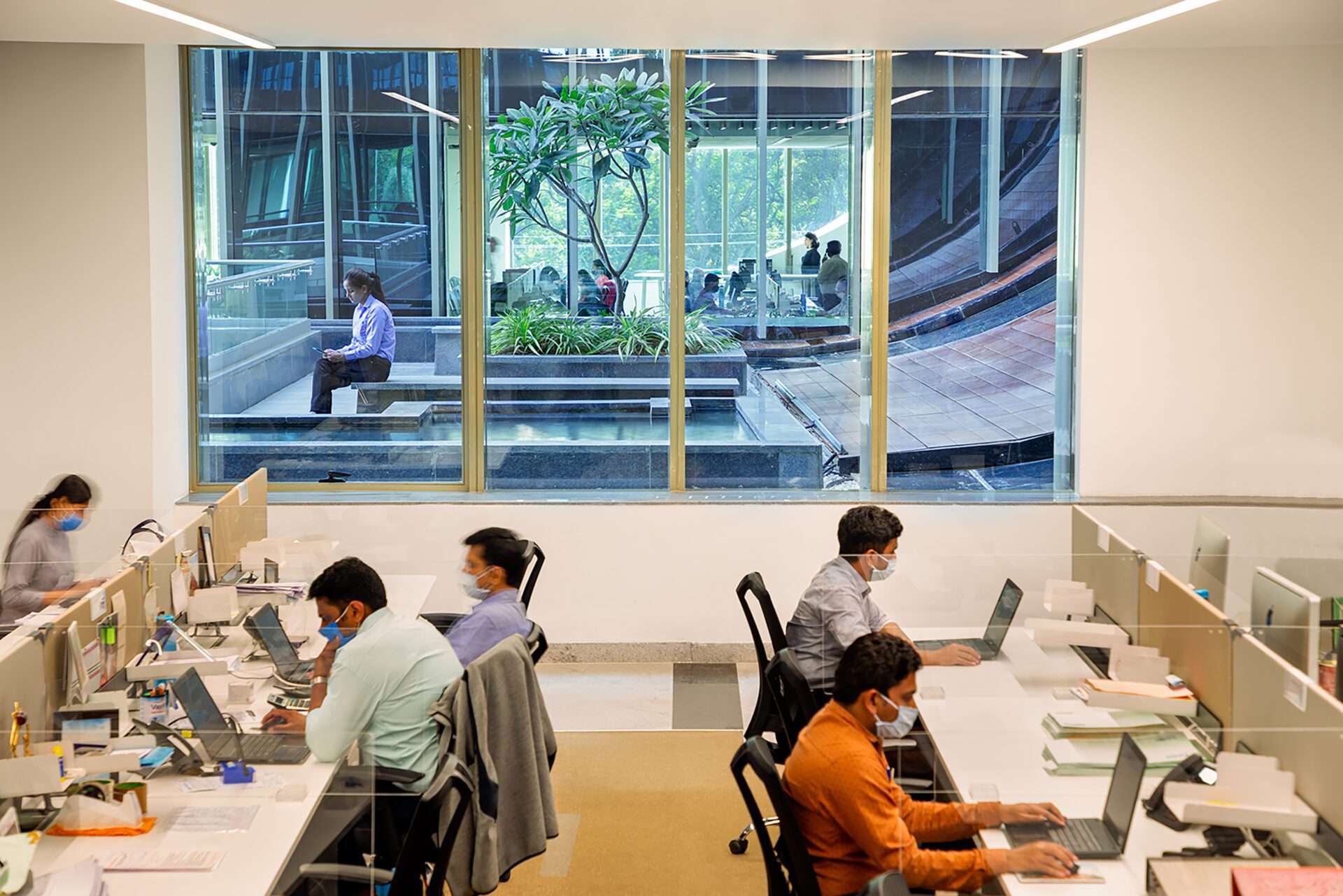 The design doesn't just focus on the interior but also incorporates the surrounding landscape. Circulation spaces in between the walls run from East to West, where all human engagement is concentrated. It consists of breakout spaces, alcove seating, bistros, employee engagement activity areas, setup for brainstorming and informal meetings. This spine connects all the formal work areas in a vertebral configuration. In today’s context, this zone also doubles up as a social distancing space to spread out the workforce.